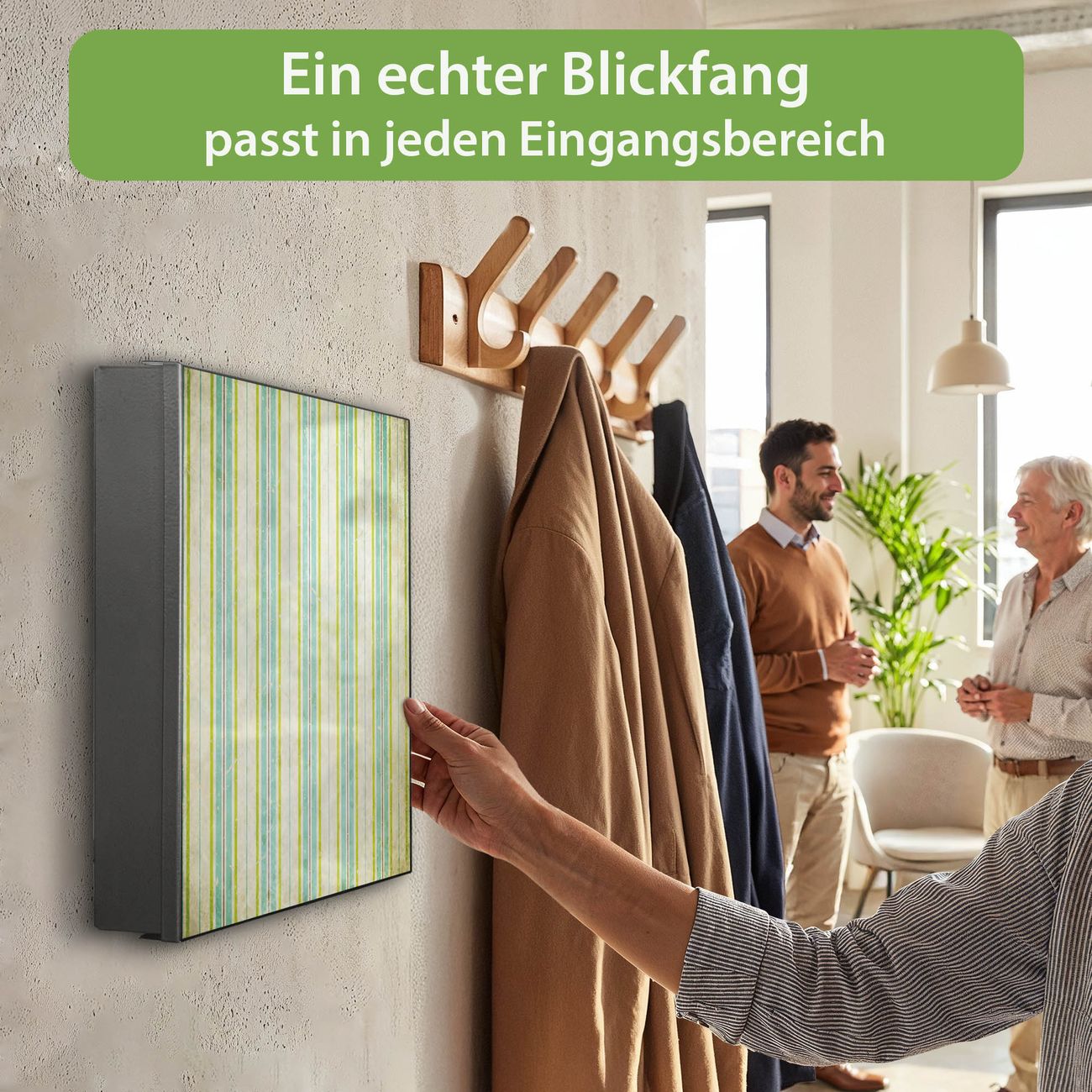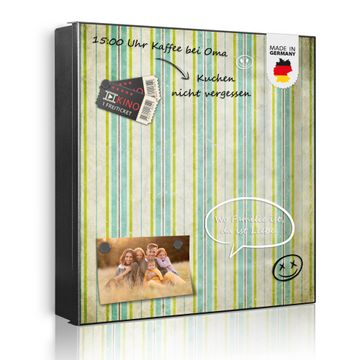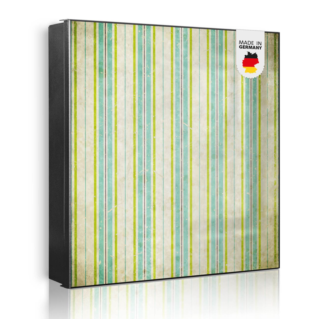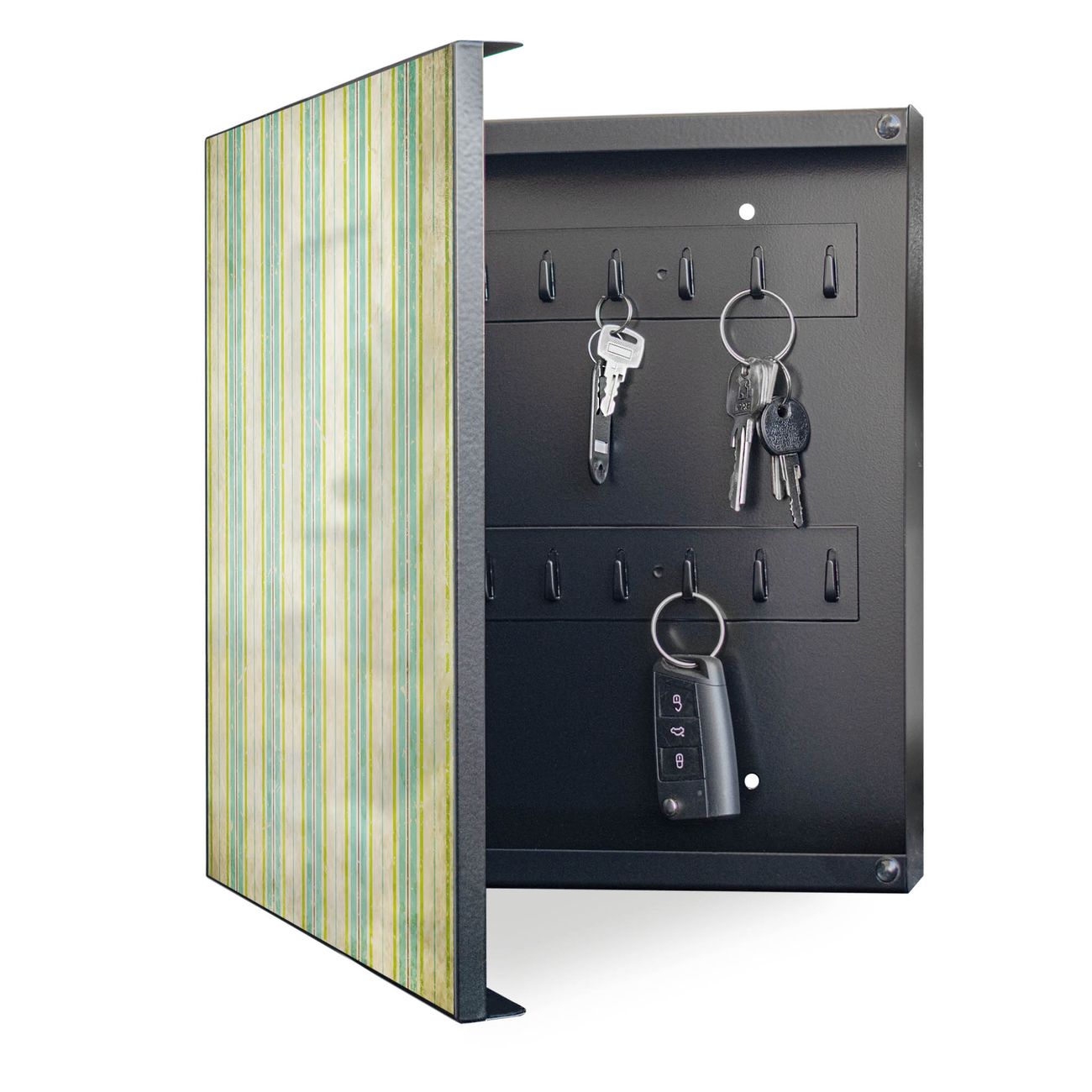 Bringe Ordnung und Eleganz in deinen Eingangsbereich mit dem banjado Schlüsselkasten Motiv Motiv Vintage Streifenmuster. Die moderne Schlüsselbox kombiniert funktionales Design mit hochwertiger Verarbeitung und wird so zu einem echten Hingucker in Flur, Büro oder Ferienwohnung. ✅ Stilvolle Schlüsselaufbewahrung mit Motiv Motiv Vintage Streifenmuster Der Design-Schlüsselkasten Motiv Motiv Vintage Streifenmuster bietet Platz für bis zu 32 Schlüssel, die auf 4 stabilen Reihen mit je 8 Haken übersichtlich verstaut werden. Mit seinen kompakten Maßen von 30 x 30 x 5 cm passt die Schlüsselbox perfekt auch in kleinere Räume. Der schwarz lackierte Stahlkorpus mit links angeschlagenem Türscharnier harmoniert mit gedruckten Folie auf der Front und fügt sich nahtlos in jedes Wohnambiente ein. Ob als Schlüsselorganizer für Zuhause oder als praktische Lösung für Büros, Praxen und Gewerbe, der banjado Schlüsselkasten sorgt für Ordnung und Übersicht. Dank der magnetischen, mit Kreidestiften beschreibbaren Folie auf der Front kannst du Notizen anheften oder Termine direkt auf der Oberfläche festhalten. Die Schlüsselbox Motiv Motiv Vintage Streifenmuster zur Wandmontage wird inklusive Befestigungsmaterial geliefert und ist schnell angebracht. So hast du deine Schlüssel jederzeit griffbereit und zugleich stilvoll verstaut. Mit diesem banjado Schlüsselkasten Motiv Motiv Vintage Streifenmuster kombinierst du praktische Aufbewahrung mit stilvollem Wohndesign. Ob privat oder geschäftlich, die Schlüsselbox sorgt für mehr Ordnung, Übersicht und ein wohnliches Ambiente.Vorteile im Überblick