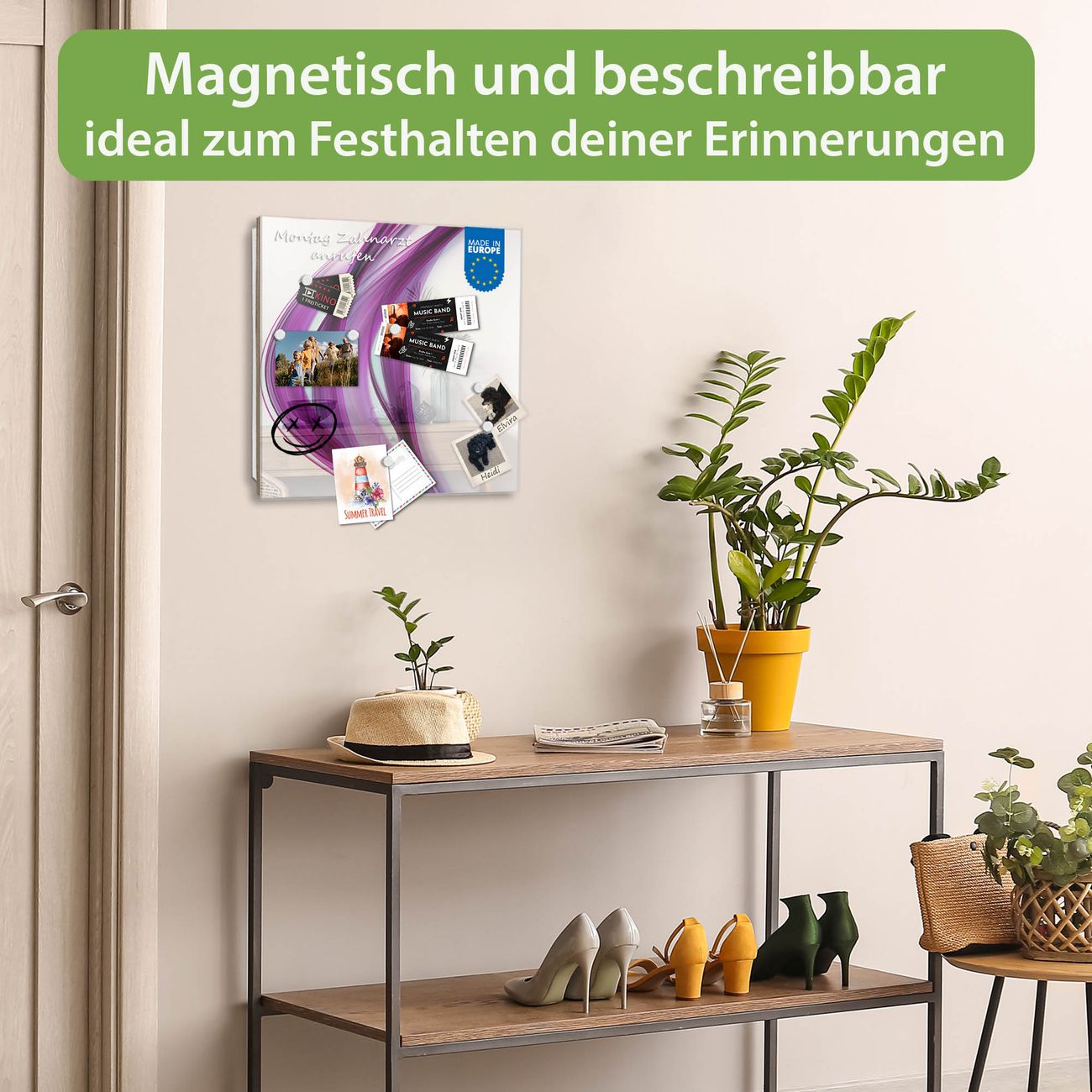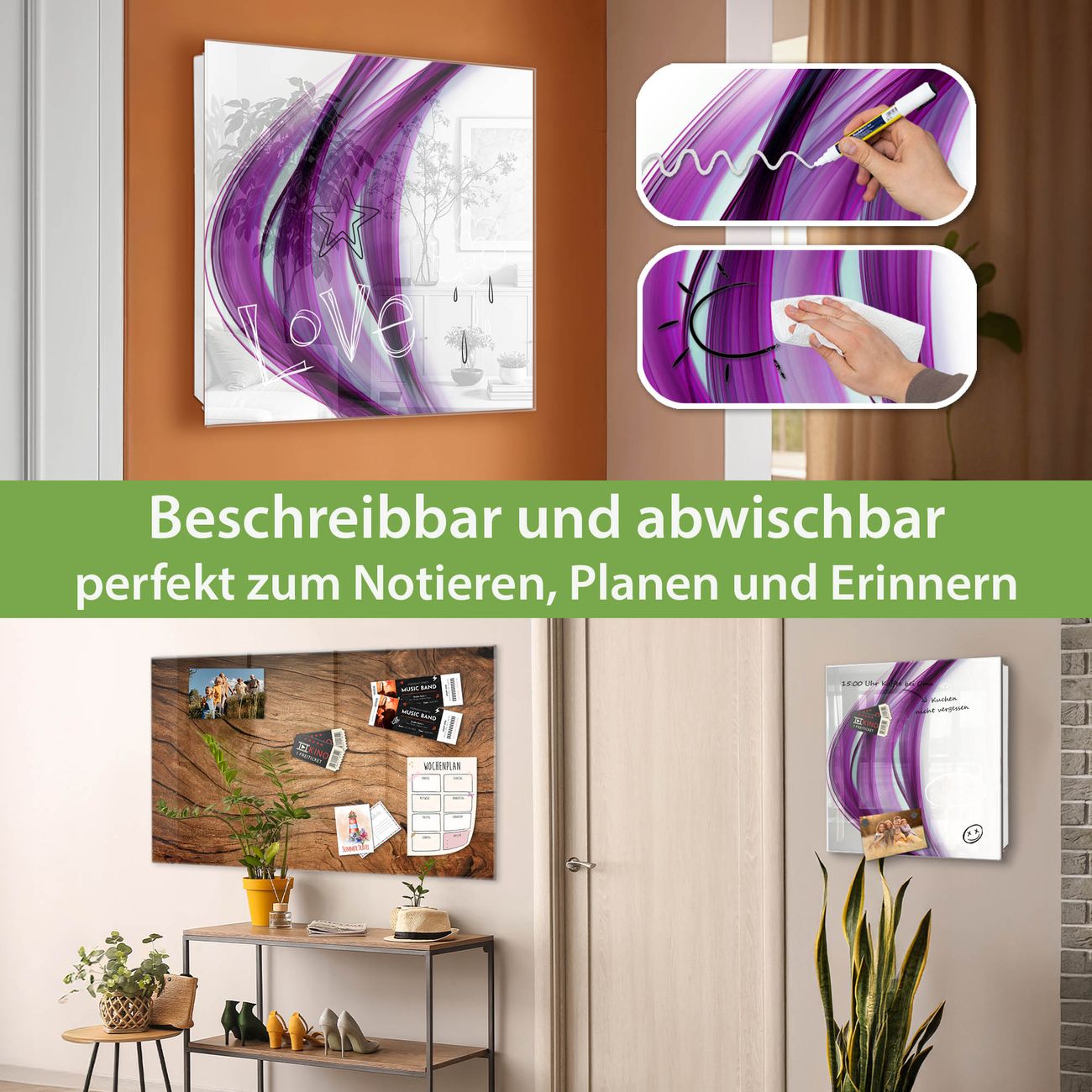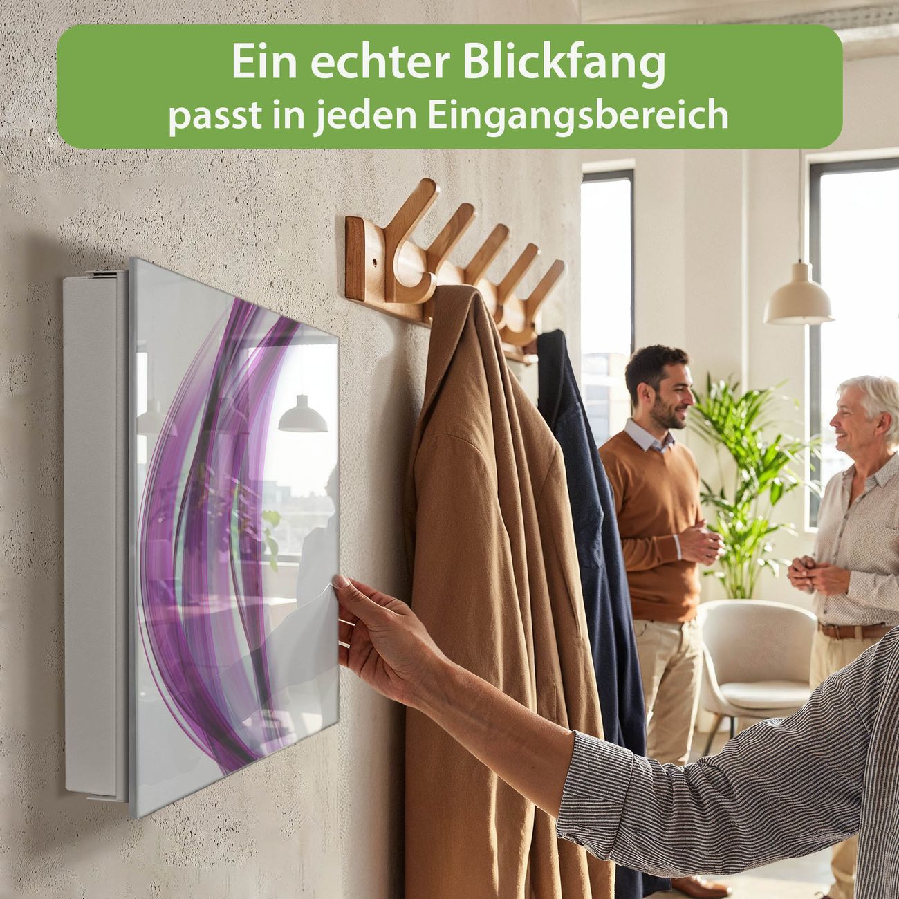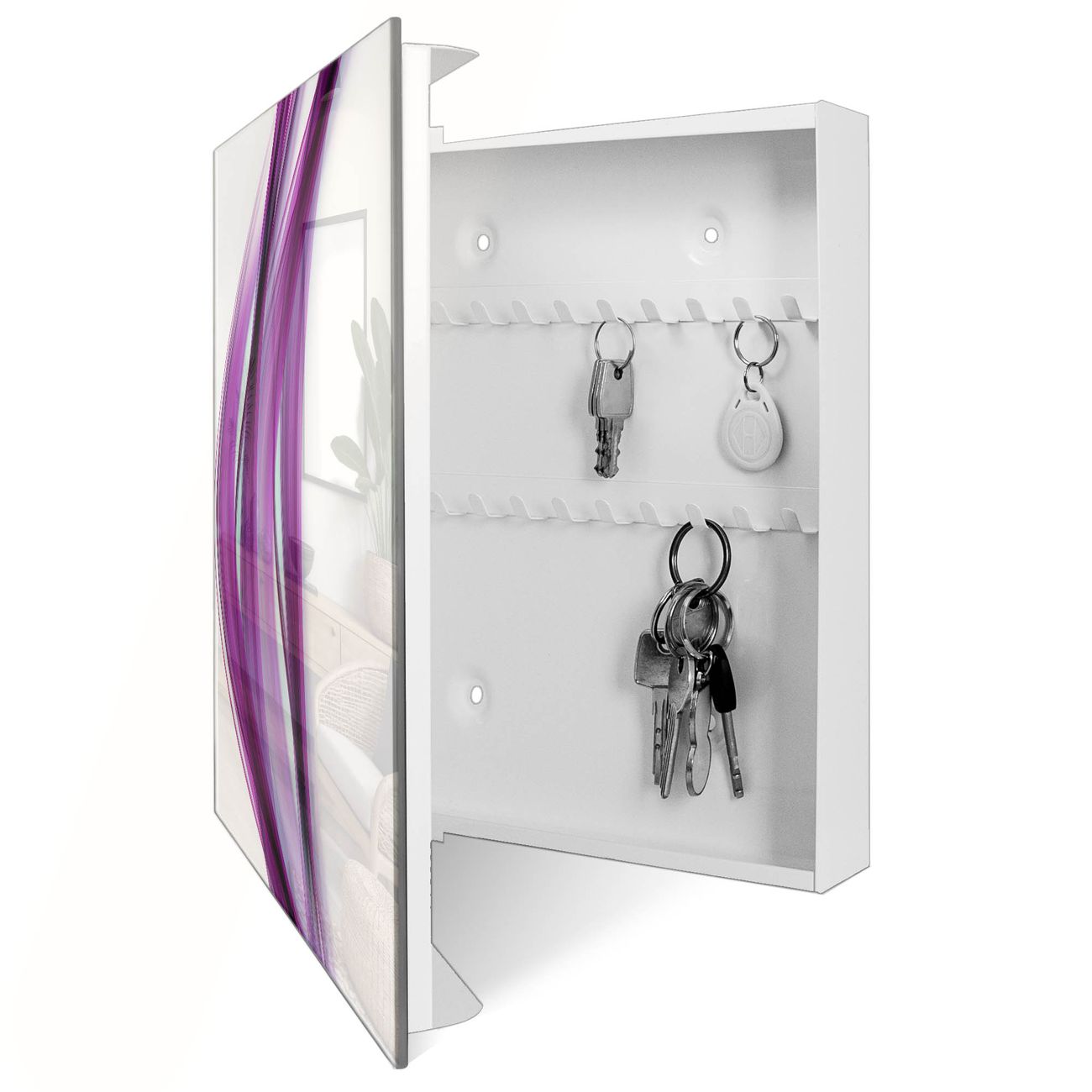Bringe Ordnung und Eleganz in deinen Eingangsbereich mit dem banjado Schlüsselkasten Motiv Motiv Violet Element. Die moderne Schlüsselbox kombiniert funktionales Design mit hochwertiger Verarbeitung und wird so zu einem echten Hingucker in Flur, Büro oder Ferienwohnung. ✅ Stilvolle Schlüsselaufbewahrung mit Glasfront im Motiv Motiv Violet Element Der Design-Schlüsselkasten Motiv Motiv Violet Element bietet Platz für bis zu 50 Schlüssel, die auf 5 stabilen Reihen mit je 10 Haken übersichtlich verstaut werden. Mit seinen kompakten Maßen von 30 x 30 x 5 cm passt die Schlüsselbox perfekt auch in kleinere Räume. Der weiß lackierte Stahlkorpus mit rechts angeschlagenem Türscharnier harmoniert mit der Glasfront und fügt sich nahtlos in jedes Wohnambiente ein. Ob als Schlüsselorganizer für Zuhause oder als praktische Lösung für Büros, Praxen und Gewerbe, der banjado Schlüsselkasten sorgt für Ordnung und Übersicht. Dank der magnetischen, mit Kreidestiften beschreibbaren Glasfront kannst du Notizen anheften oder Termine direkt auf der Oberfläche festhalten. Die Schlüsselbox Motiv Motiv Violet Element zur Wandmontage wird inklusive Befestigungsmaterial geliefert und ist schnell angebracht. So hast du deine Schlüssel jederzeit griffbereit und zugleich stilvoll verstaut. Mit diesem banjado Schlüsselkasten Motiv Motiv Violet Element kombinierst du praktische Aufbewahrung mit stilvollem Wohndesign. Ob privat oder geschäftlich, die Schlüsselbox sorgt für mehr Ordnung, Übersicht und ein wohnliches Ambiente.Vorteile im Überblick