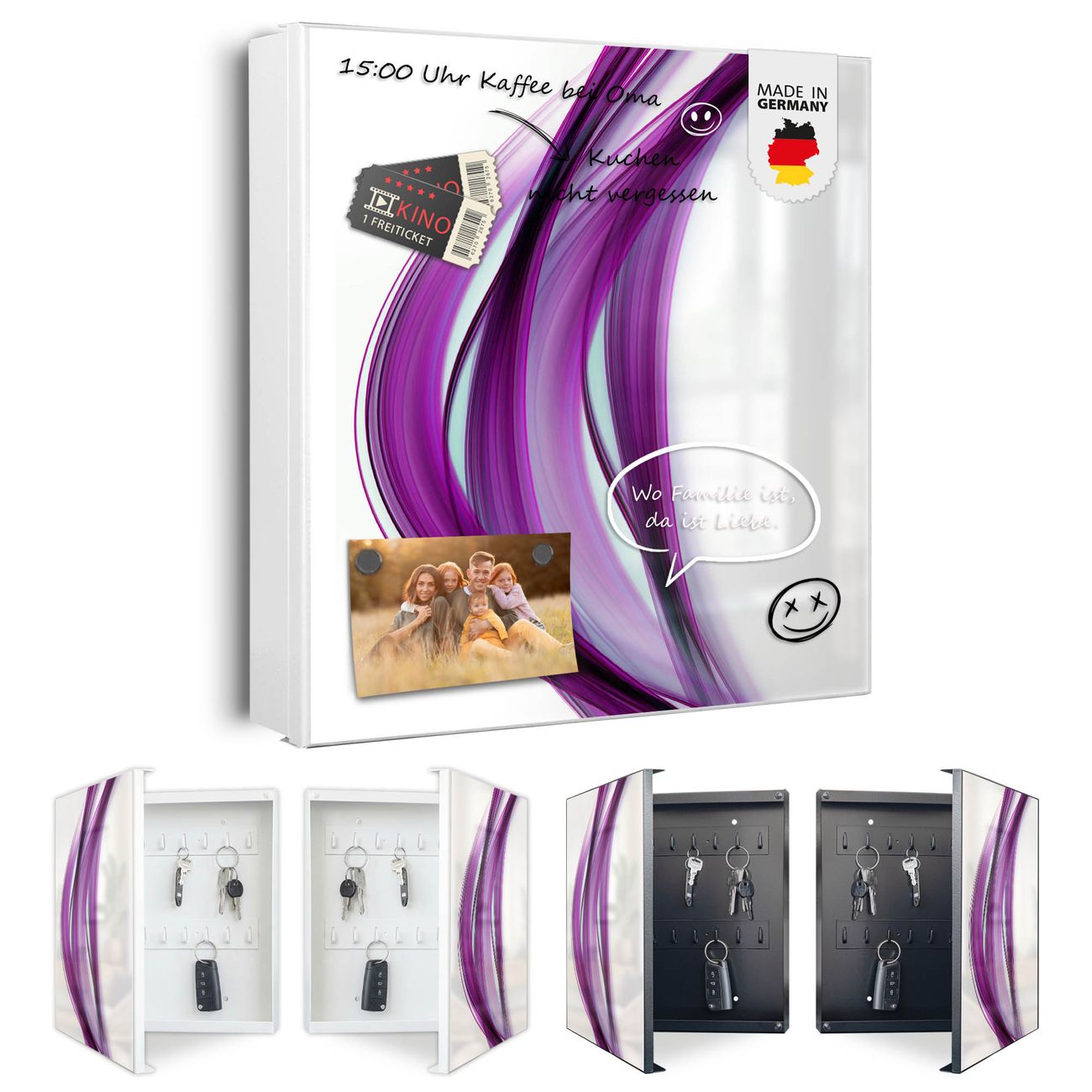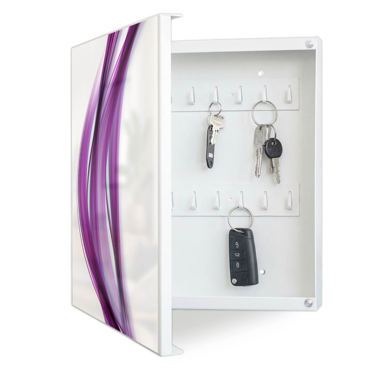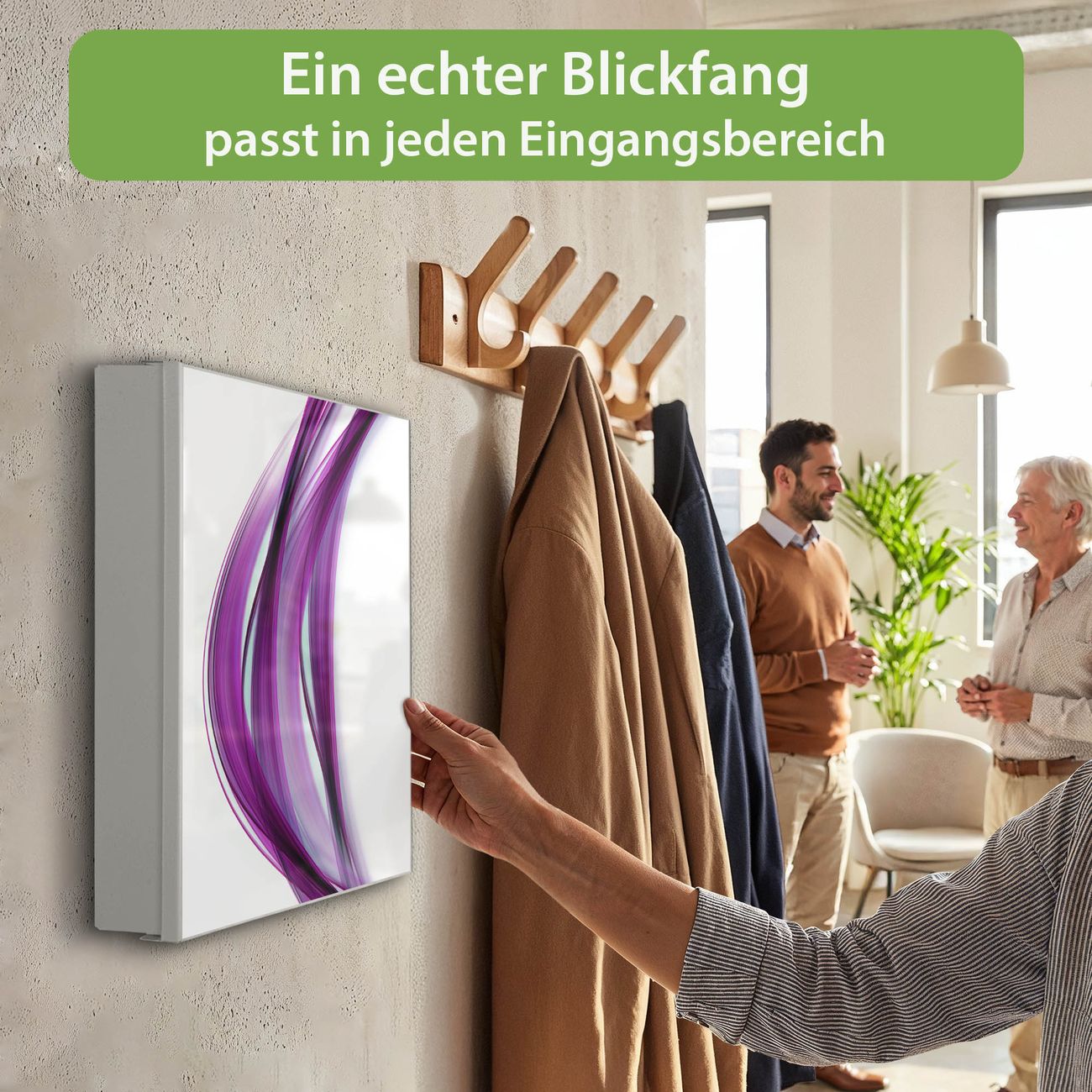 Bringe Ordnung und Eleganz in deinen Eingangsbereich mit dem banjado Schlüsselkasten Motiv Motiv Violet Element. Die moderne Schlüsselbox kombiniert funktionales Design mit hochwertiger Verarbeitung und wird so zu einem echten Hingucker in Flur, Büro oder Ferienwohnung. ✅ Stilvolle Schlüsselaufbewahrung mit Motiv Motiv Violet Element Der Design-Schlüsselkasten Motiv Motiv Violet Element bietet Platz für bis zu 32 Schlüssel, die auf 4 stabilen Reihen mit je 8 Haken übersichtlich verstaut werden. Mit seinen kompakten Maßen von 30 x 30 x 5 cm passt die Schlüsselbox perfekt auch in kleinere Räume. Der weiß lackierte Stahlkorpus mit links angeschlagenem Türscharnier harmoniert mit gedruckten Folie auf der Front und fügt sich nahtlos in jedes Wohnambiente ein. Ob als Schlüsselorganizer für Zuhause oder als praktische Lösung für Büros, Praxen und Gewerbe, der banjado Schlüsselkasten sorgt für Ordnung und Übersicht. Dank der magnetischen, mit Kreidestiften beschreibbaren Folie auf der Front kannst du Notizen anheften oder Termine direkt auf der Oberfläche festhalten. Die Schlüsselbox Motiv Motiv Violet Element zur Wandmontage wird inklusive Befestigungsmaterial geliefert und ist schnell angebracht. So hast du deine Schlüssel jederzeit griffbereit und zugleich stilvoll verstaut. Mit diesem banjado Schlüsselkasten Motiv Motiv Violet Element kombinierst du praktische Aufbewahrung mit stilvollem Wohndesign. Ob privat oder geschäftlich, die Schlüsselbox sorgt für mehr Ordnung, Übersicht und ein wohnliches Ambiente.Vorteile im Überblick