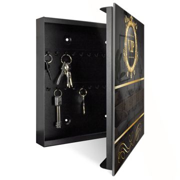 Bringe Ordnung und Eleganz in deinen Eingangsbereich mit dem banjado Schlüsselkasten Motiv Motiv VIP. Die moderne Schlüsselbox kombiniert funktionales Design mit hochwertiger Verarbeitung und wird so zu einem echten Hingucker in Flur, Büro oder Ferienwohnung. ✅ Stilvolle Schlüsselaufbewahrung mit Glasfront im Motiv Motiv VIP Der Design-Schlüsselkasten Motiv Motiv VIP bietet Platz für bis zu 50 Schlüssel, die auf 5 stabilen Reihen mit je 10 Haken übersichtlich verstaut werden. Mit seinen kompakten Maßen von 30 x 30 x 5 cm passt die Schlüsselbox perfekt auch in kleinere Räume. Der schwarz lackierte Stahlkorpus mit rechts angeschlagenem Türscharnier harmoniert mit der Glasfront und fügt sich nahtlos in jedes Wohnambiente ein. Ob als Schlüsselorganizer für Zuhause oder als praktische Lösung für Büros, Praxen und Gewerbe, der banjado Schlüsselkasten sorgt für Ordnung und Übersicht. Dank der magnetischen, mit Kreidestiften beschreibbaren Glasfront kannst du Notizen anheften oder Termine direkt auf der Oberfläche festhalten. Die Schlüsselbox Motiv Motiv VIP zur Wandmontage wird inklusive Befestigungsmaterial geliefert und ist schnell angebracht. So hast du deine Schlüssel jederzeit griffbereit und zugleich stilvoll verstaut. Mit diesem banjado Schlüsselkasten Motiv Motiv VIP kombinierst du praktische Aufbewahrung mit stilvollem Wohndesign. Ob privat oder geschäftlich, die Schlüsselbox sorgt für mehr Ordnung, Übersicht und ein wohnliches Ambiente.Vorteile im Überblick