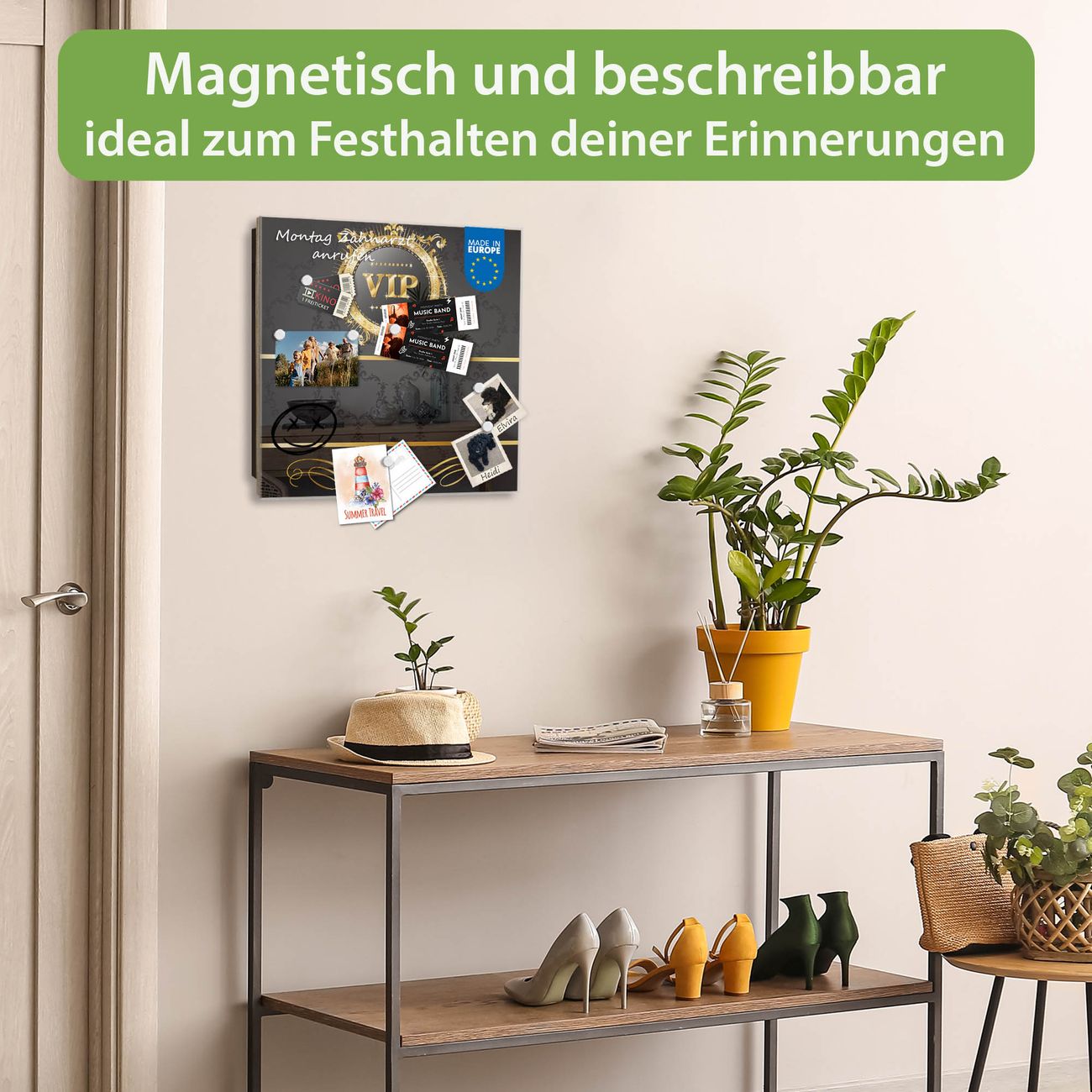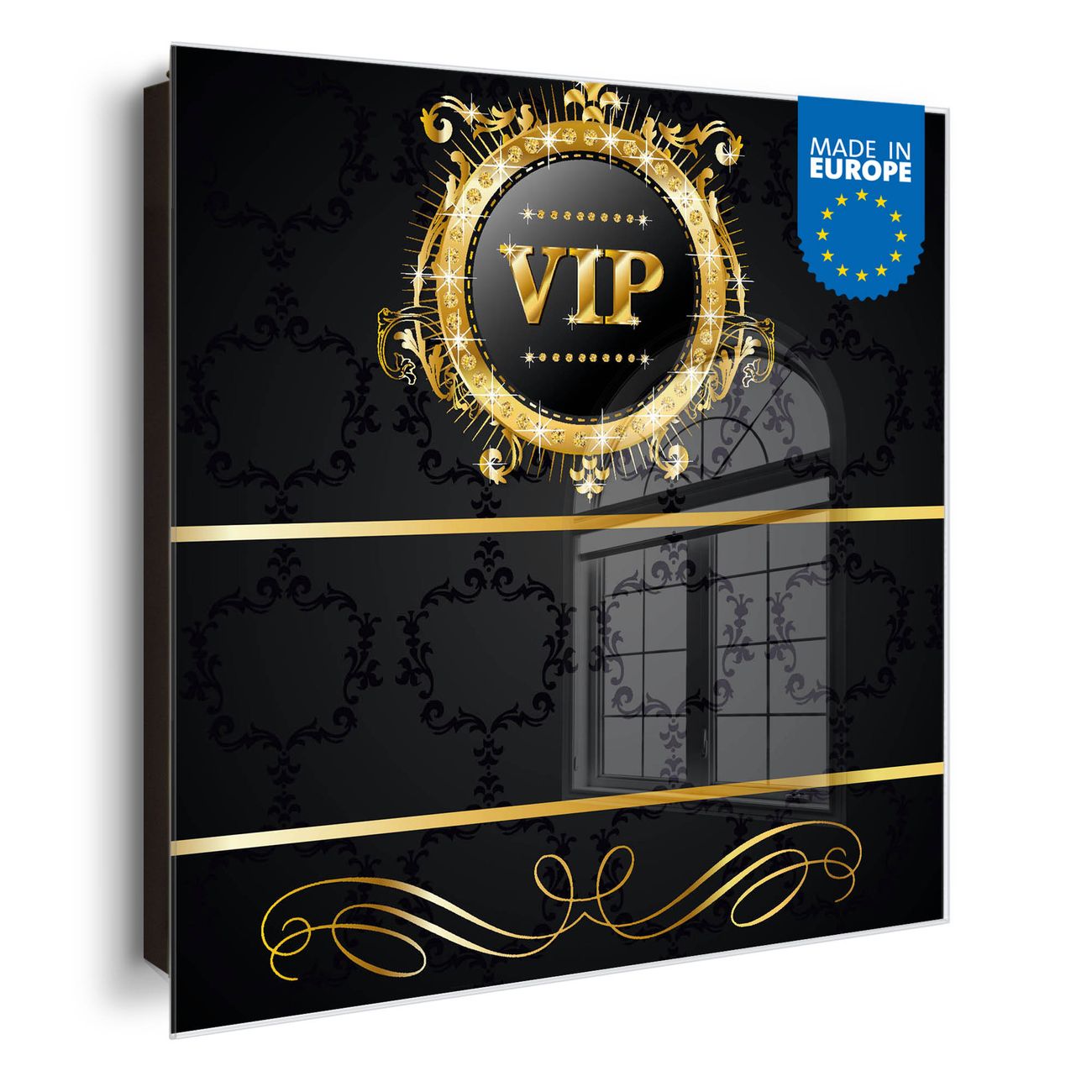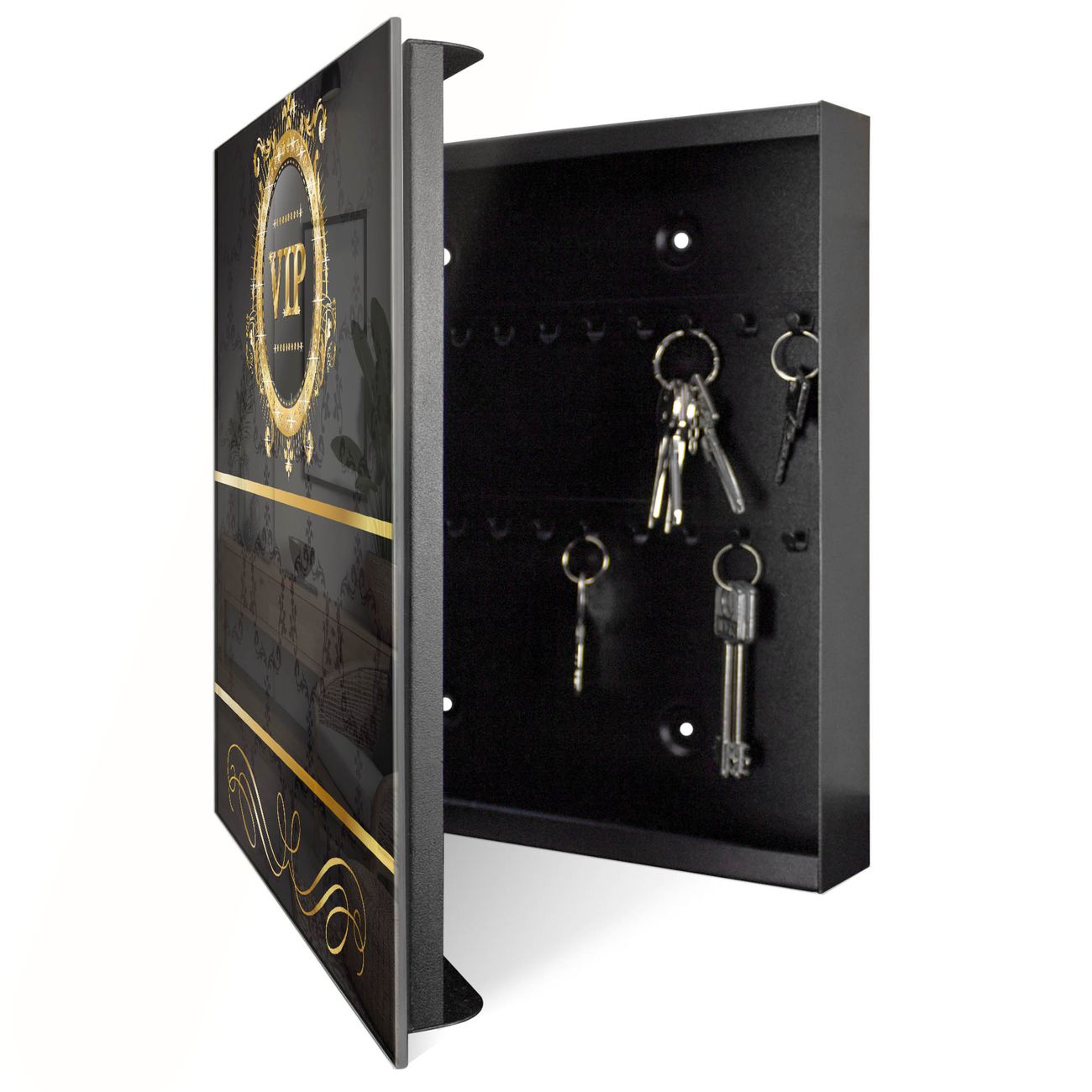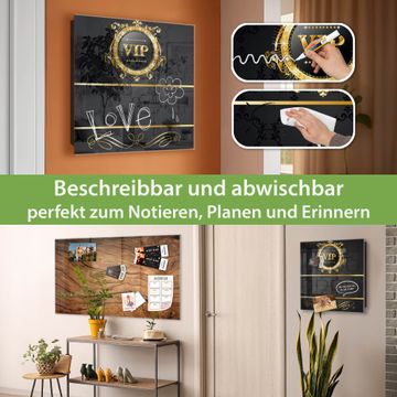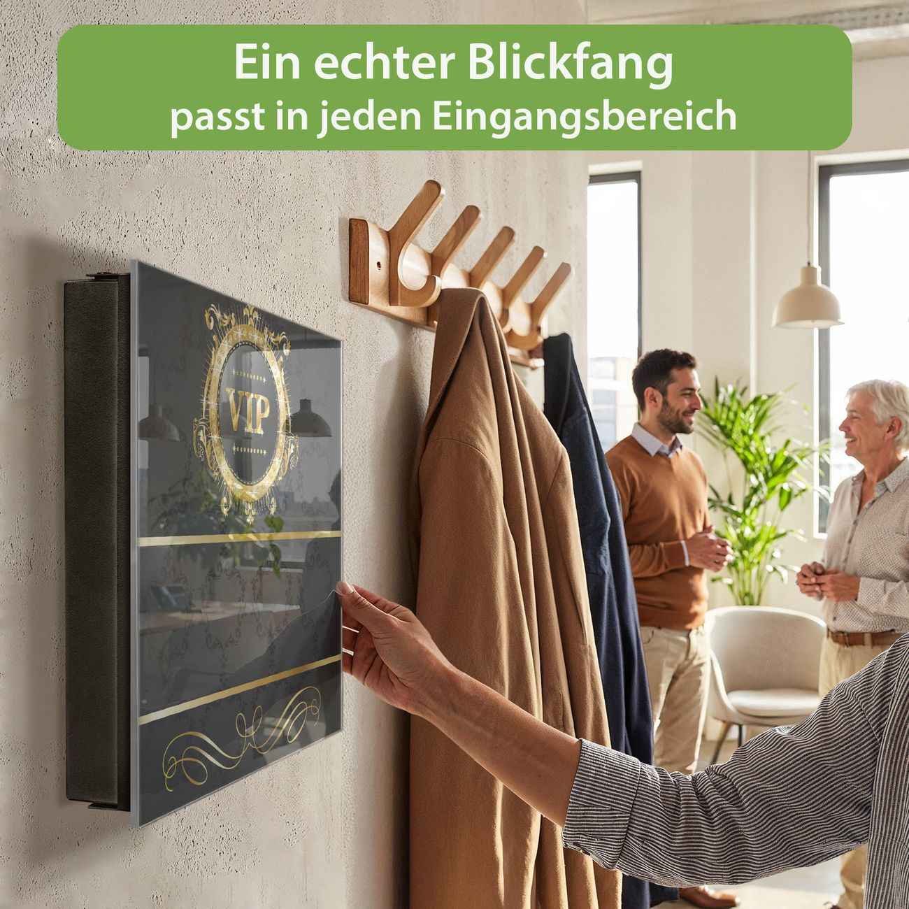 Bringe Ordnung und Eleganz in deinen Eingangsbereich mit dem banjado Schlüsselkasten Motiv Motiv VIP. Die moderne Schlüsselbox kombiniert funktionales Design mit hochwertiger Verarbeitung und wird so zu einem echten Hingucker in Flur, Büro oder Ferienwohnung. ✅ Stilvolle Schlüsselaufbewahrung mit Glasfront im Motiv Motiv VIP Der Design-Schlüsselkasten Motiv Motiv VIP bietet Platz für bis zu 50 Schlüssel, die auf 5 stabilen Reihen mit je 10 Haken übersichtlich verstaut werden. Mit seinen kompakten Maßen von 30 x 30 x 5 cm passt die Schlüsselbox perfekt auch in kleinere Räume. Der schwarz lackierte Stahlkorpus mit rechts angeschlagenem Türscharnier harmoniert mit der Glasfront und fügt sich nahtlos in jedes Wohnambiente ein. Ob als Schlüsselorganizer für Zuhause oder als praktische Lösung für Büros, Praxen und Gewerbe, der banjado Schlüsselkasten sorgt für Ordnung und Übersicht. Dank der magnetischen, mit Kreidestiften beschreibbaren Glasfront kannst du Notizen anheften oder Termine direkt auf der Oberfläche festhalten. Die Schlüsselbox Motiv Motiv VIP zur Wandmontage wird inklusive Befestigungsmaterial geliefert und ist schnell angebracht. So hast du deine Schlüssel jederzeit griffbereit und zugleich stilvoll verstaut. Mit diesem banjado Schlüsselkasten Motiv Motiv VIP kombinierst du praktische Aufbewahrung mit stilvollem Wohndesign. Ob privat oder geschäftlich, die Schlüsselbox sorgt für mehr Ordnung, Übersicht und ein wohnliches Ambiente.Vorteile im Überblick