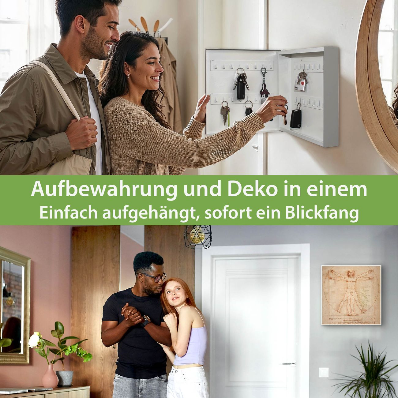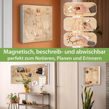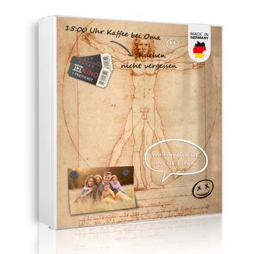 Bringe Ordnung und Eleganz in deinen Eingangsbereich mit dem banjado Schlüsselkasten Motiv Motiv Vitruvianische Figur. Die moderne Schlüsselbox kombiniert funktionales Design mit hochwertiger Verarbeitung und wird so zu einem echten Hingucker in Flur, Büro oder Ferienwohnung. ✅ Stilvolle Schlüsselaufbewahrung mit Motiv Motiv Vitruvianische Figur Der Design-Schlüsselkasten Motiv Motiv Vitruvianische Figur bietet Platz für bis zu 32 Schlüssel, die auf 4 stabilen Reihen mit je 8 Haken übersichtlich verstaut werden. Mit seinen kompakten Maßen von 30 x 30 x 5 cm passt die Schlüsselbox perfekt auch in kleinere Räume. Der weiß lackierte Stahlkorpus mit rechts angeschlagenem Türscharnier harmoniert mit gedruckten Folie auf der Front und fügt sich nahtlos in jedes Wohnambiente ein. Ob als Schlüsselorganizer für Zuhause oder als praktische Lösung für Büros, Praxen und Gewerbe, der banjado Schlüsselkasten sorgt für Ordnung und Übersicht. Dank der magnetischen, mit Kreidestiften beschreibbaren Folie auf der Front kannst du Notizen anheften oder Termine direkt auf der Oberfläche festhalten. Die Schlüsselbox Motiv Motiv Vitruvianische Figur zur Wandmontage wird inklusive Befestigungsmaterial geliefert und ist schnell angebracht. So hast du deine Schlüssel jederzeit griffbereit und zugleich stilvoll verstaut. Mit diesem banjado Schlüsselkasten Motiv Motiv Vitruvianische Figur kombinierst du praktische Aufbewahrung mit stilvollem Wohndesign. Ob privat oder geschäftlich, die Schlüsselbox sorgt für mehr Ordnung, Übersicht und ein wohnliches Ambiente.Vorteile im Überblick
