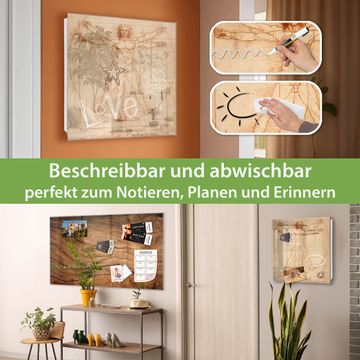 Bringe Ordnung und Eleganz in deinen Eingangsbereich mit dem banjado Schlüsselkasten Motiv Motiv Vitruvianische Figur. Die moderne Schlüsselbox kombiniert funktionales Design mit hochwertiger Verarbeitung und wird so zu einem echten Hingucker in Flur, Büro oder Ferienwohnung. ✅ Stilvolle Schlüsselaufbewahrung mit Glasfront im Motiv Motiv Vitruvianische Figur Der Design-Schlüsselkasten Motiv Motiv Vitruvianische Figur bietet Platz für bis zu 50 Schlüssel, die auf 5 stabilen Reihen mit je 10 Haken übersichtlich verstaut werden. Mit seinen kompakten Maßen von 30 x 30 x 5 cm passt die Schlüsselbox perfekt auch in kleinere Räume. Der weiß lackierte Stahlkorpus mit rechts angeschlagenem Türscharnier harmoniert mit der Glasfront und fügt sich nahtlos in jedes Wohnambiente ein. Ob als Schlüsselorganizer für Zuhause oder als praktische Lösung für Büros, Praxen und Gewerbe, der banjado Schlüsselkasten sorgt für Ordnung und Übersicht. Dank der magnetischen, mit Kreidestiften beschreibbaren Glasfront kannst du Notizen anheften oder Termine direkt auf der Oberfläche festhalten. Die Schlüsselbox Motiv Motiv Vitruvianische Figur zur Wandmontage wird inklusive Befestigungsmaterial geliefert und ist schnell angebracht. So hast du deine Schlüssel jederzeit griffbereit und zugleich stilvoll verstaut. Mit diesem banjado Schlüsselkasten Motiv Motiv Vitruvianische Figur kombinierst du praktische Aufbewahrung mit stilvollem Wohndesign. Ob privat oder geschäftlich, die Schlüsselbox sorgt für mehr Ordnung, Übersicht und ein wohnliches Ambiente.Vorteile im Überblick