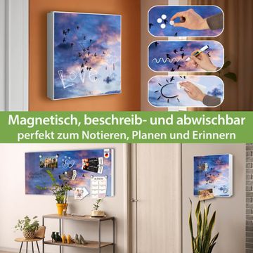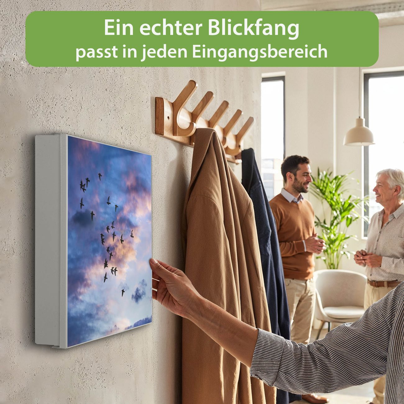 Bringe Ordnung und Eleganz in deinen Eingangsbereich mit dem banjado Schlüsselkasten Motiv Motiv Vögel am Himmel 3. Die moderne Schlüsselbox kombiniert funktionales Design mit hochwertiger Verarbeitung und wird so zu einem echten Hingucker in Flur, Büro oder Ferienwohnung. ✅ Stilvolle Schlüsselaufbewahrung mit Motiv Motiv Vögel am Himmel 3 Der Design-Schlüsselkasten Motiv Motiv Vögel am Himmel 3 bietet Platz für bis zu 32 Schlüssel, die auf 4 stabilen Reihen mit je 8 Haken übersichtlich verstaut werden. Mit seinen kompakten Maßen von 30 x 30 x 5 cm passt die Schlüsselbox perfekt auch in kleinere Räume. Der weiß lackierte Stahlkorpus mit links angeschlagenem Türscharnier harmoniert mit gedruckten Folie auf der Front und fügt sich nahtlos in jedes Wohnambiente ein. Ob als Schlüsselorganizer für Zuhause oder als praktische Lösung für Büros, Praxen und Gewerbe, der banjado Schlüsselkasten sorgt für Ordnung und Übersicht. Dank der magnetischen, mit Kreidestiften beschreibbaren Folie auf der Front kannst du Notizen anheften oder Termine direkt auf der Oberfläche festhalten. Die Schlüsselbox Motiv Motiv Vögel am Himmel 3 zur Wandmontage wird inklusive Befestigungsmaterial geliefert und ist schnell angebracht. So hast du deine Schlüssel jederzeit griffbereit und zugleich stilvoll verstaut. Mit diesem banjado Schlüsselkasten Motiv Motiv Vögel am Himmel 3 kombinierst du praktische Aufbewahrung mit stilvollem Wohndesign. Ob privat oder geschäftlich, die Schlüsselbox sorgt für mehr Ordnung, Übersicht und ein wohnliches Ambiente.Vorteile im Überblick