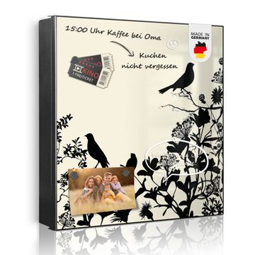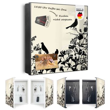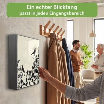 Bringe Ordnung und Eleganz in deinen Eingangsbereich mit dem banjado Schlüsselkasten Motiv Motiv Vögel Schattenriß. Die moderne Schlüsselbox kombiniert funktionales Design mit hochwertiger Verarbeitung und wird so zu einem echten Hingucker in Flur, Büro oder Ferienwohnung. ✅ Stilvolle Schlüsselaufbewahrung mit Motiv Motiv Vögel Schattenriß Der Design-Schlüsselkasten Motiv Motiv Vögel Schattenriß bietet Platz für bis zu 32 Schlüssel, die auf 4 stabilen Reihen mit je 8 Haken übersichtlich verstaut werden. Mit seinen kompakten Maßen von 30 x 30 x 5 cm passt die Schlüsselbox perfekt auch in kleinere Räume. Der schwarz lackierte Stahlkorpus mit links angeschlagenem Türscharnier harmoniert mit gedruckten Folie auf der Front und fügt sich nahtlos in jedes Wohnambiente ein. Ob als Schlüsselorganizer für Zuhause oder als praktische Lösung für Büros, Praxen und Gewerbe, der banjado Schlüsselkasten sorgt für Ordnung und Übersicht. Dank der magnetischen, mit Kreidestiften beschreibbaren Folie auf der Front kannst du Notizen anheften oder Termine direkt auf der Oberfläche festhalten. Die Schlüsselbox Motiv Motiv Vögel Schattenriß zur Wandmontage wird inklusive Befestigungsmaterial geliefert und ist schnell angebracht. So hast du deine Schlüssel jederzeit griffbereit und zugleich stilvoll verstaut. Mit diesem banjado Schlüsselkasten Motiv Motiv Vögel Schattenriß kombinierst du praktische Aufbewahrung mit stilvollem Wohndesign. Ob privat oder geschäftlich, die Schlüsselbox sorgt für mehr Ordnung, Übersicht und ein wohnliches Ambiente.Vorteile im Überblick