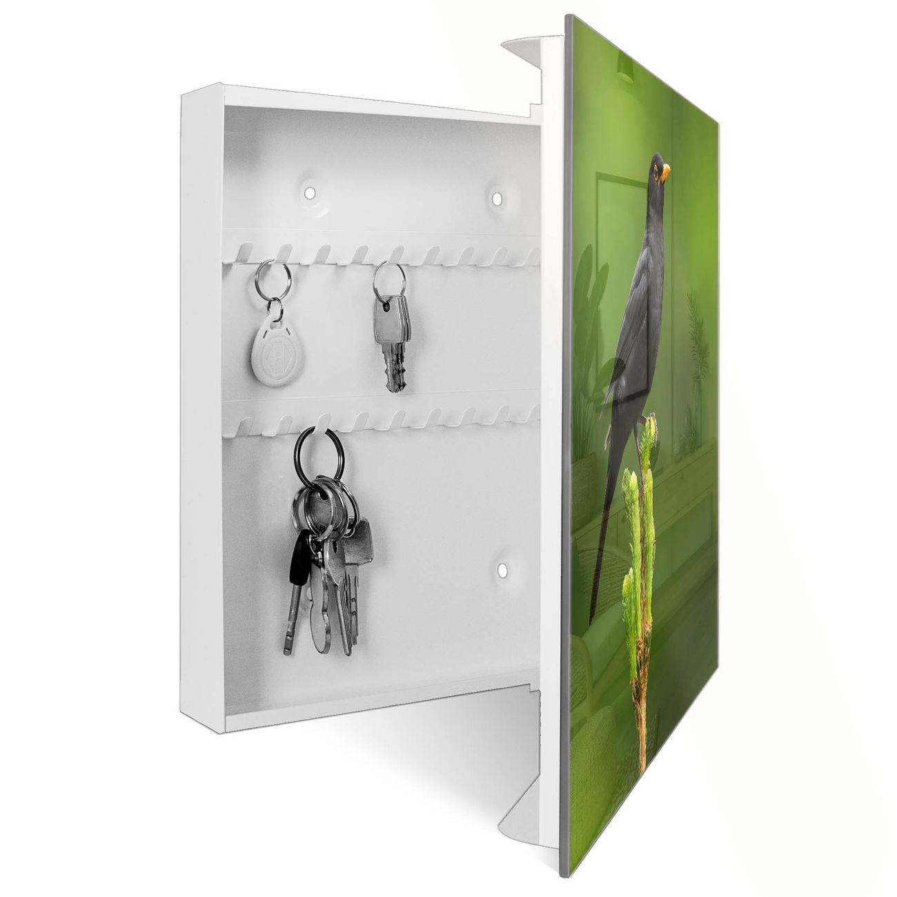 Bringe Ordnung und Eleganz in deinen Eingangsbereich mit dem banjado Schlüsselkasten Motiv Motiv Vogel auf Tannenzweig. Die moderne Schlüsselbox kombiniert funktionales Design mit hochwertiger Verarbeitung und wird so zu einem echten Hingucker in Flur, Büro oder Ferienwohnung. ✅ Stilvolle Schlüsselaufbewahrung mit Glasfront im Motiv Motiv Vogel auf Tannenzweig Der Design-Schlüsselkasten Motiv Motiv Vogel auf Tannenzweig bietet Platz für bis zu 50 Schlüssel, die auf 5 stabilen Reihen mit je 10 Haken übersichtlich verstaut werden. Mit seinen kompakten Maßen von 30 x 30 x 5 cm passt die Schlüsselbox perfekt auch in kleinere Räume. Der weiß lackierte Stahlkorpus mit rechts angeschlagenem Türscharnier harmoniert mit der Glasfront und fügt sich nahtlos in jedes Wohnambiente ein. Ob als Schlüsselorganizer für Zuhause oder als praktische Lösung für Büros, Praxen und Gewerbe, der banjado Schlüsselkasten sorgt für Ordnung und Übersicht. Dank der magnetischen, mit Kreidestiften beschreibbaren Glasfront kannst du Notizen anheften oder Termine direkt auf der Oberfläche festhalten. Die Schlüsselbox Motiv Motiv Vogel auf Tannenzweig zur Wandmontage wird inklusive Befestigungsmaterial geliefert und ist schnell angebracht. So hast du deine Schlüssel jederzeit griffbereit und zugleich stilvoll verstaut. Mit diesem banjado Schlüsselkasten Motiv Motiv Vogel auf Tannenzweig kombinierst du praktische Aufbewahrung mit stilvollem Wohndesign. Ob privat oder geschäftlich, die Schlüsselbox sorgt für mehr Ordnung, Übersicht und ein wohnliches Ambiente.Vorteile im Überblick