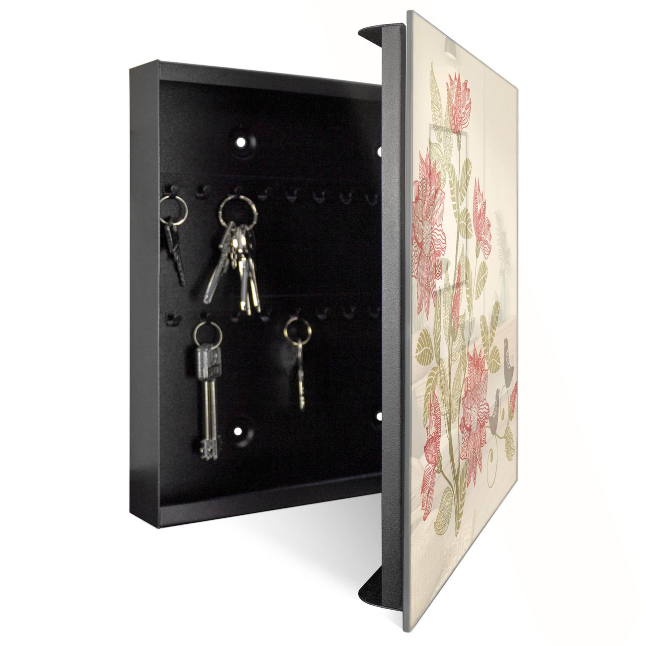 Bringe Ordnung und Eleganz in deinen Eingangsbereich mit dem banjado Schlüsselkasten Motiv Motiv Vogelpaar. Die moderne Schlüsselbox kombiniert funktionales Design mit hochwertiger Verarbeitung und wird so zu einem echten Hingucker in Flur, Büro oder Ferienwohnung. ✅ Stilvolle Schlüsselaufbewahrung mit Glasfront im Motiv Motiv Vogelpaar Der Design-Schlüsselkasten Motiv Motiv Vogelpaar bietet Platz für bis zu 50 Schlüssel, die auf 5 stabilen Reihen mit je 10 Haken übersichtlich verstaut werden. Mit seinen kompakten Maßen von 30 x 30 x 5 cm passt die Schlüsselbox perfekt auch in kleinere Räume. Der schwarz lackierte Stahlkorpus mit rechts angeschlagenem Türscharnier harmoniert mit der Glasfront und fügt sich nahtlos in jedes Wohnambiente ein. Ob als Schlüsselorganizer für Zuhause oder als praktische Lösung für Büros, Praxen und Gewerbe, der banjado Schlüsselkasten sorgt für Ordnung und Übersicht. Dank der magnetischen, mit Kreidestiften beschreibbaren Glasfront kannst du Notizen anheften oder Termine direkt auf der Oberfläche festhalten. Die Schlüsselbox Motiv Motiv Vogelpaar zur Wandmontage wird inklusive Befestigungsmaterial geliefert und ist schnell angebracht. So hast du deine Schlüssel jederzeit griffbereit und zugleich stilvoll verstaut. Mit diesem banjado Schlüsselkasten Motiv Motiv Vogelpaar kombinierst du praktische Aufbewahrung mit stilvollem Wohndesign. Ob privat oder geschäftlich, die Schlüsselbox sorgt für mehr Ordnung, Übersicht und ein wohnliches Ambiente.Vorteile im Überblick