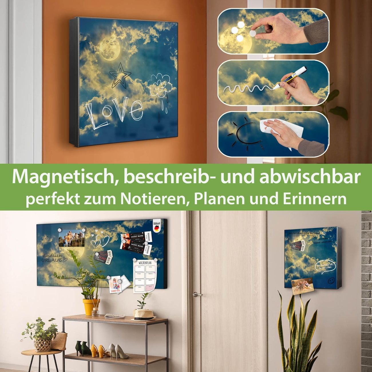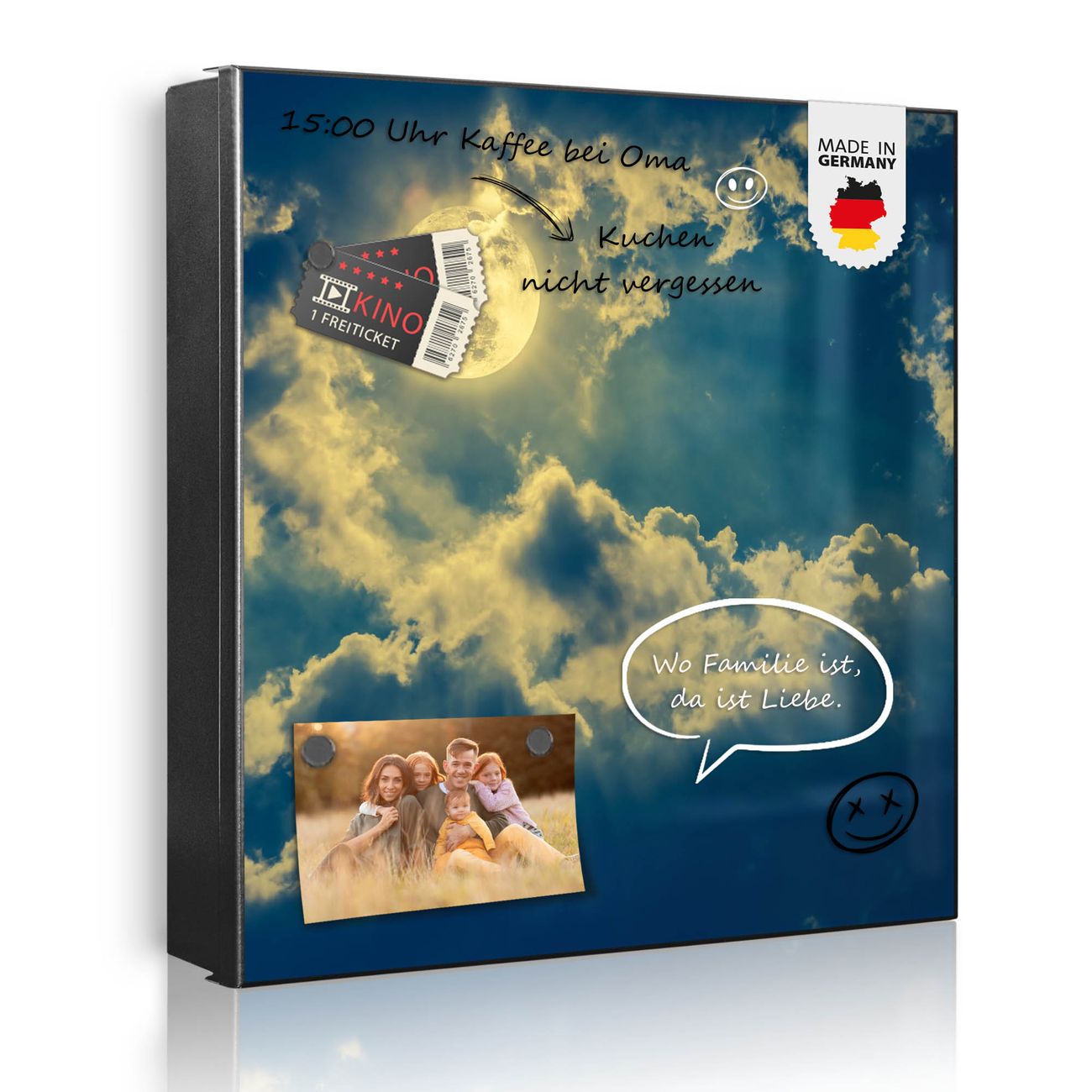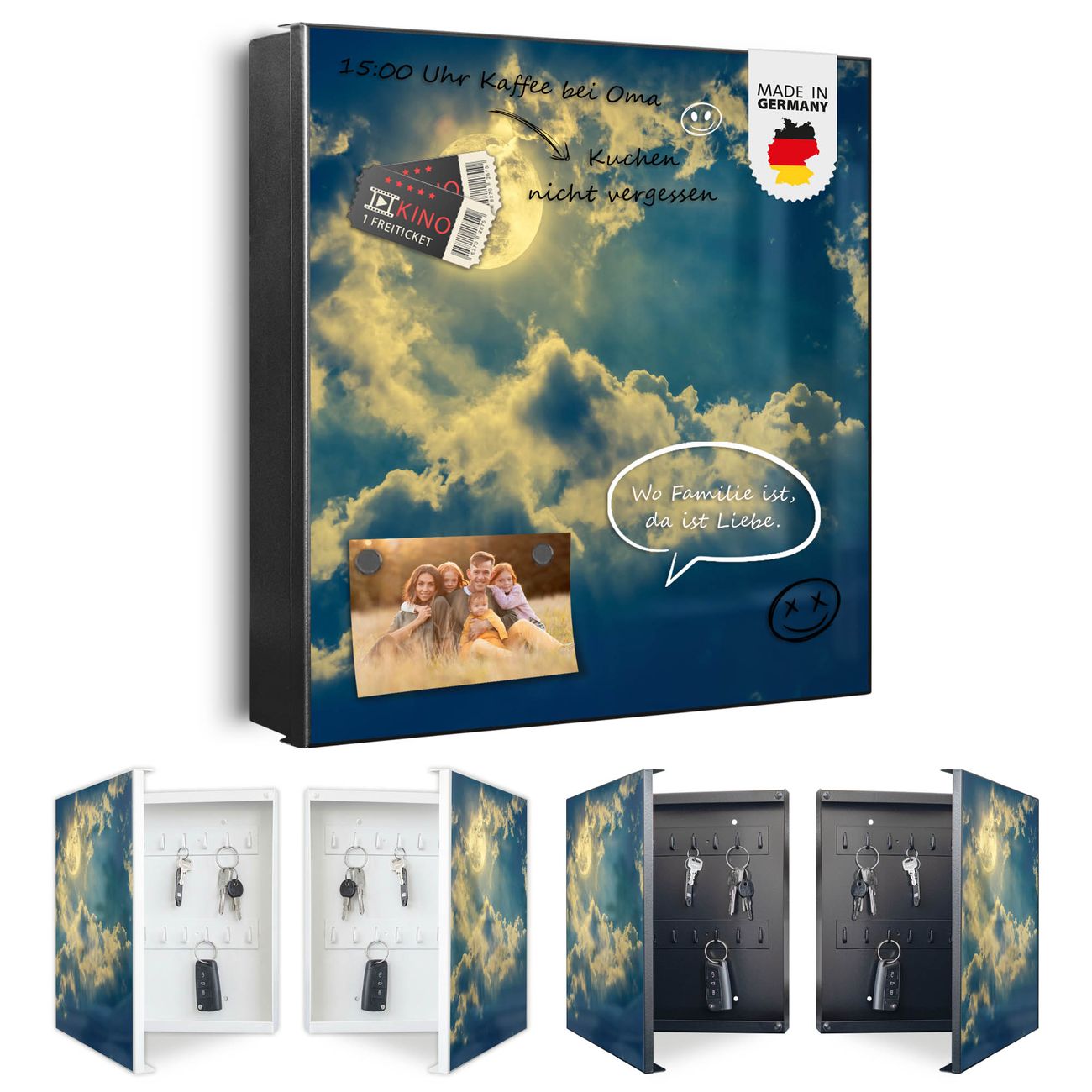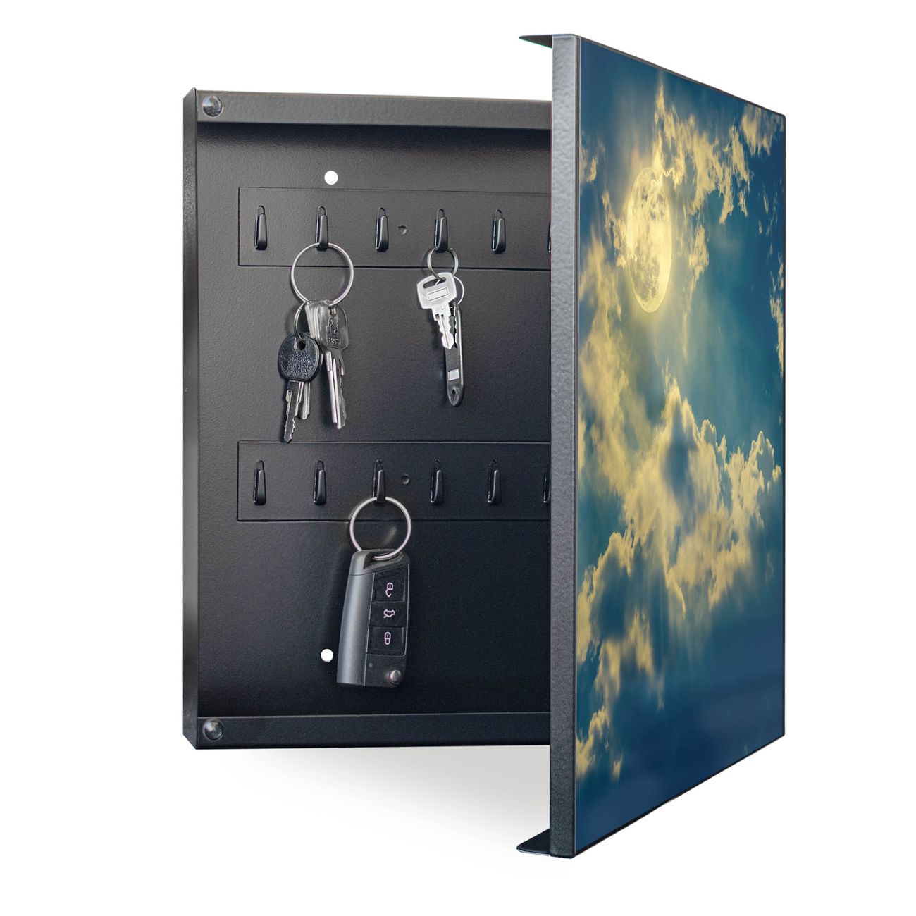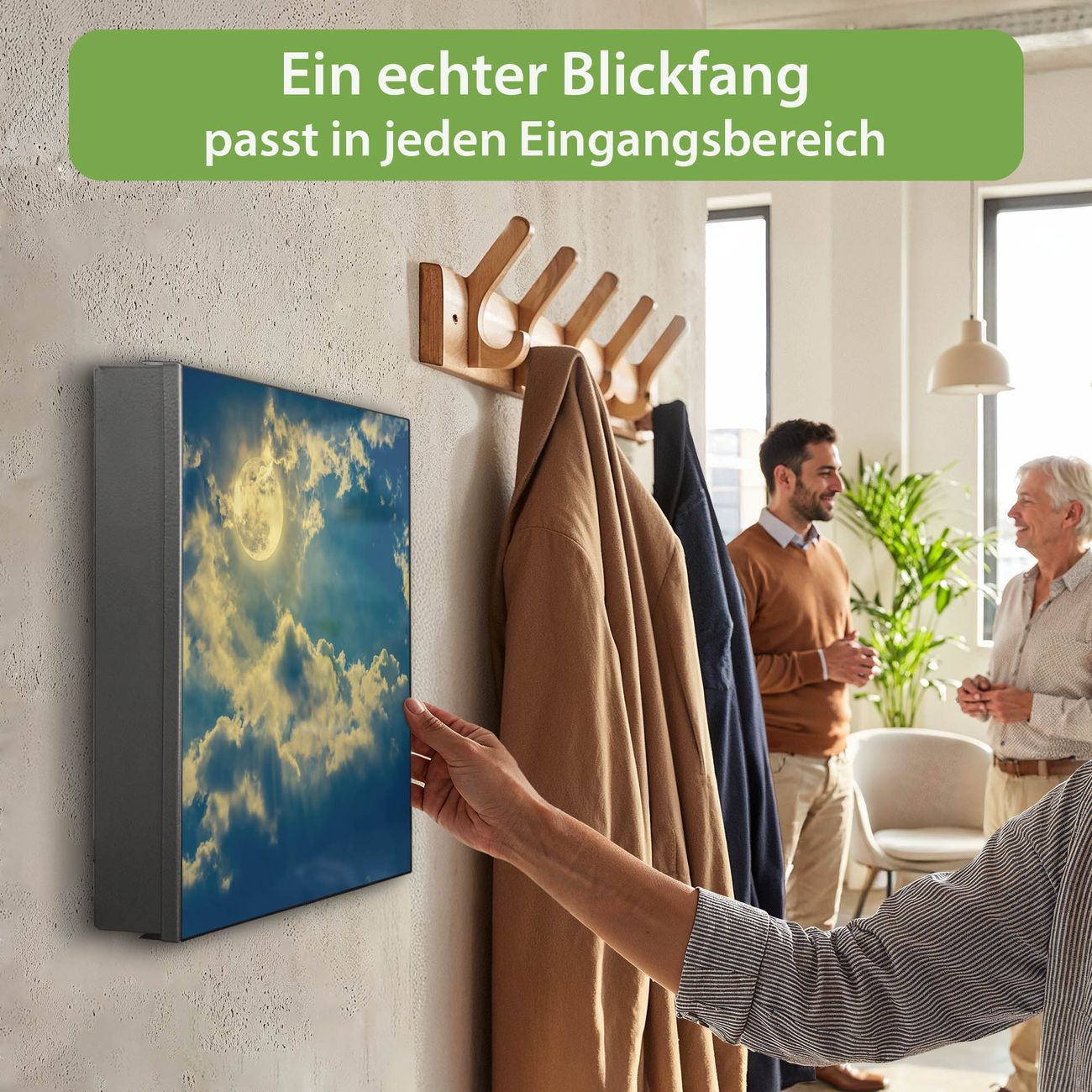 Bringe Ordnung und Eleganz in deinen Eingangsbereich mit dem banjado Schlüsselkasten Motiv Motiv Vollmond 2. Die moderne Schlüsselbox kombiniert funktionales Design mit hochwertiger Verarbeitung und wird so zu einem echten Hingucker in Flur, Büro oder Ferienwohnung. ✅ Stilvolle Schlüsselaufbewahrung mit Motiv Motiv Vollmond 2 Der Design-Schlüsselkasten Motiv Motiv Vollmond 2 bietet Platz für bis zu 32 Schlüssel, die auf 4 stabilen Reihen mit je 8 Haken übersichtlich verstaut werden. Mit seinen kompakten Maßen von 30 x 30 x 5 cm passt die Schlüsselbox perfekt auch in kleinere Räume. Der schwarz lackierte Stahlkorpus mit rechts angeschlagenem Türscharnier harmoniert mit gedruckten Folie auf der Front und fügt sich nahtlos in jedes Wohnambiente ein. Ob als Schlüsselorganizer für Zuhause oder als praktische Lösung für Büros, Praxen und Gewerbe, der banjado Schlüsselkasten sorgt für Ordnung und Übersicht. Dank der magnetischen, mit Kreidestiften beschreibbaren Folie auf der Front kannst du Notizen anheften oder Termine direkt auf der Oberfläche festhalten. Die Schlüsselbox Motiv Motiv Vollmond 2 zur Wandmontage wird inklusive Befestigungsmaterial geliefert und ist schnell angebracht. So hast du deine Schlüssel jederzeit griffbereit und zugleich stilvoll verstaut. Mit diesem banjado Schlüsselkasten Motiv Motiv Vollmond 2 kombinierst du praktische Aufbewahrung mit stilvollem Wohndesign. Ob privat oder geschäftlich, die Schlüsselbox sorgt für mehr Ordnung, Übersicht und ein wohnliches Ambiente.Vorteile im Überblick