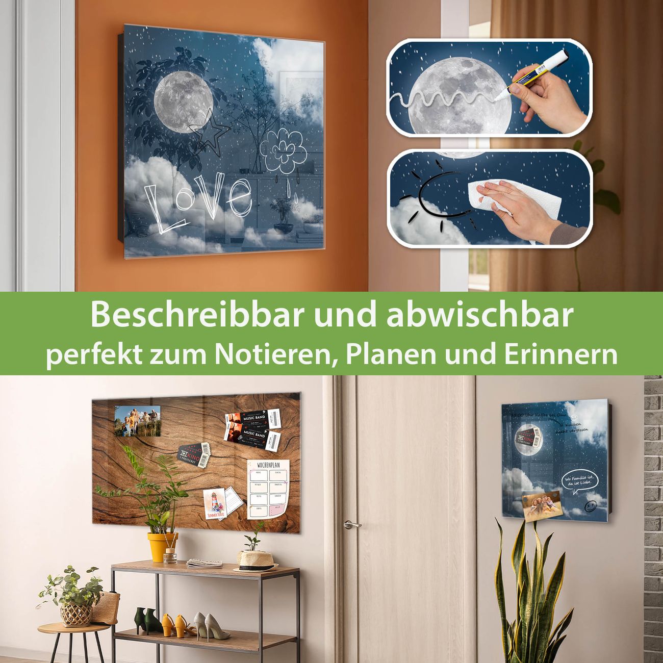 Bringe Ordnung und Eleganz in deinen Eingangsbereich mit dem banjado Schlüsselkasten Motiv Motiv Vollmond 3. Die moderne Schlüsselbox kombiniert funktionales Design mit hochwertiger Verarbeitung und wird so zu einem echten Hingucker in Flur, Büro oder Ferienwohnung. ✅ Stilvolle Schlüsselaufbewahrung mit Glasfront im Motiv Motiv Vollmond 3 Der Design-Schlüsselkasten Motiv Motiv Vollmond 3 bietet Platz für bis zu 50 Schlüssel, die auf 5 stabilen Reihen mit je 10 Haken übersichtlich verstaut werden. Mit seinen kompakten Maßen von 30 x 30 x 5 cm passt die Schlüsselbox perfekt auch in kleinere Räume. Der schwarz lackierte Stahlkorpus mit rechts angeschlagenem Türscharnier harmoniert mit der Glasfront und fügt sich nahtlos in jedes Wohnambiente ein. Ob als Schlüsselorganizer für Zuhause oder als praktische Lösung für Büros, Praxen und Gewerbe, der banjado Schlüsselkasten sorgt für Ordnung und Übersicht. Dank der magnetischen, mit Kreidestiften beschreibbaren Glasfront kannst du Notizen anheften oder Termine direkt auf der Oberfläche festhalten. Die Schlüsselbox Motiv Motiv Vollmond 3 zur Wandmontage wird inklusive Befestigungsmaterial geliefert und ist schnell angebracht. So hast du deine Schlüssel jederzeit griffbereit und zugleich stilvoll verstaut. Mit diesem banjado Schlüsselkasten Motiv Motiv Vollmond 3 kombinierst du praktische Aufbewahrung mit stilvollem Wohndesign. Ob privat oder geschäftlich, die Schlüsselbox sorgt für mehr Ordnung, Übersicht und ein wohnliches Ambiente.Vorteile im Überblick