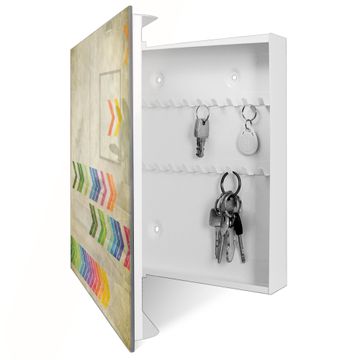 Bringe Ordnung und Eleganz in deinen Eingangsbereich mit dem banjado Schlüsselkasten Motiv Motiv Vorspulen. Die moderne Schlüsselbox kombiniert funktionales Design mit hochwertiger Verarbeitung und wird so zu einem echten Hingucker in Flur, Büro oder Ferienwohnung. ✅ Stilvolle Schlüsselaufbewahrung mit Glasfront im Motiv Motiv Vorspulen Der Design-Schlüsselkasten Motiv Motiv Vorspulen bietet Platz für bis zu 50 Schlüssel, die auf 5 stabilen Reihen mit je 10 Haken übersichtlich verstaut werden. Mit seinen kompakten Maßen von 30 x 30 x 5 cm passt die Schlüsselbox perfekt auch in kleinere Räume. Der weiß lackierte Stahlkorpus mit rechts angeschlagenem Türscharnier harmoniert mit der Glasfront und fügt sich nahtlos in jedes Wohnambiente ein. Ob als Schlüsselorganizer für Zuhause oder als praktische Lösung für Büros, Praxen und Gewerbe, der banjado Schlüsselkasten sorgt für Ordnung und Übersicht. Dank der magnetischen, mit Kreidestiften beschreibbaren Glasfront kannst du Notizen anheften oder Termine direkt auf der Oberfläche festhalten. Die Schlüsselbox Motiv Motiv Vorspulen zur Wandmontage wird inklusive Befestigungsmaterial geliefert und ist schnell angebracht. So hast du deine Schlüssel jederzeit griffbereit und zugleich stilvoll verstaut. Mit diesem banjado Schlüsselkasten Motiv Motiv Vorspulen kombinierst du praktische Aufbewahrung mit stilvollem Wohndesign. Ob privat oder geschäftlich, die Schlüsselbox sorgt für mehr Ordnung, Übersicht und ein wohnliches Ambiente.Vorteile im Überblick