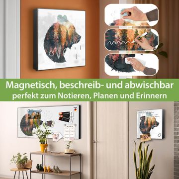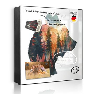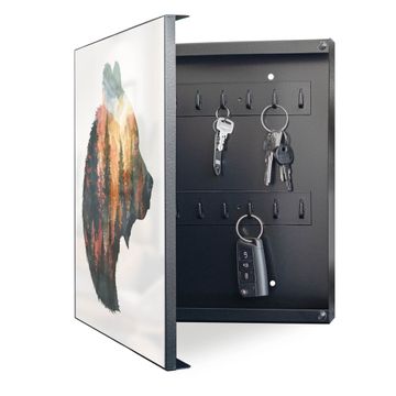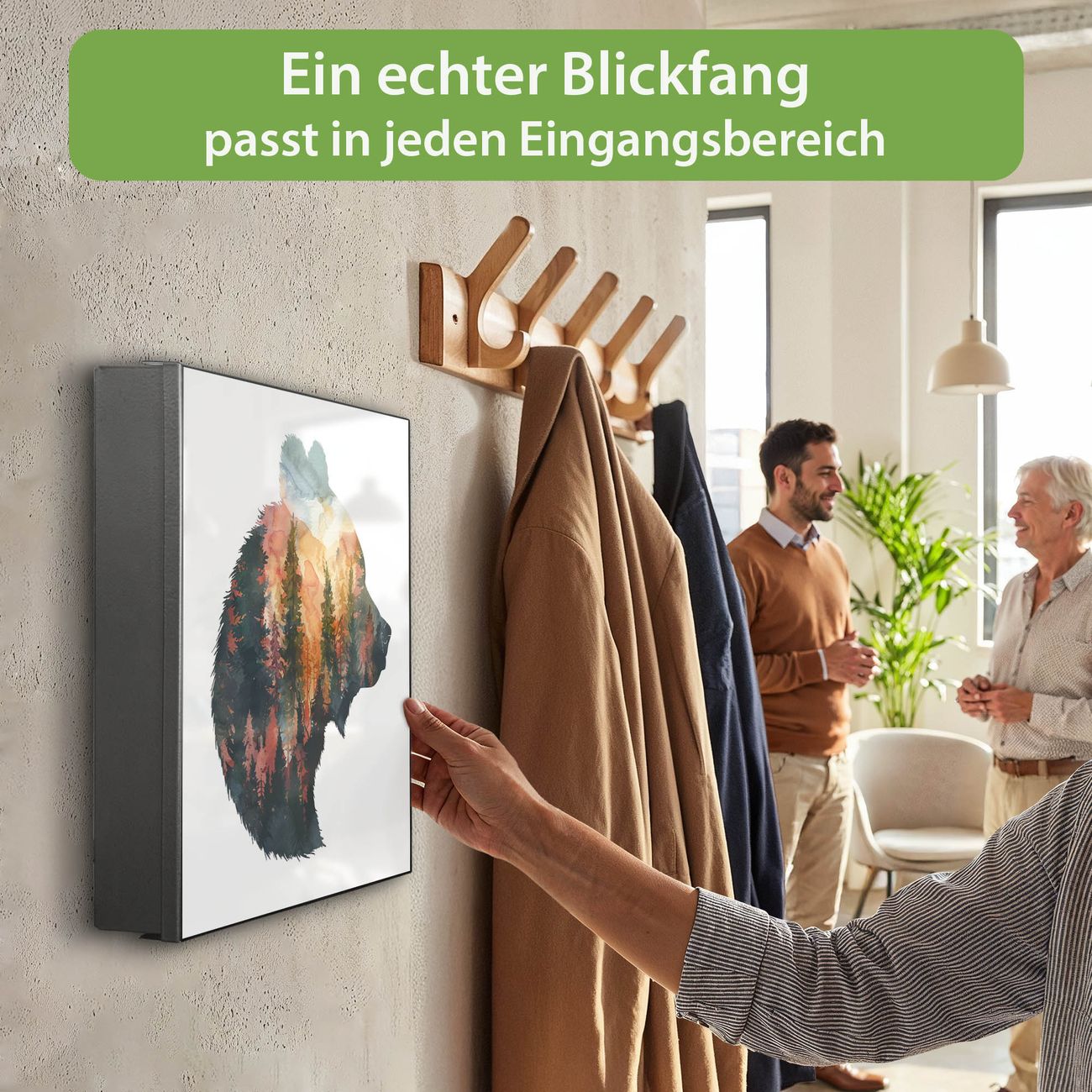 Bringe Ordnung und Eleganz in deinen Eingangsbereich mit dem banjado Schlüsselkasten Motiv Motiv Wald und Bär Silhouette. Die moderne Schlüsselbox kombiniert funktionales Design mit hochwertiger Verarbeitung und wird so zu einem echten Hingucker in Flur, Büro oder Ferienwohnung. ✅ Stilvolle Schlüsselaufbewahrung mit Motiv Motiv Wald und Bär Silhouette Der Design-Schlüsselkasten Motiv Motiv Wald und Bär Silhouette bietet Platz für bis zu 32 Schlüssel, die auf 4 stabilen Reihen mit je 8 Haken übersichtlich verstaut werden. Mit seinen kompakten Maßen von 30 x 30 x 5 cm passt die Schlüsselbox perfekt auch in kleinere Räume. Der schwarz lackierte Stahlkorpus mit links angeschlagenem Türscharnier harmoniert mit gedruckten Folie auf der Front und fügt sich nahtlos in jedes Wohnambiente ein. Ob als Schlüsselorganizer für Zuhause oder als praktische Lösung für Büros, Praxen und Gewerbe, der banjado Schlüsselkasten sorgt für Ordnung und Übersicht. Dank der magnetischen, mit Kreidestiften beschreibbaren Folie auf der Front kannst du Notizen anheften oder Termine direkt auf der Oberfläche festhalten. Die Schlüsselbox Motiv Motiv Wald und Bär Silhouette zur Wandmontage wird inklusive Befestigungsmaterial geliefert und ist schnell angebracht. So hast du deine Schlüssel jederzeit griffbereit und zugleich stilvoll verstaut. Mit diesem banjado Schlüsselkasten Motiv Motiv Wald und Bär Silhouette kombinierst du praktische Aufbewahrung mit stilvollem Wohndesign. Ob privat oder geschäftlich, die Schlüsselbox sorgt für mehr Ordnung, Übersicht und ein wohnliches Ambiente.Vorteile im Überblick