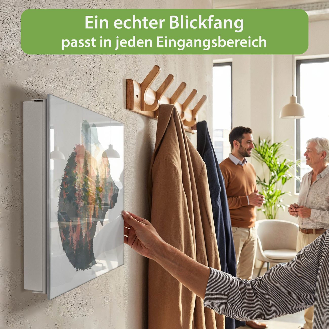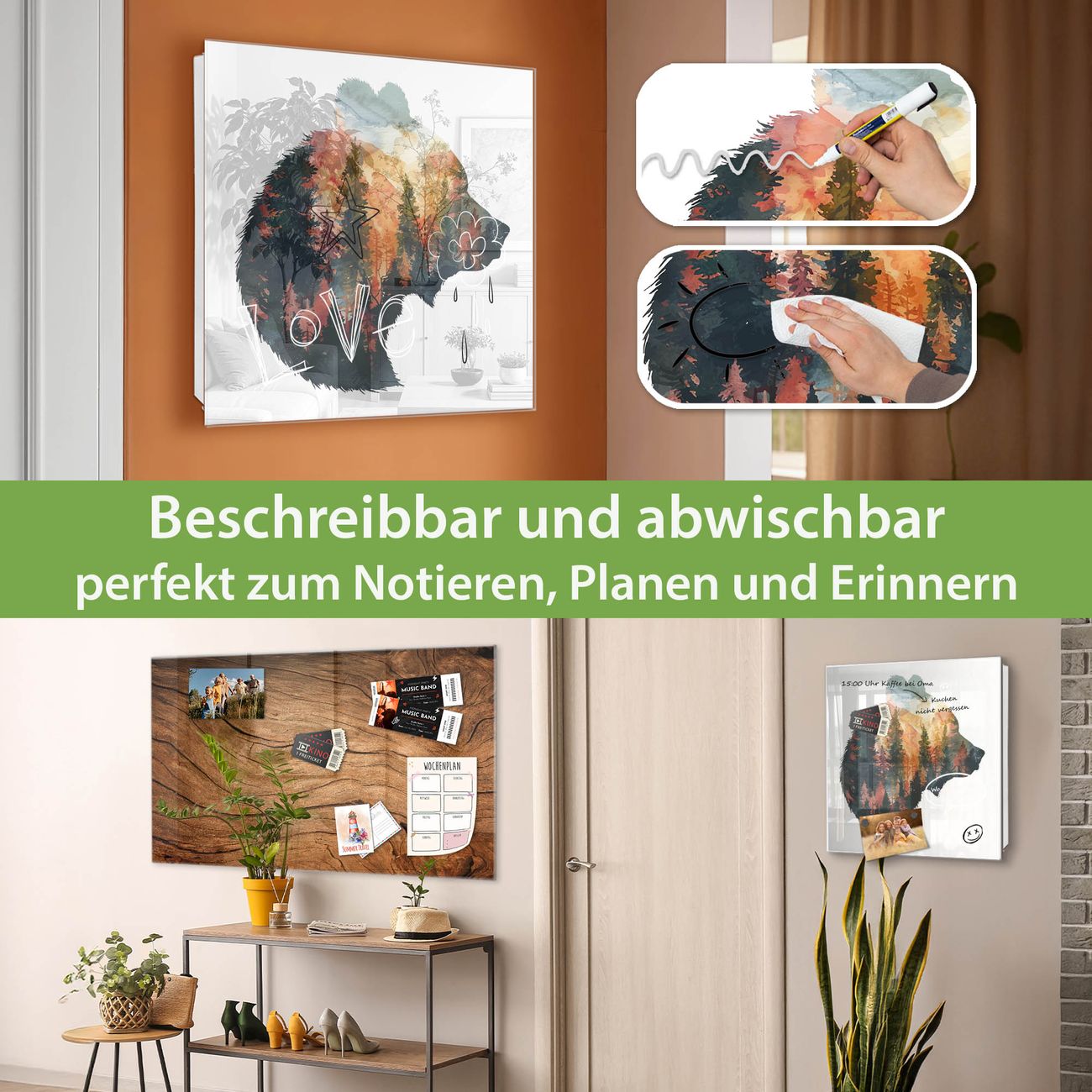 Bringe Ordnung und Eleganz in deinen Eingangsbereich mit dem banjado Schlüsselkasten Motiv Motiv Wald und Bär. Die moderne Schlüsselbox kombiniert funktionales Design mit hochwertiger Verarbeitung und wird so zu einem echten Hingucker in Flur, Büro oder Ferienwohnung. ✅ Stilvolle Schlüsselaufbewahrung mit Glasfront im Motiv Motiv Wald und Bär Der Design-Schlüsselkasten Motiv Motiv Wald und Bär bietet Platz für bis zu 50 Schlüssel, die auf 5 stabilen Reihen mit je 10 Haken übersichtlich verstaut werden. Mit seinen kompakten Maßen von 30 x 30 x 5 cm passt die Schlüsselbox perfekt auch in kleinere Räume. Der weiß lackierte Stahlkorpus mit rechts angeschlagenem Türscharnier harmoniert mit der Glasfront und fügt sich nahtlos in jedes Wohnambiente ein. Ob als Schlüsselorganizer für Zuhause oder als praktische Lösung für Büros, Praxen und Gewerbe, der banjado Schlüsselkasten sorgt für Ordnung und Übersicht. Dank der magnetischen, mit Kreidestiften beschreibbaren Glasfront kannst du Notizen anheften oder Termine direkt auf der Oberfläche festhalten. Die Schlüsselbox Motiv Motiv Wald und Bär zur Wandmontage wird inklusive Befestigungsmaterial geliefert und ist schnell angebracht. So hast du deine Schlüssel jederzeit griffbereit und zugleich stilvoll verstaut. Mit diesem banjado Schlüsselkasten Motiv Motiv Wald und Bär kombinierst du praktische Aufbewahrung mit stilvollem Wohndesign. Ob privat oder geschäftlich, die Schlüsselbox sorgt für mehr Ordnung, Übersicht und ein wohnliches Ambiente.Vorteile im Überblick