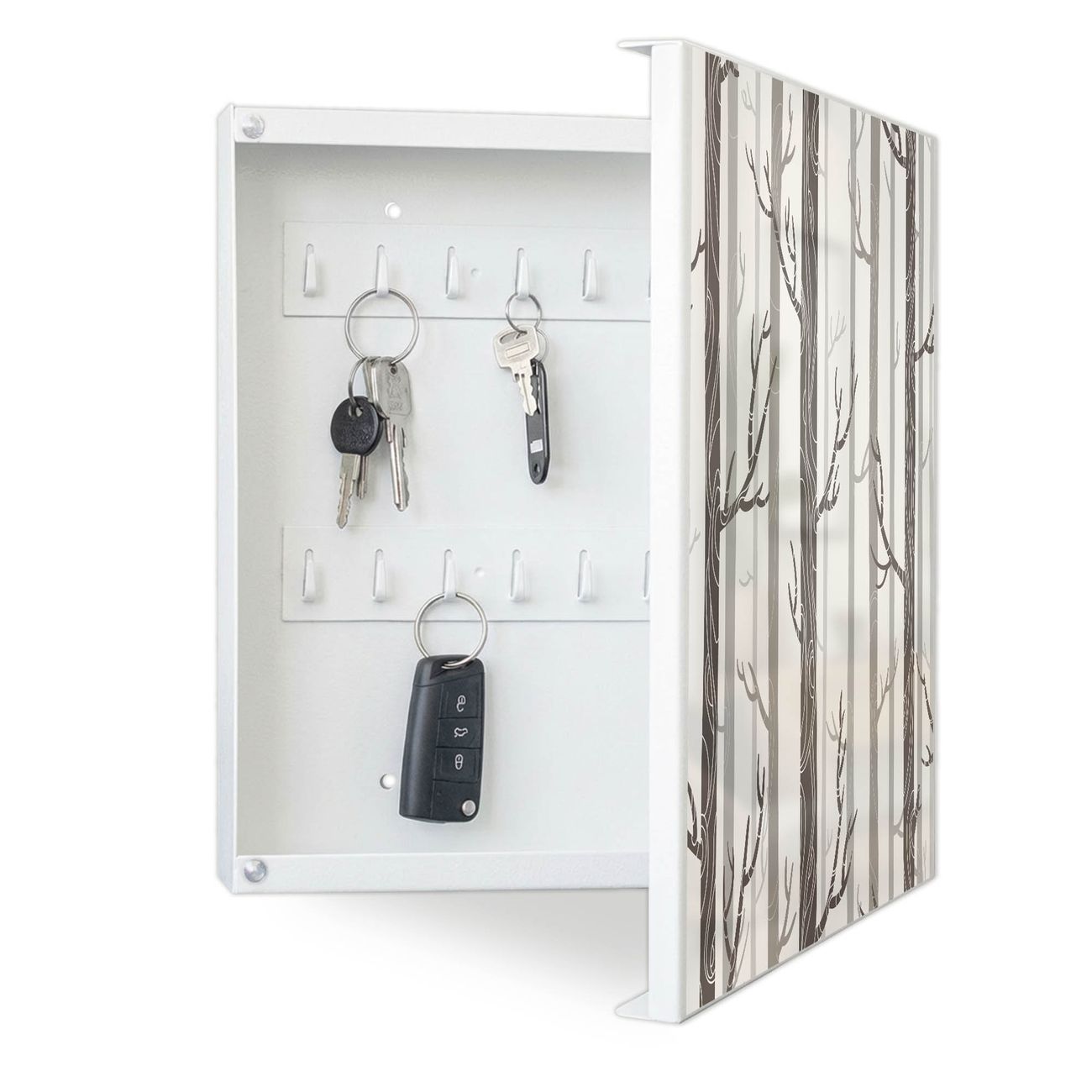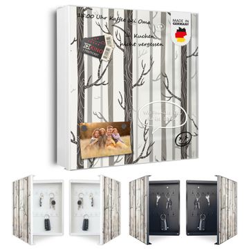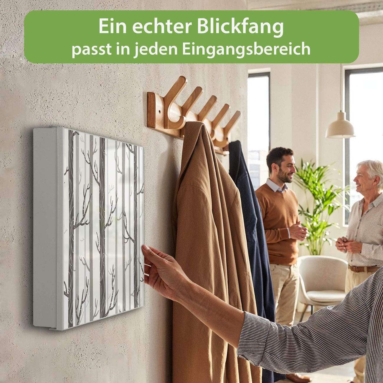 Bringe Ordnung und Eleganz in deinen Eingangsbereich mit dem banjado Schlüsselkasten Motiv Motiv Wald. Die moderne Schlüsselbox kombiniert funktionales Design mit hochwertiger Verarbeitung und wird so zu einem echten Hingucker in Flur, Büro oder Ferienwohnung. ✅ Stilvolle Schlüsselaufbewahrung mit Motiv Motiv Wald Der Design-Schlüsselkasten Motiv Motiv Wald bietet Platz für bis zu 32 Schlüssel, die auf 4 stabilen Reihen mit je 8 Haken übersichtlich verstaut werden. Mit seinen kompakten Maßen von 30 x 30 x 5 cm passt die Schlüsselbox perfekt auch in kleinere Räume. Der weiß lackierte Stahlkorpus mit rechts angeschlagenem Türscharnier harmoniert mit gedruckten Folie auf der Front und fügt sich nahtlos in jedes Wohnambiente ein. Ob als Schlüsselorganizer für Zuhause oder als praktische Lösung für Büros, Praxen und Gewerbe, der banjado Schlüsselkasten sorgt für Ordnung und Übersicht. Dank der magnetischen, mit Kreidestiften beschreibbaren Folie auf der Front kannst du Notizen anheften oder Termine direkt auf der Oberfläche festhalten. Die Schlüsselbox Motiv Motiv Wald zur Wandmontage wird inklusive Befestigungsmaterial geliefert und ist schnell angebracht. So hast du deine Schlüssel jederzeit griffbereit und zugleich stilvoll verstaut. Mit diesem banjado Schlüsselkasten Motiv Motiv Wald kombinierst du praktische Aufbewahrung mit stilvollem Wohndesign. Ob privat oder geschäftlich, die Schlüsselbox sorgt für mehr Ordnung, Übersicht und ein wohnliches Ambiente.Vorteile im Überblick