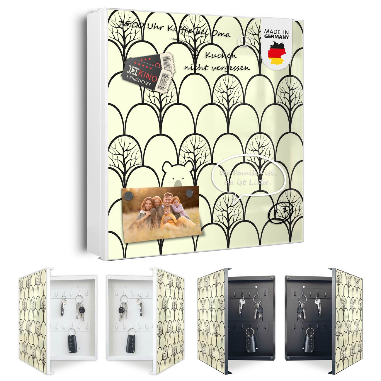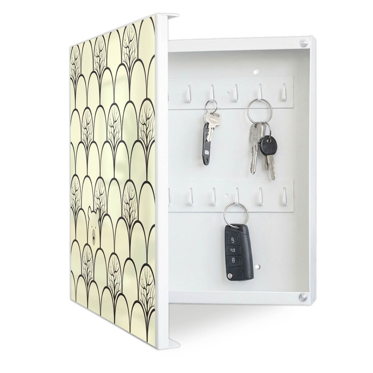 Bringe Ordnung und Eleganz in deinen Eingangsbereich mit dem banjado Schlüsselkasten Motiv Motiv Waldbeeren. Die moderne Schlüsselbox kombiniert funktionales Design mit hochwertiger Verarbeitung und wird so zu einem echten Hingucker in Flur, Büro oder Ferienwohnung. ✅ Stilvolle Schlüsselaufbewahrung mit Motiv Motiv Waldbeeren Der Design-Schlüsselkasten Motiv Motiv Waldbeeren bietet Platz für bis zu 32 Schlüssel, die auf 4 stabilen Reihen mit je 8 Haken übersichtlich verstaut werden. Mit seinen kompakten Maßen von 30 x 30 x 5 cm passt die Schlüsselbox perfekt auch in kleinere Räume. Der weiß lackierte Stahlkorpus mit links angeschlagenem Türscharnier harmoniert mit gedruckten Folie auf der Front und fügt sich nahtlos in jedes Wohnambiente ein. Ob als Schlüsselorganizer für Zuhause oder als praktische Lösung für Büros, Praxen und Gewerbe, der banjado Schlüsselkasten sorgt für Ordnung und Übersicht. Dank der magnetischen, mit Kreidestiften beschreibbaren Folie auf der Front kannst du Notizen anheften oder Termine direkt auf der Oberfläche festhalten. Die Schlüsselbox Motiv Motiv Waldbeeren zur Wandmontage wird inklusive Befestigungsmaterial geliefert und ist schnell angebracht. So hast du deine Schlüssel jederzeit griffbereit und zugleich stilvoll verstaut. Mit diesem banjado Schlüsselkasten Motiv Motiv Waldbeeren kombinierst du praktische Aufbewahrung mit stilvollem Wohndesign. Ob privat oder geschäftlich, die Schlüsselbox sorgt für mehr Ordnung, Übersicht und ein wohnliches Ambiente.Vorteile im Überblick