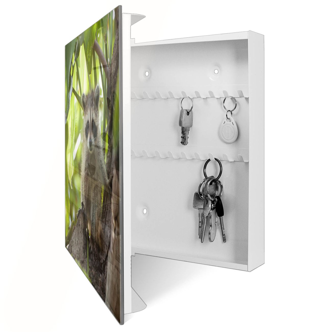 Bringe Ordnung und Eleganz in deinen Eingangsbereich mit dem banjado Schlüsselkasten Motiv Motiv Waschbär. Die moderne Schlüsselbox kombiniert funktionales Design mit hochwertiger Verarbeitung und wird so zu einem echten Hingucker in Flur, Büro oder Ferienwohnung. ✅ Stilvolle Schlüsselaufbewahrung mit Glasfront im Motiv Motiv Waschbär Der Design-Schlüsselkasten Motiv Motiv Waschbär bietet Platz für bis zu 50 Schlüssel, die auf 5 stabilen Reihen mit je 10 Haken übersichtlich verstaut werden. Mit seinen kompakten Maßen von 30 x 30 x 5 cm passt die Schlüsselbox perfekt auch in kleinere Räume. Der weiß lackierte Stahlkorpus mit rechts angeschlagenem Türscharnier harmoniert mit der Glasfront und fügt sich nahtlos in jedes Wohnambiente ein. Ob als Schlüsselorganizer für Zuhause oder als praktische Lösung für Büros, Praxen und Gewerbe, der banjado Schlüsselkasten sorgt für Ordnung und Übersicht. Dank der magnetischen, mit Kreidestiften beschreibbaren Glasfront kannst du Notizen anheften oder Termine direkt auf der Oberfläche festhalten. Die Schlüsselbox Motiv Motiv Waschbär zur Wandmontage wird inklusive Befestigungsmaterial geliefert und ist schnell angebracht. So hast du deine Schlüssel jederzeit griffbereit und zugleich stilvoll verstaut. Mit diesem banjado Schlüsselkasten Motiv Motiv Waschbär kombinierst du praktische Aufbewahrung mit stilvollem Wohndesign. Ob privat oder geschäftlich, die Schlüsselbox sorgt für mehr Ordnung, Übersicht und ein wohnliches Ambiente.Vorteile im Überblick