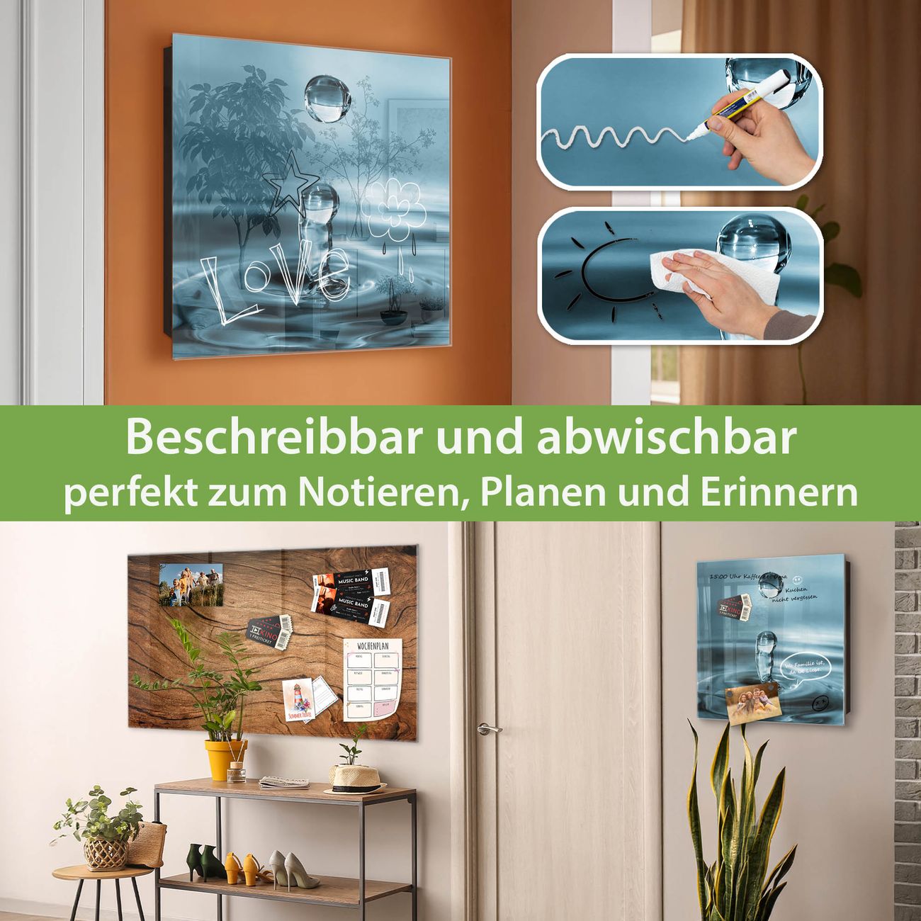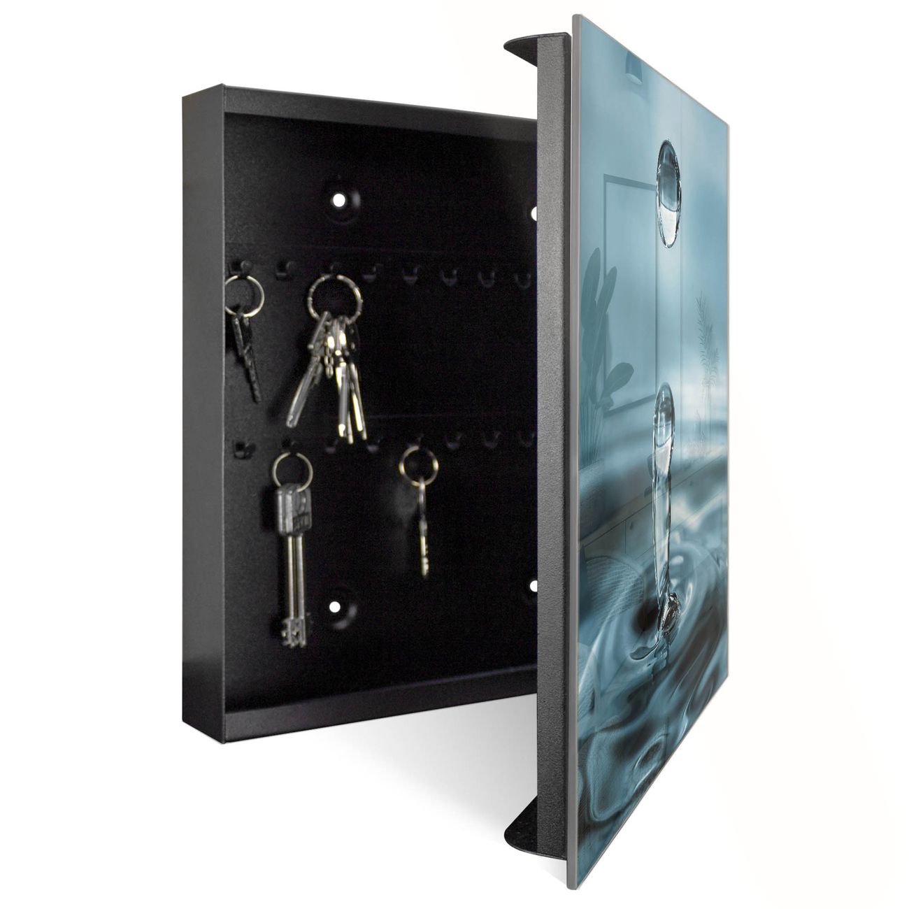 Bringe Ordnung und Eleganz in deinen Eingangsbereich mit dem banjado Schlüsselkasten Motiv Motiv Wassertropfen. Die moderne Schlüsselbox kombiniert funktionales Design mit hochwertiger Verarbeitung und wird so zu einem echten Hingucker in Flur, Büro oder Ferienwohnung. ✅ Stilvolle Schlüsselaufbewahrung mit Glasfront im Motiv Motiv Wassertropfen Der Design-Schlüsselkasten Motiv Motiv Wassertropfen bietet Platz für bis zu 50 Schlüssel, die auf 5 stabilen Reihen mit je 10 Haken übersichtlich verstaut werden. Mit seinen kompakten Maßen von 30 x 30 x 5 cm passt die Schlüsselbox perfekt auch in kleinere Räume. Der schwarz lackierte Stahlkorpus mit rechts angeschlagenem Türscharnier harmoniert mit der Glasfront und fügt sich nahtlos in jedes Wohnambiente ein. Ob als Schlüsselorganizer für Zuhause oder als praktische Lösung für Büros, Praxen und Gewerbe, der banjado Schlüsselkasten sorgt für Ordnung und Übersicht. Dank der magnetischen, mit Kreidestiften beschreibbaren Glasfront kannst du Notizen anheften oder Termine direkt auf der Oberfläche festhalten. Die Schlüsselbox Motiv Motiv Wassertropfen zur Wandmontage wird inklusive Befestigungsmaterial geliefert und ist schnell angebracht. So hast du deine Schlüssel jederzeit griffbereit und zugleich stilvoll verstaut. Mit diesem banjado Schlüsselkasten Motiv Motiv Wassertropfen kombinierst du praktische Aufbewahrung mit stilvollem Wohndesign. Ob privat oder geschäftlich, die Schlüsselbox sorgt für mehr Ordnung, Übersicht und ein wohnliches Ambiente.Vorteile im Überblick