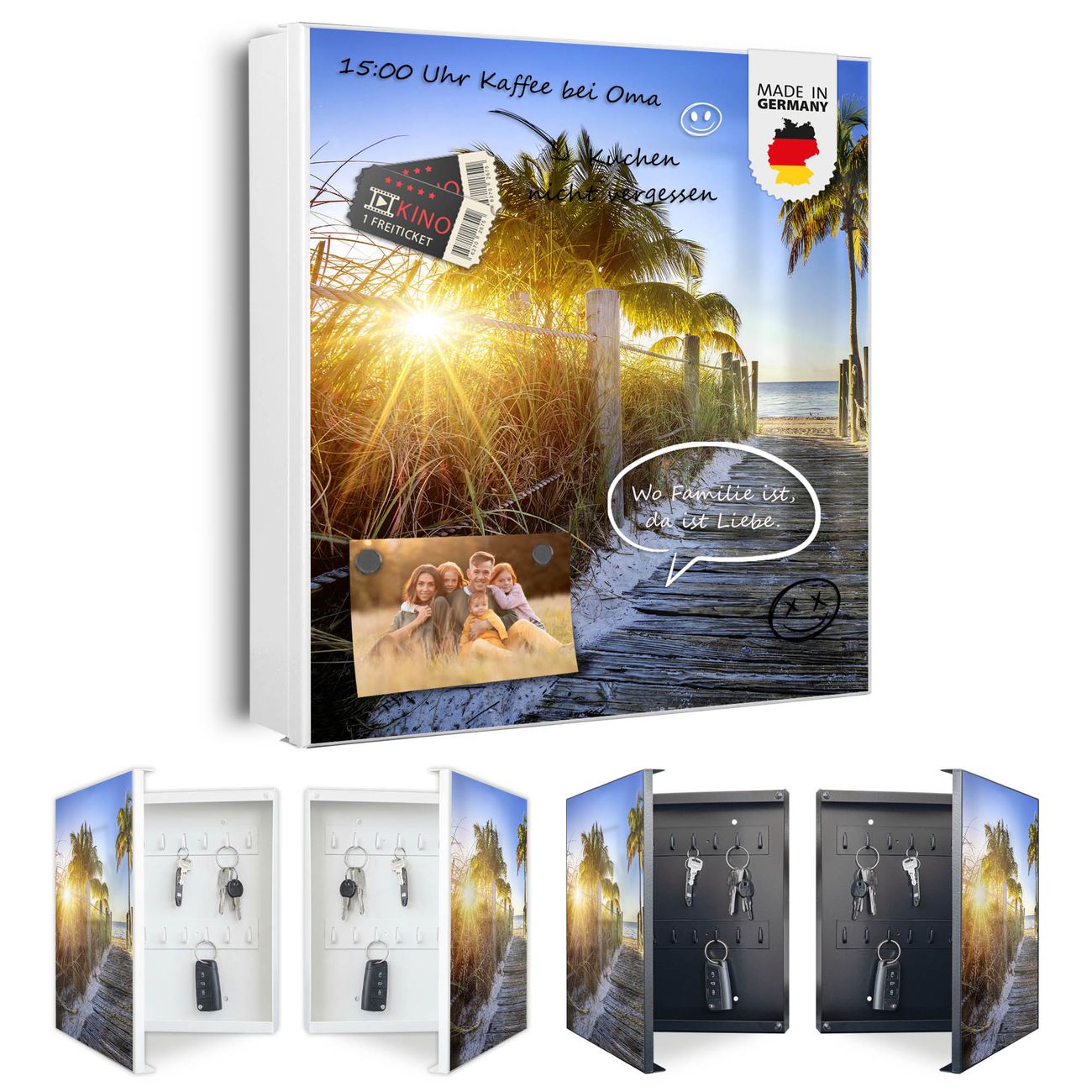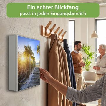 Bringe Ordnung und Eleganz in deinen Eingangsbereich mit dem banjado Schlüsselkasten Motiv Motiv Weg zum Strand. Die moderne Schlüsselbox kombiniert funktionales Design mit hochwertiger Verarbeitung und wird so zu einem echten Hingucker in Flur, Büro oder Ferienwohnung. ✅ Stilvolle Schlüsselaufbewahrung mit Motiv Motiv Weg zum Strand Der Design-Schlüsselkasten Motiv Motiv Weg zum Strand bietet Platz für bis zu 32 Schlüssel, die auf 4 stabilen Reihen mit je 8 Haken übersichtlich verstaut werden. Mit seinen kompakten Maßen von 30 x 30 x 5 cm passt die Schlüsselbox perfekt auch in kleinere Räume. Der weiß lackierte Stahlkorpus mit links angeschlagenem Türscharnier harmoniert mit gedruckten Folie auf der Front und fügt sich nahtlos in jedes Wohnambiente ein. Ob als Schlüsselorganizer für Zuhause oder als praktische Lösung für Büros, Praxen und Gewerbe, der banjado Schlüsselkasten sorgt für Ordnung und Übersicht. Dank der magnetischen, mit Kreidestiften beschreibbaren Folie auf der Front kannst du Notizen anheften oder Termine direkt auf der Oberfläche festhalten. Die Schlüsselbox Motiv Motiv Weg zum Strand zur Wandmontage wird inklusive Befestigungsmaterial geliefert und ist schnell angebracht. So hast du deine Schlüssel jederzeit griffbereit und zugleich stilvoll verstaut. Mit diesem banjado Schlüsselkasten Motiv Motiv Weg zum Strand kombinierst du praktische Aufbewahrung mit stilvollem Wohndesign. Ob privat oder geschäftlich, die Schlüsselbox sorgt für mehr Ordnung, Übersicht und ein wohnliches Ambiente.Vorteile im Überblick
