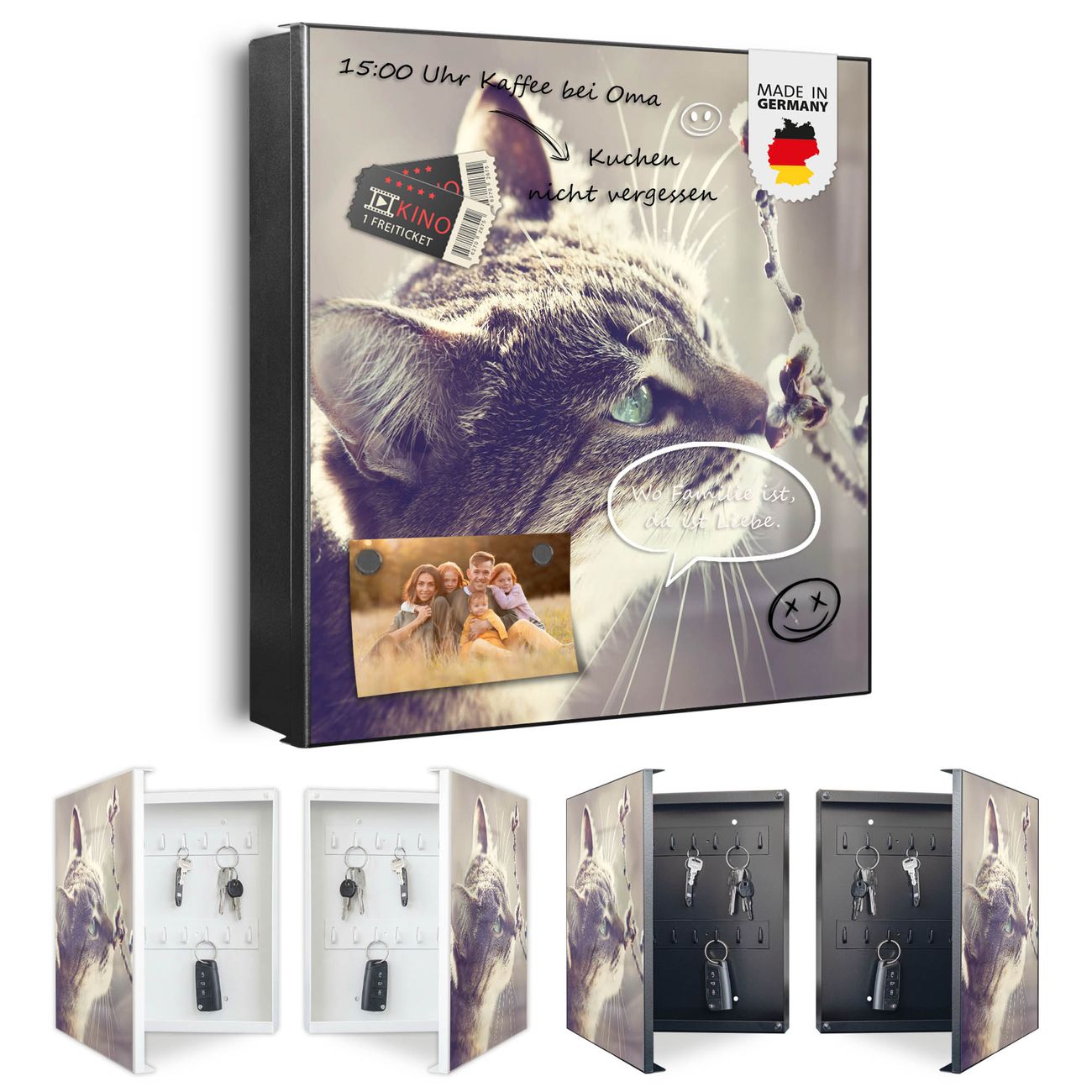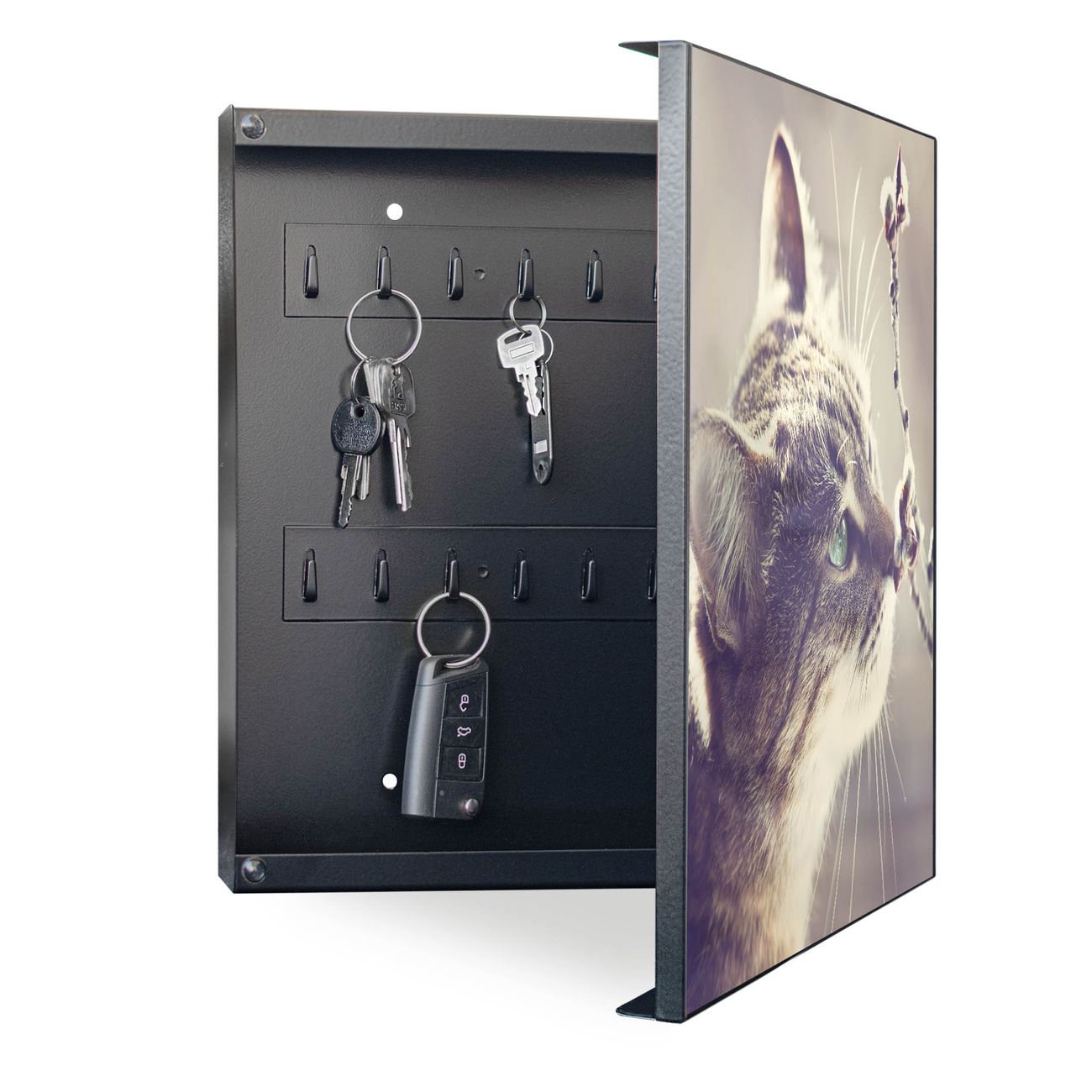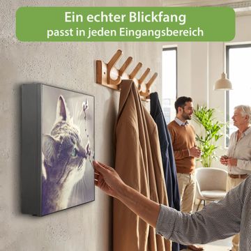 Bringe Ordnung und Eleganz in deinen Eingangsbereich mit dem banjado Schlüsselkasten Motiv Motiv Weidenkätzchen. Die moderne Schlüsselbox kombiniert funktionales Design mit hochwertiger Verarbeitung und wird so zu einem echten Hingucker in Flur, Büro oder Ferienwohnung. ✅ Stilvolle Schlüsselaufbewahrung mit Motiv Motiv Weidenkätzchen Der Design-Schlüsselkasten Motiv Motiv Weidenkätzchen bietet Platz für bis zu 32 Schlüssel, die auf 4 stabilen Reihen mit je 8 Haken übersichtlich verstaut werden. Mit seinen kompakten Maßen von 30 x 30 x 5 cm passt die Schlüsselbox perfekt auch in kleinere Räume. Der schwarz lackierte Stahlkorpus mit rechts angeschlagenem Türscharnier harmoniert mit gedruckten Folie auf der Front und fügt sich nahtlos in jedes Wohnambiente ein. Ob als Schlüsselorganizer für Zuhause oder als praktische Lösung für Büros, Praxen und Gewerbe, der banjado Schlüsselkasten sorgt für Ordnung und Übersicht. Dank der magnetischen, mit Kreidestiften beschreibbaren Folie auf der Front kannst du Notizen anheften oder Termine direkt auf der Oberfläche festhalten. Die Schlüsselbox Motiv Motiv Weidenkätzchen zur Wandmontage wird inklusive Befestigungsmaterial geliefert und ist schnell angebracht. So hast du deine Schlüssel jederzeit griffbereit und zugleich stilvoll verstaut. Mit diesem banjado Schlüsselkasten Motiv Motiv Weidenkätzchen kombinierst du praktische Aufbewahrung mit stilvollem Wohndesign. Ob privat oder geschäftlich, die Schlüsselbox sorgt für mehr Ordnung, Übersicht und ein wohnliches Ambiente.Vorteile im Überblick