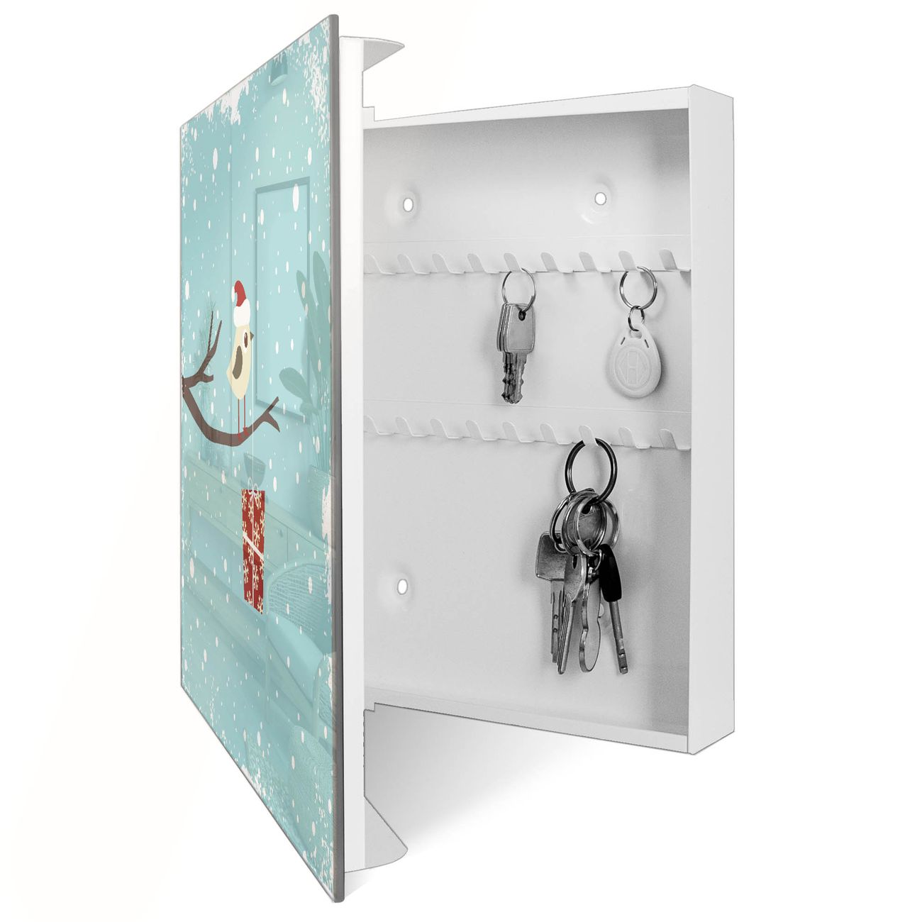 Bringe Ordnung und Eleganz in deinen Eingangsbereich mit dem banjado Schlüsselkasten Motiv Motiv Weihnachten. Die moderne Schlüsselbox kombiniert funktionales Design mit hochwertiger Verarbeitung und wird so zu einem echten Hingucker in Flur, Büro oder Ferienwohnung. ✅ Stilvolle Schlüsselaufbewahrung mit Glasfront im Motiv Motiv Weihnachten Der Design-Schlüsselkasten Motiv Motiv Weihnachten bietet Platz für bis zu 50 Schlüssel, die auf 5 stabilen Reihen mit je 10 Haken übersichtlich verstaut werden. Mit seinen kompakten Maßen von 30 x 30 x 5 cm passt die Schlüsselbox perfekt auch in kleinere Räume. Der weiß lackierte Stahlkorpus mit rechts angeschlagenem Türscharnier harmoniert mit der Glasfront und fügt sich nahtlos in jedes Wohnambiente ein. Ob als Schlüsselorganizer für Zuhause oder als praktische Lösung für Büros, Praxen und Gewerbe, der banjado Schlüsselkasten sorgt für Ordnung und Übersicht. Dank der magnetischen, mit Kreidestiften beschreibbaren Glasfront kannst du Notizen anheften oder Termine direkt auf der Oberfläche festhalten. Die Schlüsselbox Motiv Motiv Weihnachten zur Wandmontage wird inklusive Befestigungsmaterial geliefert und ist schnell angebracht. So hast du deine Schlüssel jederzeit griffbereit und zugleich stilvoll verstaut. Mit diesem banjado Schlüsselkasten Motiv Motiv Weihnachten kombinierst du praktische Aufbewahrung mit stilvollem Wohndesign. Ob privat oder geschäftlich, die Schlüsselbox sorgt für mehr Ordnung, Übersicht und ein wohnliches Ambiente.Vorteile im Überblick