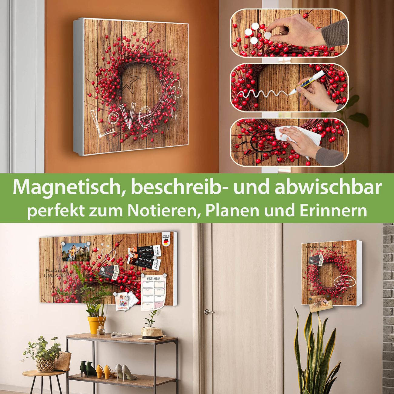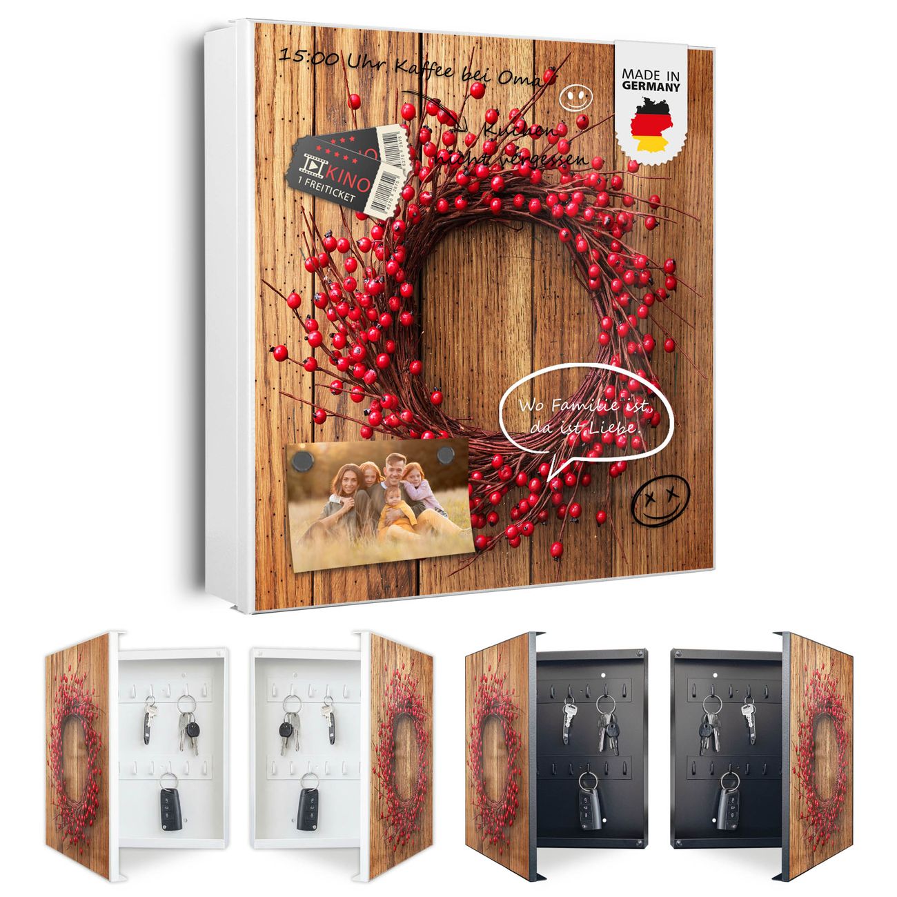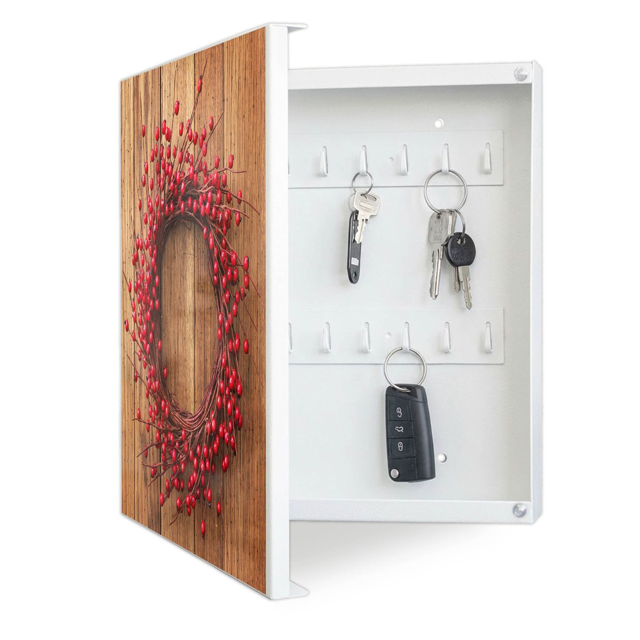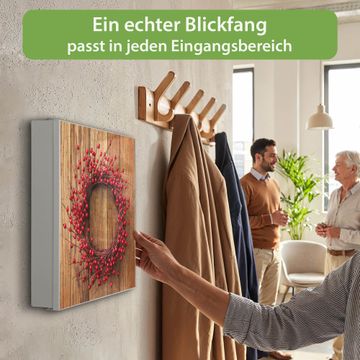 Bringe Ordnung und Eleganz in deinen Eingangsbereich mit dem banjado Schlüsselkasten Motiv Motiv Weihnachtskranz. Die moderne Schlüsselbox kombiniert funktionales Design mit hochwertiger Verarbeitung und wird so zu einem echten Hingucker in Flur, Büro oder Ferienwohnung. ✅ Stilvolle Schlüsselaufbewahrung mit Motiv Motiv Weihnachtskranz Der Design-Schlüsselkasten Motiv Motiv Weihnachtskranz bietet Platz für bis zu 32 Schlüssel, die auf 4 stabilen Reihen mit je 8 Haken übersichtlich verstaut werden. Mit seinen kompakten Maßen von 30 x 30 x 5 cm passt die Schlüsselbox perfekt auch in kleinere Räume. Der weiß lackierte Stahlkorpus mit links angeschlagenem Türscharnier harmoniert mit gedruckten Folie auf der Front und fügt sich nahtlos in jedes Wohnambiente ein. Ob als Schlüsselorganizer für Zuhause oder als praktische Lösung für Büros, Praxen und Gewerbe, der banjado Schlüsselkasten sorgt für Ordnung und Übersicht. Dank der magnetischen, mit Kreidestiften beschreibbaren Folie auf der Front kannst du Notizen anheften oder Termine direkt auf der Oberfläche festhalten. Die Schlüsselbox Motiv Motiv Weihnachtskranz zur Wandmontage wird inklusive Befestigungsmaterial geliefert und ist schnell angebracht. So hast du deine Schlüssel jederzeit griffbereit und zugleich stilvoll verstaut. Mit diesem banjado Schlüsselkasten Motiv Motiv Weihnachtskranz kombinierst du praktische Aufbewahrung mit stilvollem Wohndesign. Ob privat oder geschäftlich, die Schlüsselbox sorgt für mehr Ordnung, Übersicht und ein wohnliches Ambiente.Vorteile im Überblick