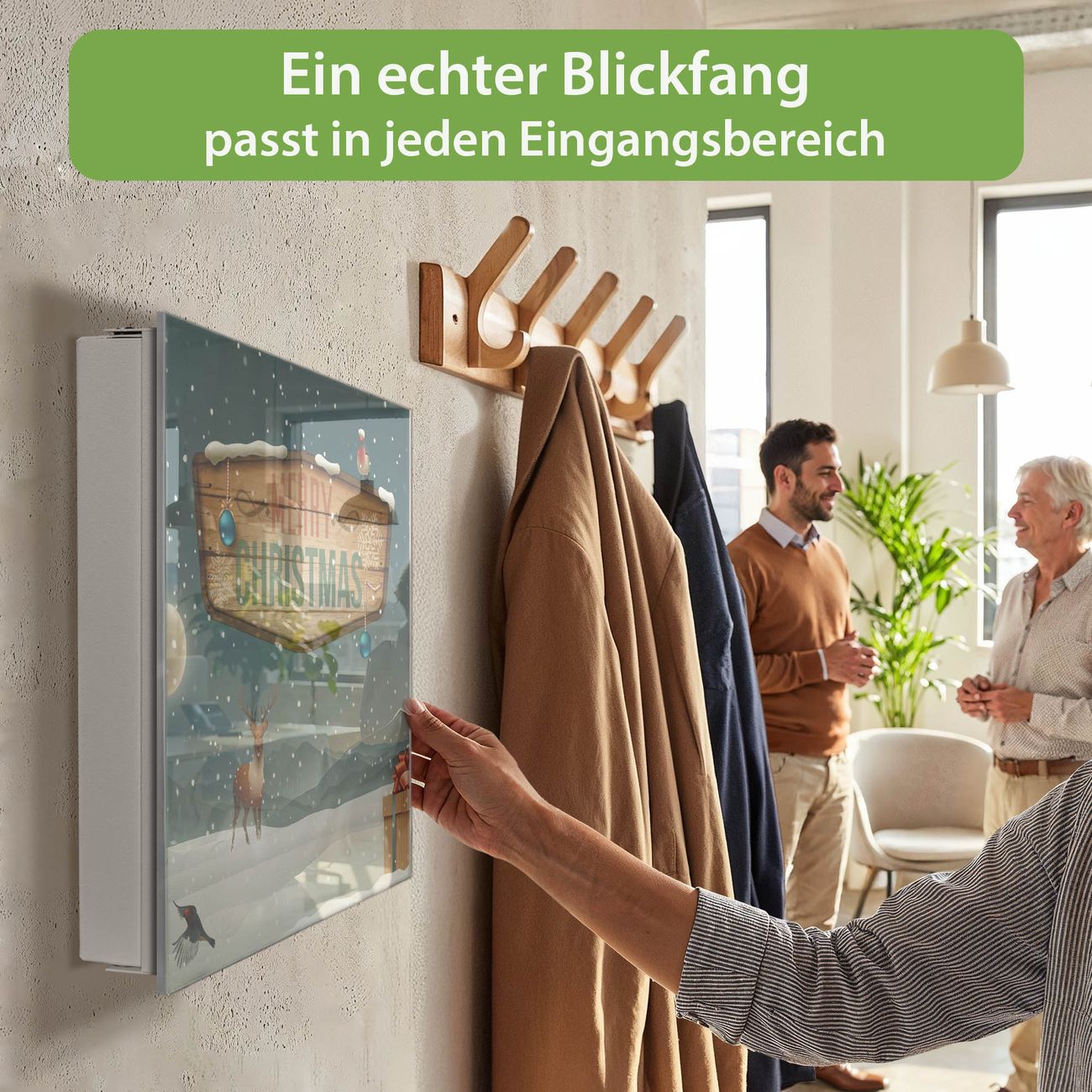Bringe Ordnung und Eleganz in deinen Eingangsbereich mit dem banjado Schlüsselkasten Motiv Motiv Weihnachtsland. Die moderne Schlüsselbox kombiniert funktionales Design mit hochwertiger Verarbeitung und wird so zu einem echten Hingucker in Flur, Büro oder Ferienwohnung. ✅ Stilvolle Schlüsselaufbewahrung mit Glasfront im Motiv Motiv Weihnachtsland Der Design-Schlüsselkasten Motiv Motiv Weihnachtsland bietet Platz für bis zu 50 Schlüssel, die auf 5 stabilen Reihen mit je 10 Haken übersichtlich verstaut werden. Mit seinen kompakten Maßen von 30 x 30 x 5 cm passt die Schlüsselbox perfekt auch in kleinere Räume. Der weiß lackierte Stahlkorpus mit rechts angeschlagenem Türscharnier harmoniert mit der Glasfront und fügt sich nahtlos in jedes Wohnambiente ein. Ob als Schlüsselorganizer für Zuhause oder als praktische Lösung für Büros, Praxen und Gewerbe, der banjado Schlüsselkasten sorgt für Ordnung und Übersicht. Dank der magnetischen, mit Kreidestiften beschreibbaren Glasfront kannst du Notizen anheften oder Termine direkt auf der Oberfläche festhalten. Die Schlüsselbox Motiv Motiv Weihnachtsland zur Wandmontage wird inklusive Befestigungsmaterial geliefert und ist schnell angebracht. So hast du deine Schlüssel jederzeit griffbereit und zugleich stilvoll verstaut. Mit diesem banjado Schlüsselkasten Motiv Motiv Weihnachtsland kombinierst du praktische Aufbewahrung mit stilvollem Wohndesign. Ob privat oder geschäftlich, die Schlüsselbox sorgt für mehr Ordnung, Übersicht und ein wohnliches Ambiente.Vorteile im Überblick