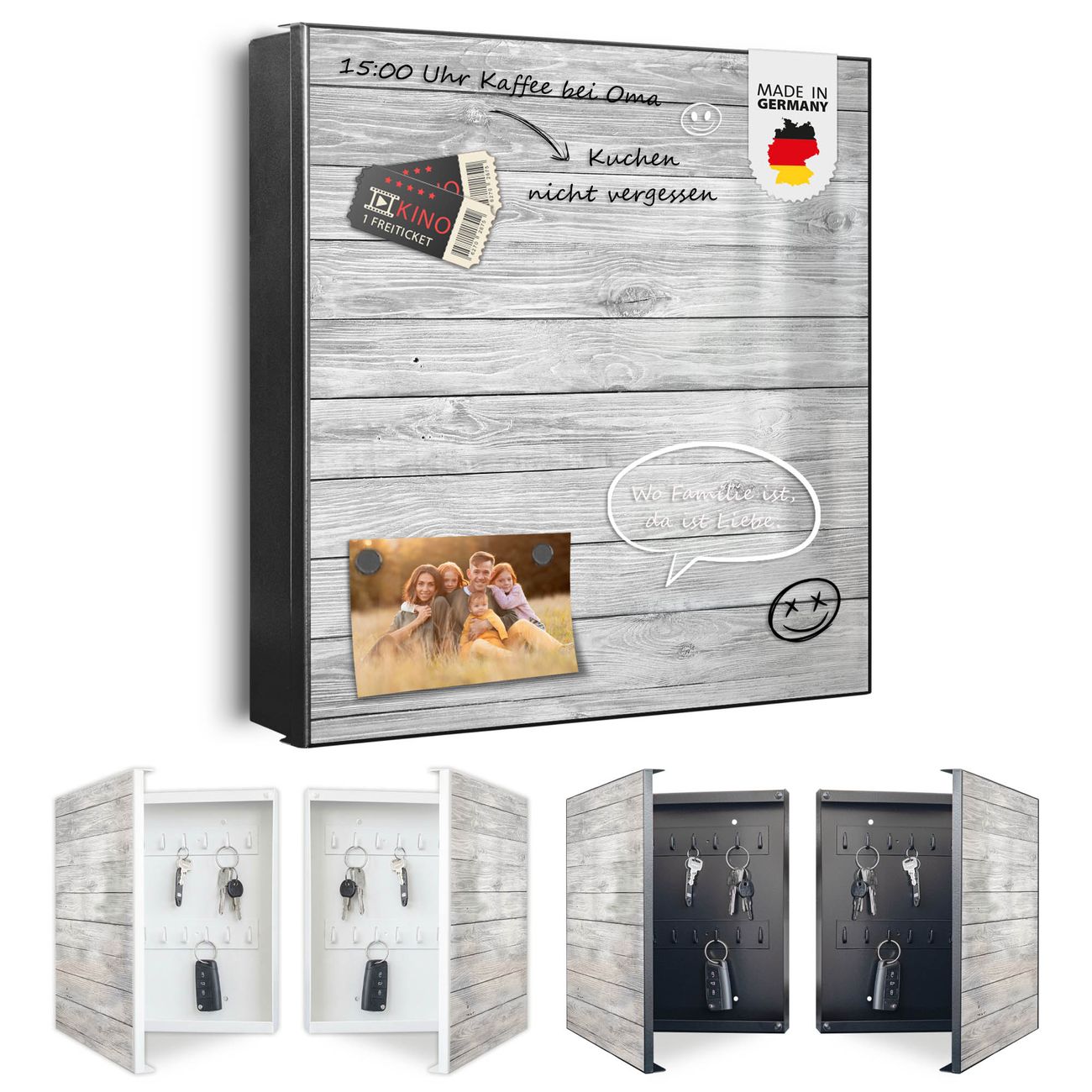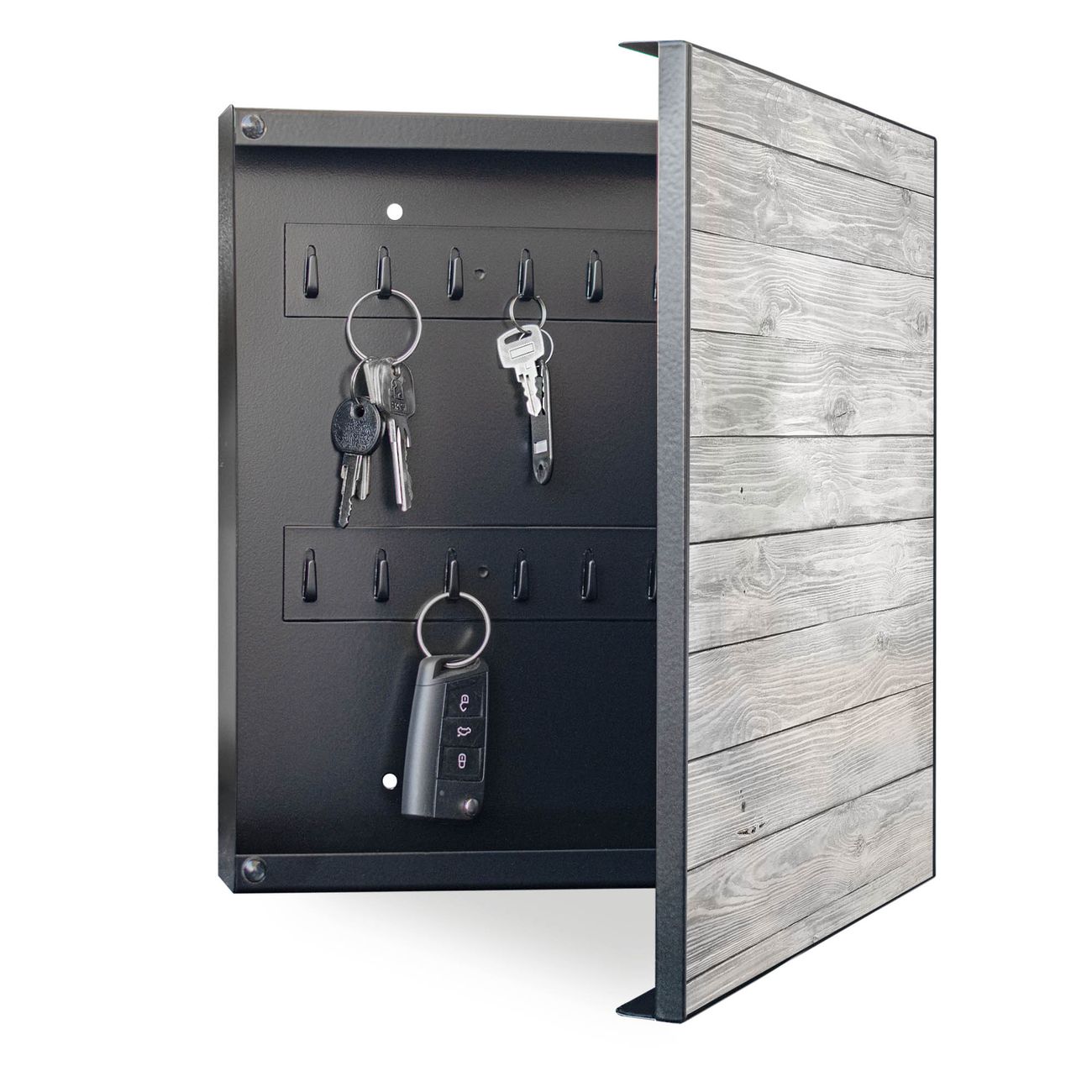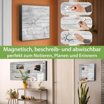 Bringe Ordnung und Eleganz in deinen Eingangsbereich mit dem banjado Schlüsselkasten Motiv Motiv Weiß Gebeizt. Die moderne Schlüsselbox kombiniert funktionales Design mit hochwertiger Verarbeitung und wird so zu einem echten Hingucker in Flur, Büro oder Ferienwohnung. ✅ Stilvolle Schlüsselaufbewahrung mit Motiv Motiv Weiß Gebeizt Der Design-Schlüsselkasten Motiv Motiv Weiß Gebeizt bietet Platz für bis zu 32 Schlüssel, die auf 4 stabilen Reihen mit je 8 Haken übersichtlich verstaut werden. Mit seinen kompakten Maßen von 30 x 30 x 5 cm passt die Schlüsselbox perfekt auch in kleinere Räume. Der schwarz lackierte Stahlkorpus mit rechts angeschlagenem Türscharnier harmoniert mit gedruckten Folie auf der Front und fügt sich nahtlos in jedes Wohnambiente ein. Ob als Schlüsselorganizer für Zuhause oder als praktische Lösung für Büros, Praxen und Gewerbe, der banjado Schlüsselkasten sorgt für Ordnung und Übersicht. Dank der magnetischen, mit Kreidestiften beschreibbaren Folie auf der Front kannst du Notizen anheften oder Termine direkt auf der Oberfläche festhalten. Die Schlüsselbox Motiv Motiv Weiß Gebeizt zur Wandmontage wird inklusive Befestigungsmaterial geliefert und ist schnell angebracht. So hast du deine Schlüssel jederzeit griffbereit und zugleich stilvoll verstaut. Mit diesem banjado Schlüsselkasten Motiv Motiv Weiß Gebeizt kombinierst du praktische Aufbewahrung mit stilvollem Wohndesign. Ob privat oder geschäftlich, die Schlüsselbox sorgt für mehr Ordnung, Übersicht und ein wohnliches Ambiente.Vorteile im Überblick