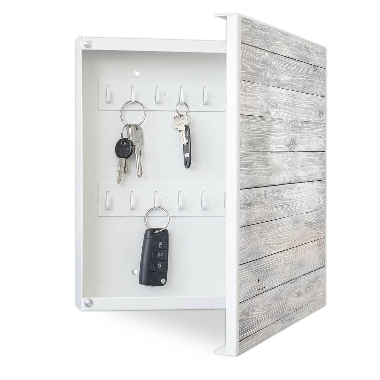 Bringe Ordnung und Eleganz in deinen Eingangsbereich mit dem banjado Schlüsselkasten Motiv Motiv Weiß Gebeizt. Die moderne Schlüsselbox kombiniert funktionales Design mit hochwertiger Verarbeitung und wird so zu einem echten Hingucker in Flur, Büro oder Ferienwohnung. ✅ Stilvolle Schlüsselaufbewahrung mit Motiv Motiv Weiß Gebeizt Der Design-Schlüsselkasten Motiv Motiv Weiß Gebeizt bietet Platz für bis zu 32 Schlüssel, die auf 4 stabilen Reihen mit je 8 Haken übersichtlich verstaut werden. Mit seinen kompakten Maßen von 30 x 30 x 5 cm passt die Schlüsselbox perfekt auch in kleinere Räume. Der weiß lackierte Stahlkorpus mit rechts angeschlagenem Türscharnier harmoniert mit gedruckten Folie auf der Front und fügt sich nahtlos in jedes Wohnambiente ein. Ob als Schlüsselorganizer für Zuhause oder als praktische Lösung für Büros, Praxen und Gewerbe, der banjado Schlüsselkasten sorgt für Ordnung und Übersicht. Dank der magnetischen, mit Kreidestiften beschreibbaren Folie auf der Front kannst du Notizen anheften oder Termine direkt auf der Oberfläche festhalten. Die Schlüsselbox Motiv Motiv Weiß Gebeizt zur Wandmontage wird inklusive Befestigungsmaterial geliefert und ist schnell angebracht. So hast du deine Schlüssel jederzeit griffbereit und zugleich stilvoll verstaut. Mit diesem banjado Schlüsselkasten Motiv Motiv Weiß Gebeizt kombinierst du praktische Aufbewahrung mit stilvollem Wohndesign. Ob privat oder geschäftlich, die Schlüsselbox sorgt für mehr Ordnung, Übersicht und ein wohnliches Ambiente.Vorteile im Überblick