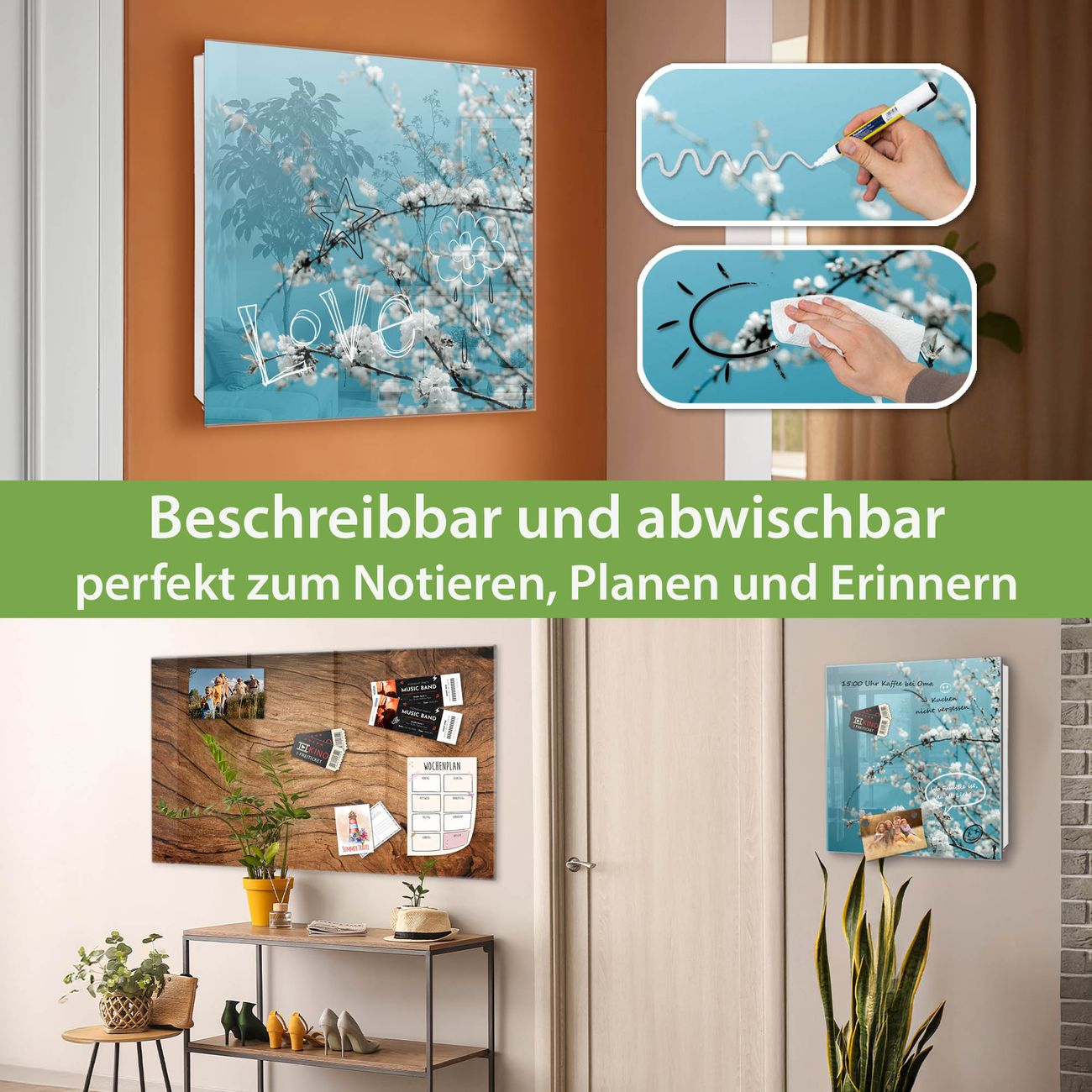 Bringe Ordnung und Eleganz in deinen Eingangsbereich mit dem banjado Schlüsselkasten Motiv Motiv weiße Kirschblüten. Die moderne Schlüsselbox kombiniert funktionales Design mit hochwertiger Verarbeitung und wird so zu einem echten Hingucker in Flur, Büro oder Ferienwohnung. ✅ Stilvolle Schlüsselaufbewahrung mit Glasfront im Motiv Motiv weiße Kirschblüten Der Design-Schlüsselkasten Motiv Motiv weiße Kirschblüten bietet Platz für bis zu 50 Schlüssel, die auf 5 stabilen Reihen mit je 10 Haken übersichtlich verstaut werden. Mit seinen kompakten Maßen von 30 x 30 x 5 cm passt die Schlüsselbox perfekt auch in kleinere Räume. Der weiß lackierte Stahlkorpus mit rechts angeschlagenem Türscharnier harmoniert mit der Glasfront und fügt sich nahtlos in jedes Wohnambiente ein. Ob als Schlüsselorganizer für Zuhause oder als praktische Lösung für Büros, Praxen und Gewerbe, der banjado Schlüsselkasten sorgt für Ordnung und Übersicht. Dank der magnetischen, mit Kreidestiften beschreibbaren Glasfront kannst du Notizen anheften oder Termine direkt auf der Oberfläche festhalten. Die Schlüsselbox Motiv Motiv weiße Kirschblüten zur Wandmontage wird inklusive Befestigungsmaterial geliefert und ist schnell angebracht. So hast du deine Schlüssel jederzeit griffbereit und zugleich stilvoll verstaut. Mit diesem banjado Schlüsselkasten Motiv Motiv weiße Kirschblüten kombinierst du praktische Aufbewahrung mit stilvollem Wohndesign. Ob privat oder geschäftlich, die Schlüsselbox sorgt für mehr Ordnung, Übersicht und ein wohnliches Ambiente.Vorteile im Überblick