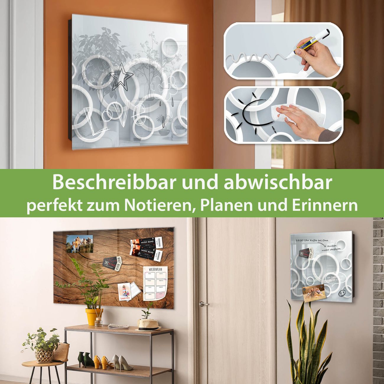 ✅ Magnetisch und mit Kreidestift beschreibbar, gehärtetes Glas, links angeschlagene TürOrdnung und Design in einem