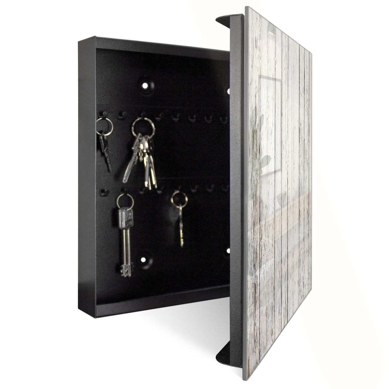 Bringe Ordnung und Eleganz in deinen Eingangsbereich mit dem banjado Schlüsselkasten Motiv Motiv Weißer Bretterzaun. Die moderne Schlüsselbox kombiniert funktionales Design mit hochwertiger Verarbeitung und wird so zu einem echten Hingucker in Flur, Büro oder Ferienwohnung. ✅ Stilvolle Schlüsselaufbewahrung mit Glasfront im Motiv Motiv Weißer Bretterzaun Der Design-Schlüsselkasten Motiv Motiv Weißer Bretterzaun bietet Platz für bis zu 50 Schlüssel, die auf 5 stabilen Reihen mit je 10 Haken übersichtlich verstaut werden. Mit seinen kompakten Maßen von 30 x 30 x 5 cm passt die Schlüsselbox perfekt auch in kleinere Räume. Der schwarz lackierte Stahlkorpus mit rechts angeschlagenem Türscharnier harmoniert mit der Glasfront und fügt sich nahtlos in jedes Wohnambiente ein. Ob als Schlüsselorganizer für Zuhause oder als praktische Lösung für Büros, Praxen und Gewerbe, der banjado Schlüsselkasten sorgt für Ordnung und Übersicht. Dank der magnetischen, mit Kreidestiften beschreibbaren Glasfront kannst du Notizen anheften oder Termine direkt auf der Oberfläche festhalten. Die Schlüsselbox Motiv Motiv Weißer Bretterzaun zur Wandmontage wird inklusive Befestigungsmaterial geliefert und ist schnell angebracht. So hast du deine Schlüssel jederzeit griffbereit und zugleich stilvoll verstaut. Mit diesem banjado Schlüsselkasten Motiv Motiv Weißer Bretterzaun kombinierst du praktische Aufbewahrung mit stilvollem Wohndesign. Ob privat oder geschäftlich, die Schlüsselbox sorgt für mehr Ordnung, Übersicht und ein wohnliches Ambiente.Vorteile im Überblick