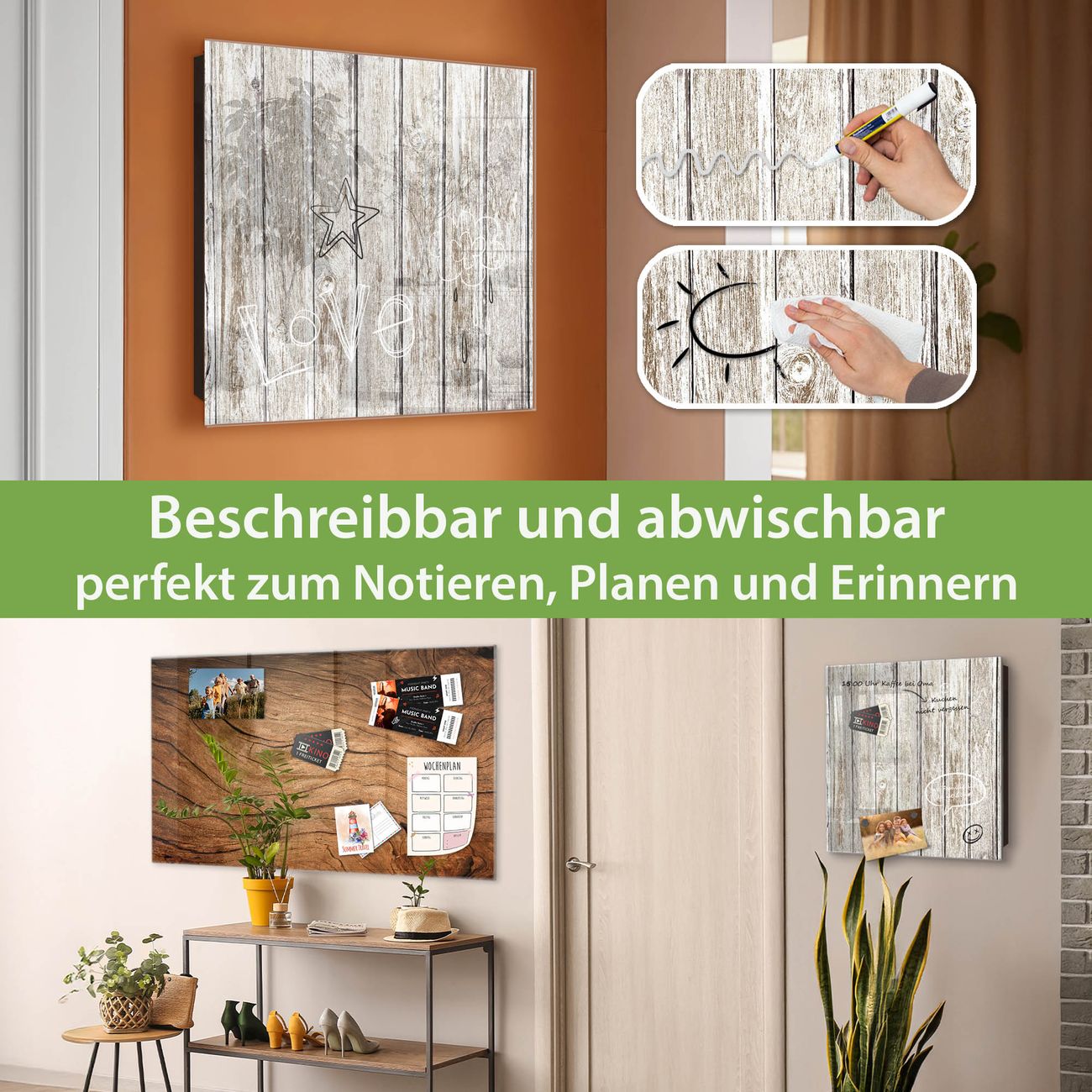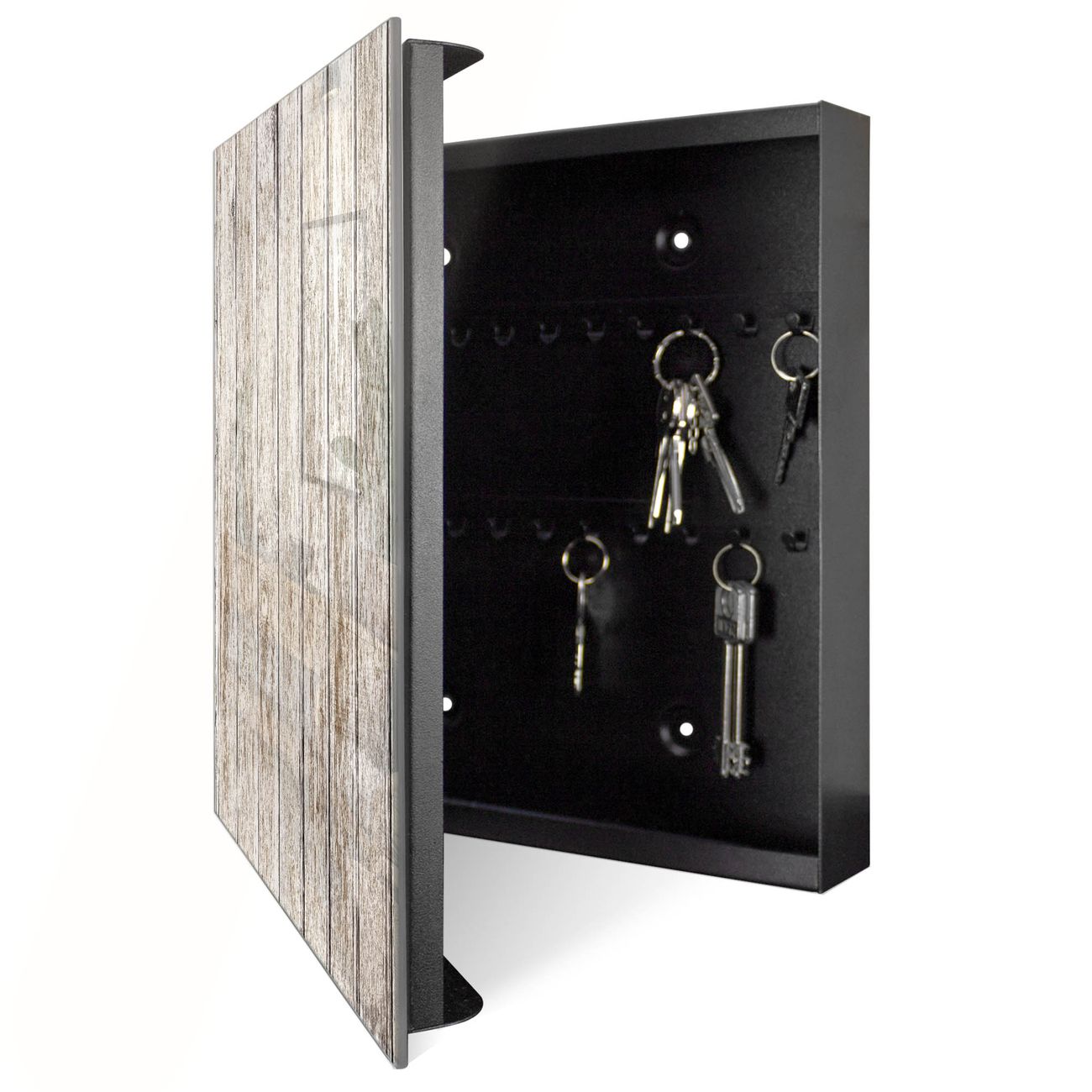Bringe Ordnung und Eleganz in deinen Eingangsbereich mit dem banjado Schlüsselkasten Motiv Motiv Weißes Holz. Die moderne Schlüsselbox kombiniert funktionales Design mit hochwertiger Verarbeitung und wird so zu einem echten Hingucker in Flur, Büro oder Ferienwohnung. ✅ Stilvolle Schlüsselaufbewahrung mit Glasfront im Motiv Motiv Weißes Holz Der Design-Schlüsselkasten Motiv Motiv Weißes Holz bietet Platz für bis zu 50 Schlüssel, die auf 5 stabilen Reihen mit je 10 Haken übersichtlich verstaut werden. Mit seinen kompakten Maßen von 30 x 30 x 5 cm passt die Schlüsselbox perfekt auch in kleinere Räume. Der schwarz lackierte Stahlkorpus mit rechts angeschlagenem Türscharnier harmoniert mit der Glasfront und fügt sich nahtlos in jedes Wohnambiente ein. Ob als Schlüsselorganizer für Zuhause oder als praktische Lösung für Büros, Praxen und Gewerbe, der banjado Schlüsselkasten sorgt für Ordnung und Übersicht. Dank der magnetischen, mit Kreidestiften beschreibbaren Glasfront kannst du Notizen anheften oder Termine direkt auf der Oberfläche festhalten. Die Schlüsselbox Motiv Motiv Weißes Holz zur Wandmontage wird inklusive Befestigungsmaterial geliefert und ist schnell angebracht. So hast du deine Schlüssel jederzeit griffbereit und zugleich stilvoll verstaut. Mit diesem banjado Schlüsselkasten Motiv Motiv Weißes Holz kombinierst du praktische Aufbewahrung mit stilvollem Wohndesign. Ob privat oder geschäftlich, die Schlüsselbox sorgt für mehr Ordnung, Übersicht und ein wohnliches Ambiente.Vorteile im Überblick