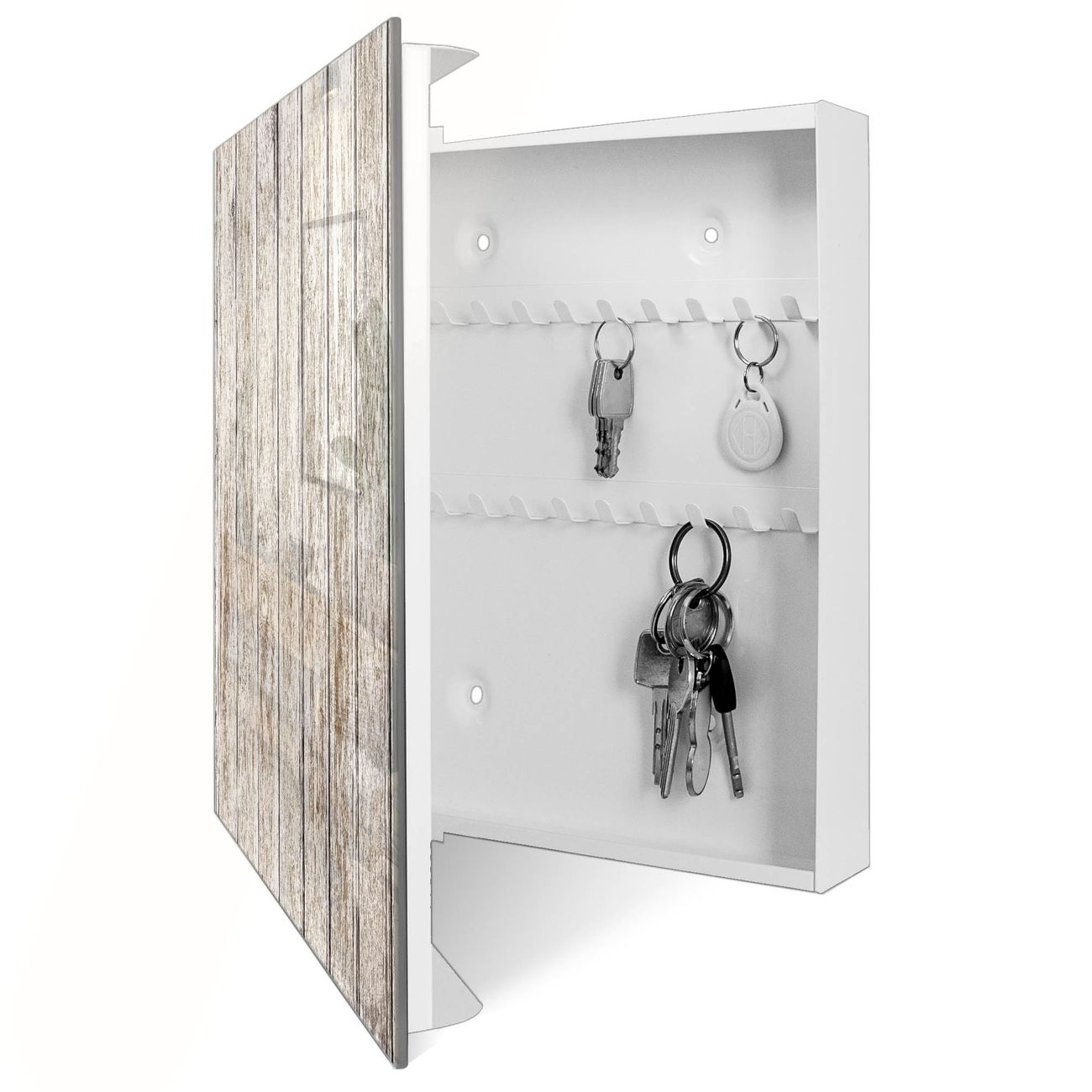 Bringe Ordnung und Eleganz in deinen Eingangsbereich mit dem banjado Schlüsselkasten Motiv Motiv Weißes Holz. Die moderne Schlüsselbox kombiniert funktionales Design mit hochwertiger Verarbeitung und wird so zu einem echten Hingucker in Flur, Büro oder Ferienwohnung. ✅ Stilvolle Schlüsselaufbewahrung mit Glasfront im Motiv Motiv Weißes Holz Der Design-Schlüsselkasten Motiv Motiv Weißes Holz bietet Platz für bis zu 50 Schlüssel, die auf 5 stabilen Reihen mit je 10 Haken übersichtlich verstaut werden. Mit seinen kompakten Maßen von 30 x 30 x 5 cm passt die Schlüsselbox perfekt auch in kleinere Räume. Der weiß lackierte Stahlkorpus mit rechts angeschlagenem Türscharnier harmoniert mit der Glasfront und fügt sich nahtlos in jedes Wohnambiente ein. Ob als Schlüsselorganizer für Zuhause oder als praktische Lösung für Büros, Praxen und Gewerbe, der banjado Schlüsselkasten sorgt für Ordnung und Übersicht. Dank der magnetischen, mit Kreidestiften beschreibbaren Glasfront kannst du Notizen anheften oder Termine direkt auf der Oberfläche festhalten. Die Schlüsselbox Motiv Motiv Weißes Holz zur Wandmontage wird inklusive Befestigungsmaterial geliefert und ist schnell angebracht. So hast du deine Schlüssel jederzeit griffbereit und zugleich stilvoll verstaut. Mit diesem banjado Schlüsselkasten Motiv Motiv Weißes Holz kombinierst du praktische Aufbewahrung mit stilvollem Wohndesign. Ob privat oder geschäftlich, die Schlüsselbox sorgt für mehr Ordnung, Übersicht und ein wohnliches Ambiente.Vorteile im Überblick