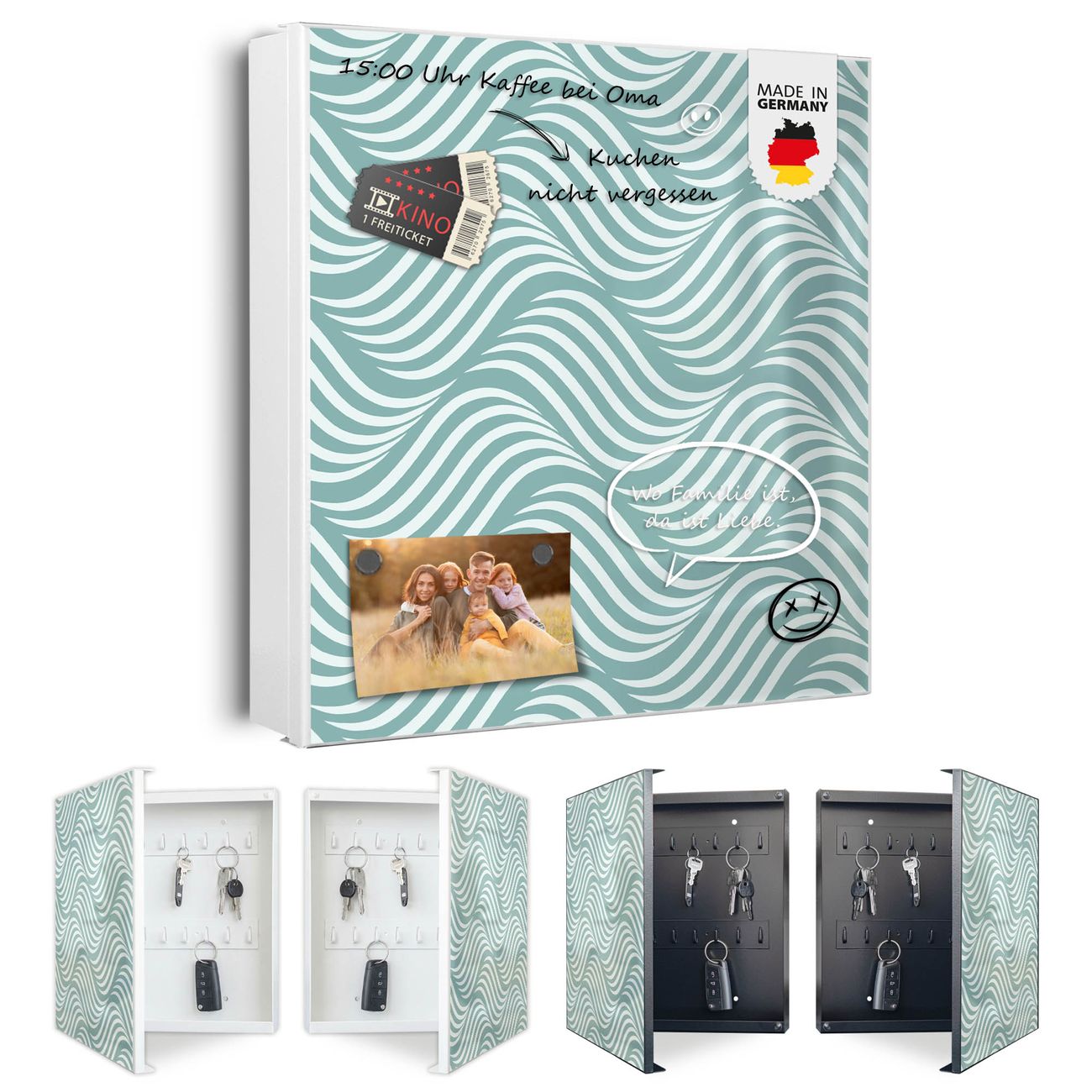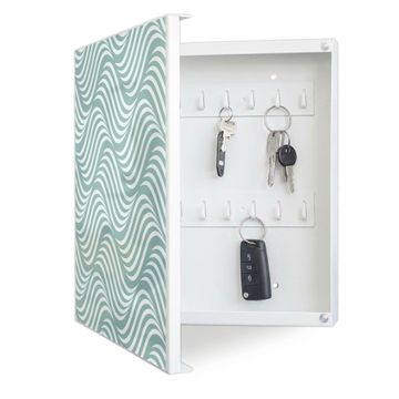 Bringe Ordnung und Eleganz in deinen Eingangsbereich mit dem banjado Schlüsselkasten Motiv Motiv Wellen Lindgrün. Die moderne Schlüsselbox kombiniert funktionales Design mit hochwertiger Verarbeitung und wird so zu einem echten Hingucker in Flur, Büro oder Ferienwohnung. ✅ Stilvolle Schlüsselaufbewahrung mit Motiv Motiv Wellen Lindgrün Der Design-Schlüsselkasten Motiv Motiv Wellen Lindgrün bietet Platz für bis zu 32 Schlüssel, die auf 4 stabilen Reihen mit je 8 Haken übersichtlich verstaut werden. Mit seinen kompakten Maßen von 30 x 30 x 5 cm passt die Schlüsselbox perfekt auch in kleinere Räume. Der weiß lackierte Stahlkorpus mit links angeschlagenem Türscharnier harmoniert mit gedruckten Folie auf der Front und fügt sich nahtlos in jedes Wohnambiente ein. Ob als Schlüsselorganizer für Zuhause oder als praktische Lösung für Büros, Praxen und Gewerbe, der banjado Schlüsselkasten sorgt für Ordnung und Übersicht. Dank der magnetischen, mit Kreidestiften beschreibbaren Folie auf der Front kannst du Notizen anheften oder Termine direkt auf der Oberfläche festhalten. Die Schlüsselbox Motiv Motiv Wellen Lindgrün zur Wandmontage wird inklusive Befestigungsmaterial geliefert und ist schnell angebracht. So hast du deine Schlüssel jederzeit griffbereit und zugleich stilvoll verstaut. Mit diesem banjado Schlüsselkasten Motiv Motiv Wellen Lindgrün kombinierst du praktische Aufbewahrung mit stilvollem Wohndesign. Ob privat oder geschäftlich, die Schlüsselbox sorgt für mehr Ordnung, Übersicht und ein wohnliches Ambiente.Vorteile im Überblick