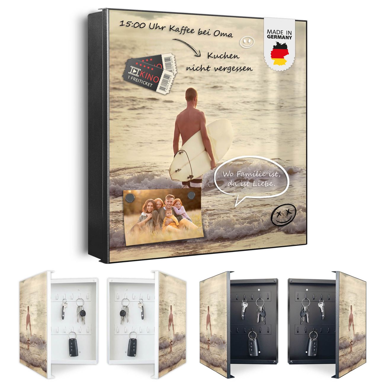 Bringe Ordnung und Eleganz in deinen Eingangsbereich mit dem banjado Schlüsselkasten Motiv Motiv Wellenreiten Gehen 2. Die moderne Schlüsselbox kombiniert funktionales Design mit hochwertiger Verarbeitung und wird so zu einem echten Hingucker in Flur, Büro oder Ferienwohnung. ✅ Stilvolle Schlüsselaufbewahrung mit Motiv Motiv Wellenreiten Gehen 2 Der Design-Schlüsselkasten Motiv Motiv Wellenreiten Gehen 2 bietet Platz für bis zu 32 Schlüssel, die auf 4 stabilen Reihen mit je 8 Haken übersichtlich verstaut werden. Mit seinen kompakten Maßen von 30 x 30 x 5 cm passt die Schlüsselbox perfekt auch in kleinere Räume. Der schwarz lackierte Stahlkorpus mit rechts angeschlagenem Türscharnier harmoniert mit gedruckten Folie auf der Front und fügt sich nahtlos in jedes Wohnambiente ein. Ob als Schlüsselorganizer für Zuhause oder als praktische Lösung für Büros, Praxen und Gewerbe, der banjado Schlüsselkasten sorgt für Ordnung und Übersicht. Dank der magnetischen, mit Kreidestiften beschreibbaren Folie auf der Front kannst du Notizen anheften oder Termine direkt auf der Oberfläche festhalten. Die Schlüsselbox Motiv Motiv Wellenreiten Gehen 2 zur Wandmontage wird inklusive Befestigungsmaterial geliefert und ist schnell angebracht. So hast du deine Schlüssel jederzeit griffbereit und zugleich stilvoll verstaut. Mit diesem banjado Schlüsselkasten Motiv Motiv Wellenreiten Gehen 2 kombinierst du praktische Aufbewahrung mit stilvollem Wohndesign. Ob privat oder geschäftlich, die Schlüsselbox sorgt für mehr Ordnung, Übersicht und ein wohnliches Ambiente.Vorteile im Überblick