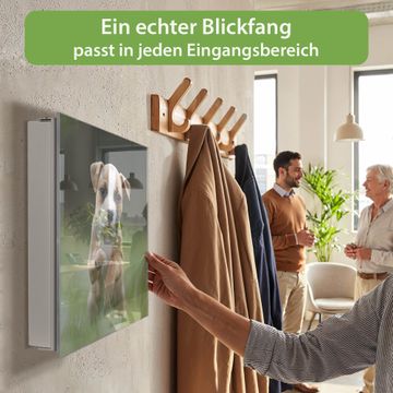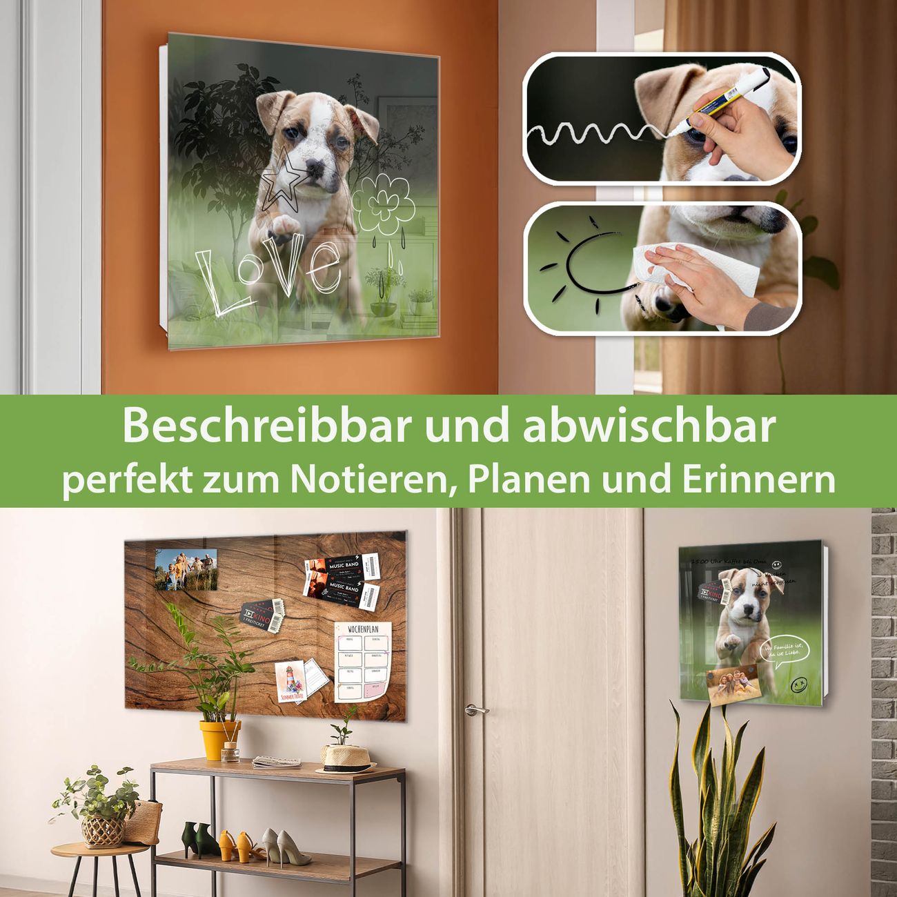 Bringe Ordnung und Eleganz in deinen Eingangsbereich mit dem banjado Schlüsselkasten Motiv Motiv Welpe im Gras. Die moderne Schlüsselbox kombiniert funktionales Design mit hochwertiger Verarbeitung und wird so zu einem echten Hingucker in Flur, Büro oder Ferienwohnung. ✅ Stilvolle Schlüsselaufbewahrung mit Glasfront im Motiv Motiv Welpe im Gras Der Design-Schlüsselkasten Motiv Motiv Welpe im Gras bietet Platz für bis zu 50 Schlüssel, die auf 5 stabilen Reihen mit je 10 Haken übersichtlich verstaut werden. Mit seinen kompakten Maßen von 30 x 30 x 5 cm passt die Schlüsselbox perfekt auch in kleinere Räume. Der weiß lackierte Stahlkorpus mit rechts angeschlagenem Türscharnier harmoniert mit der Glasfront und fügt sich nahtlos in jedes Wohnambiente ein. Ob als Schlüsselorganizer für Zuhause oder als praktische Lösung für Büros, Praxen und Gewerbe, der banjado Schlüsselkasten sorgt für Ordnung und Übersicht. Dank der magnetischen, mit Kreidestiften beschreibbaren Glasfront kannst du Notizen anheften oder Termine direkt auf der Oberfläche festhalten. Die Schlüsselbox Motiv Motiv Welpe im Gras zur Wandmontage wird inklusive Befestigungsmaterial geliefert und ist schnell angebracht. So hast du deine Schlüssel jederzeit griffbereit und zugleich stilvoll verstaut. Mit diesem banjado Schlüsselkasten Motiv Motiv Welpe im Gras kombinierst du praktische Aufbewahrung mit stilvollem Wohndesign. Ob privat oder geschäftlich, die Schlüsselbox sorgt für mehr Ordnung, Übersicht und ein wohnliches Ambiente.Vorteile im Überblick