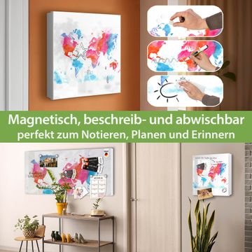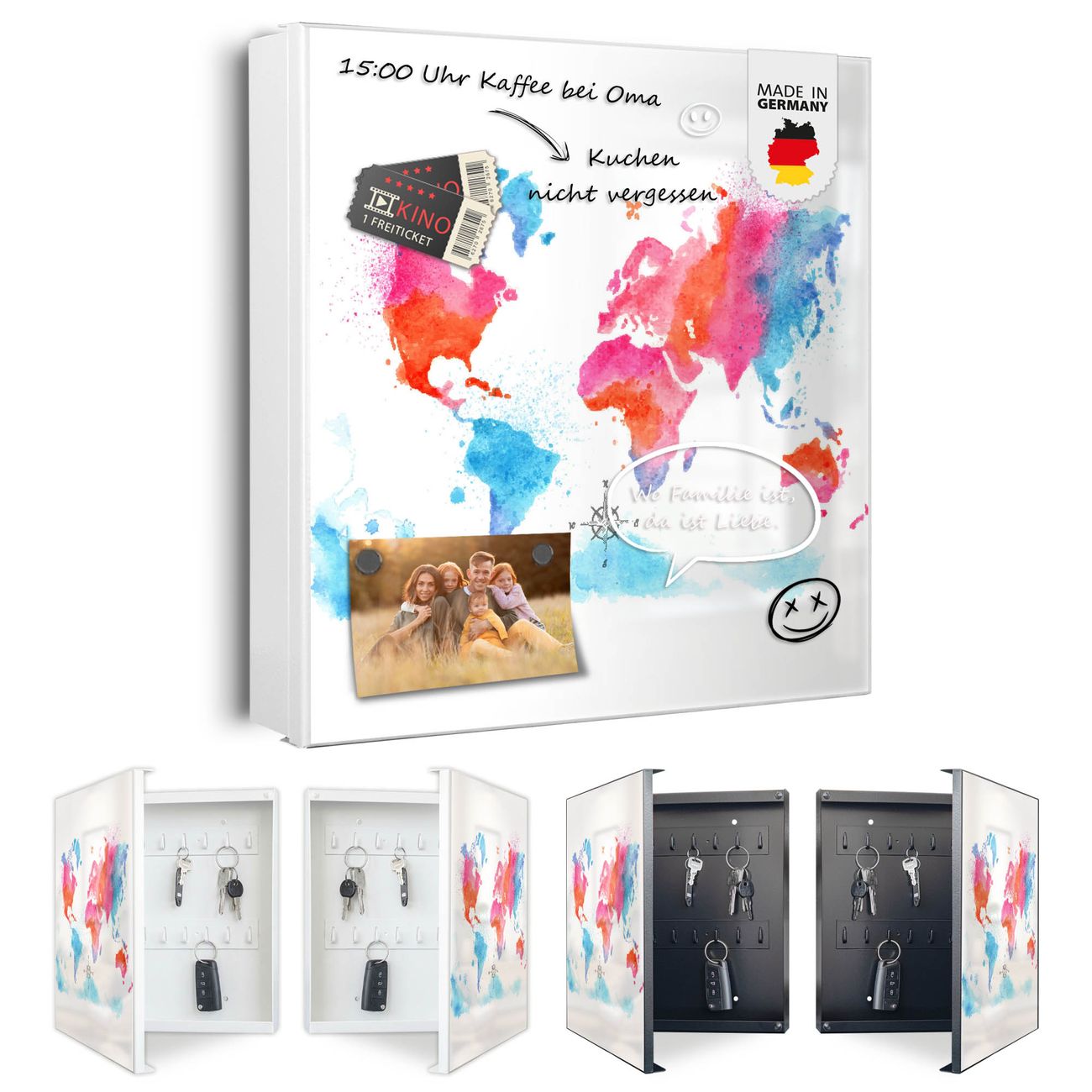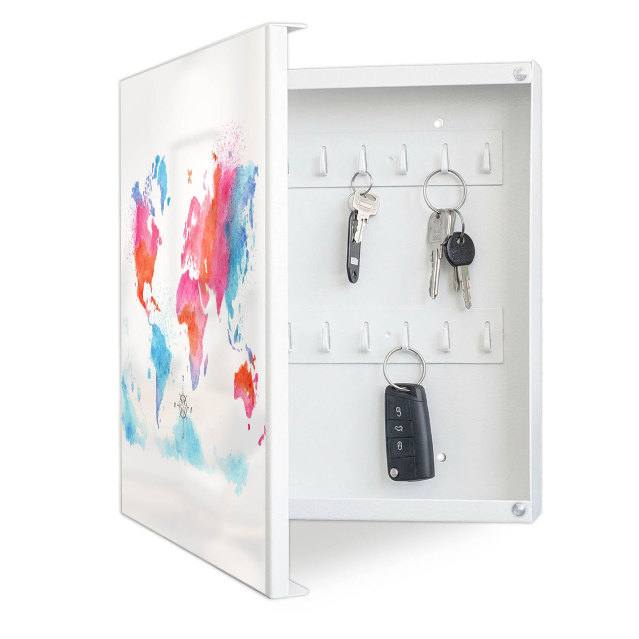 Bringe Ordnung und Eleganz in deinen Eingangsbereich mit dem banjado Schlüsselkasten Motiv Motiv Weltkarte pastell. Die moderne Schlüsselbox kombiniert funktionales Design mit hochwertiger Verarbeitung und wird so zu einem echten Hingucker in Flur, Büro oder Ferienwohnung. ✅ Stilvolle Schlüsselaufbewahrung mit Motiv Motiv Weltkarte pastell Der Design-Schlüsselkasten Motiv Motiv Weltkarte pastell bietet Platz für bis zu 32 Schlüssel, die auf 4 stabilen Reihen mit je 8 Haken übersichtlich verstaut werden. Mit seinen kompakten Maßen von 30 x 30 x 5 cm passt die Schlüsselbox perfekt auch in kleinere Räume. Der weiß lackierte Stahlkorpus mit links angeschlagenem Türscharnier harmoniert mit gedruckten Folie auf der Front und fügt sich nahtlos in jedes Wohnambiente ein. Ob als Schlüsselorganizer für Zuhause oder als praktische Lösung für Büros, Praxen und Gewerbe, der banjado Schlüsselkasten sorgt für Ordnung und Übersicht. Dank der magnetischen, mit Kreidestiften beschreibbaren Folie auf der Front kannst du Notizen anheften oder Termine direkt auf der Oberfläche festhalten. Die Schlüsselbox Motiv Motiv Weltkarte pastell zur Wandmontage wird inklusive Befestigungsmaterial geliefert und ist schnell angebracht. So hast du deine Schlüssel jederzeit griffbereit und zugleich stilvoll verstaut. Mit diesem banjado Schlüsselkasten Motiv Motiv Weltkarte pastell kombinierst du praktische Aufbewahrung mit stilvollem Wohndesign. Ob privat oder geschäftlich, die Schlüsselbox sorgt für mehr Ordnung, Übersicht und ein wohnliches Ambiente.Vorteile im Überblick