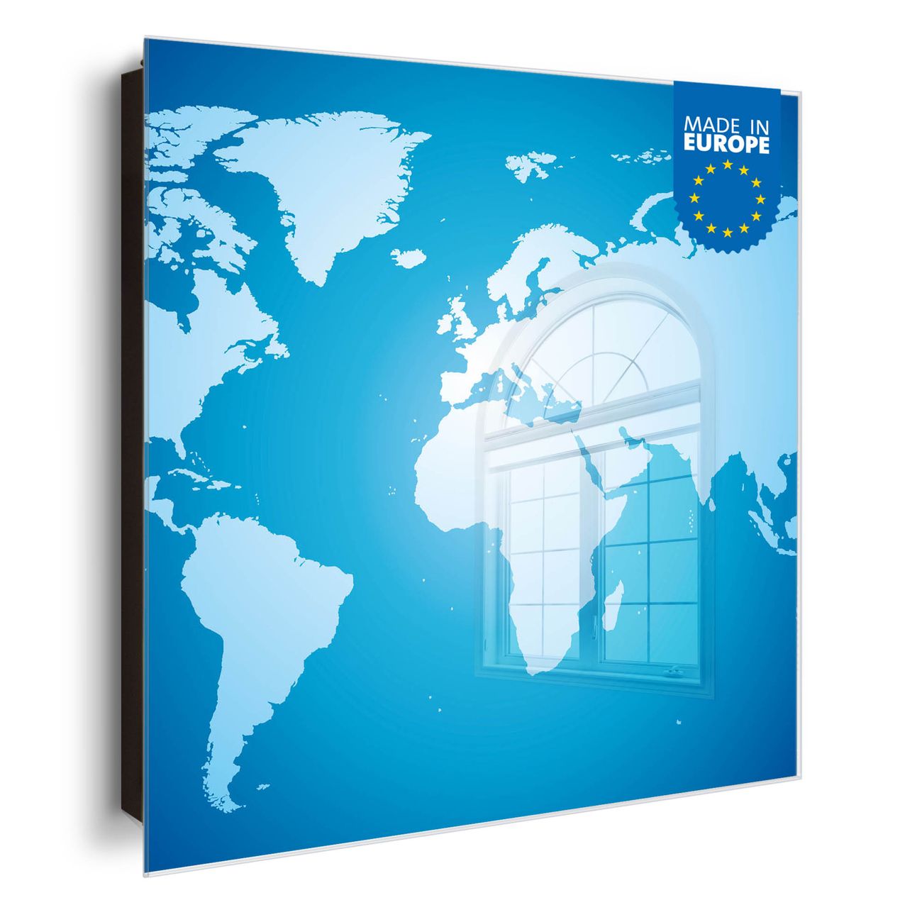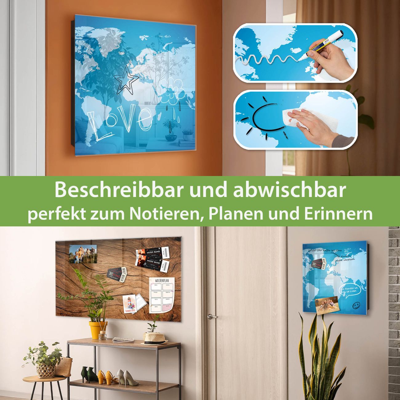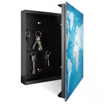Bringe Ordnung und Eleganz in deinen Eingangsbereich mit dem banjado Schlüsselkasten Motiv Motiv Weltkarte. Die moderne Schlüsselbox kombiniert funktionales Design mit hochwertiger Verarbeitung und wird so zu einem echten Hingucker in Flur, Büro oder Ferienwohnung. ✅ Stilvolle Schlüsselaufbewahrung mit Glasfront im Motiv Motiv Weltkarte Der Design-Schlüsselkasten Motiv Motiv Weltkarte bietet Platz für bis zu 50 Schlüssel, die auf 5 stabilen Reihen mit je 10 Haken übersichtlich verstaut werden. Mit seinen kompakten Maßen von 30 x 30 x 5 cm passt die Schlüsselbox perfekt auch in kleinere Räume. Der schwarz lackierte Stahlkorpus mit rechts angeschlagenem Türscharnier harmoniert mit der Glasfront und fügt sich nahtlos in jedes Wohnambiente ein. Ob als Schlüsselorganizer für Zuhause oder als praktische Lösung für Büros, Praxen und Gewerbe, der banjado Schlüsselkasten sorgt für Ordnung und Übersicht. Dank der magnetischen, mit Kreidestiften beschreibbaren Glasfront kannst du Notizen anheften oder Termine direkt auf der Oberfläche festhalten. Die Schlüsselbox Motiv Motiv Weltkarte zur Wandmontage wird inklusive Befestigungsmaterial geliefert und ist schnell angebracht. So hast du deine Schlüssel jederzeit griffbereit und zugleich stilvoll verstaut. Mit diesem banjado Schlüsselkasten Motiv Motiv Weltkarte kombinierst du praktische Aufbewahrung mit stilvollem Wohndesign. Ob privat oder geschäftlich, die Schlüsselbox sorgt für mehr Ordnung, Übersicht und ein wohnliches Ambiente.Vorteile im Überblick