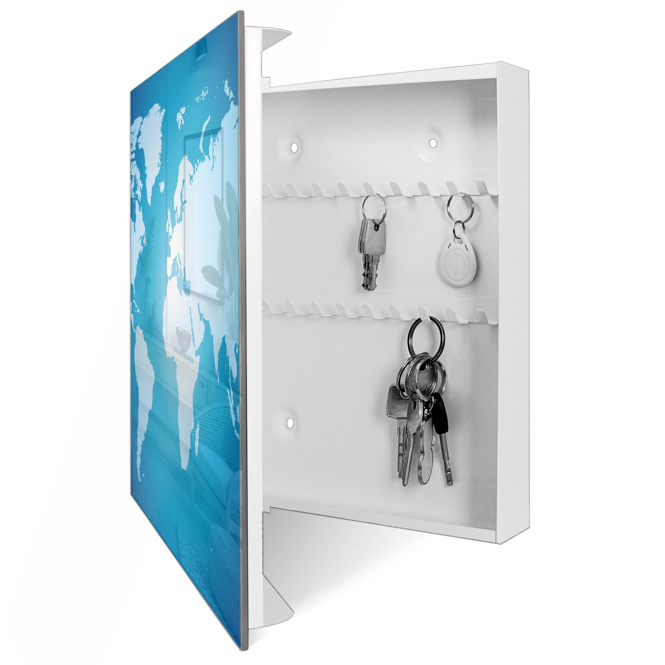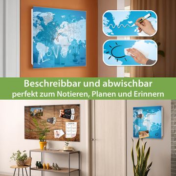 Bringe Ordnung und Eleganz in deinen Eingangsbereich mit dem banjado Schlüsselkasten Motiv Motiv Weltkarte. Die moderne Schlüsselbox kombiniert funktionales Design mit hochwertiger Verarbeitung und wird so zu einem echten Hingucker in Flur, Büro oder Ferienwohnung. ✅ Stilvolle Schlüsselaufbewahrung mit Glasfront im Motiv Motiv Weltkarte Der Design-Schlüsselkasten Motiv Motiv Weltkarte bietet Platz für bis zu 50 Schlüssel, die auf 5 stabilen Reihen mit je 10 Haken übersichtlich verstaut werden. Mit seinen kompakten Maßen von 30 x 30 x 5 cm passt die Schlüsselbox perfekt auch in kleinere Räume. Der weiß lackierte Stahlkorpus mit rechts angeschlagenem Türscharnier harmoniert mit der Glasfront und fügt sich nahtlos in jedes Wohnambiente ein. Ob als Schlüsselorganizer für Zuhause oder als praktische Lösung für Büros, Praxen und Gewerbe, der banjado Schlüsselkasten sorgt für Ordnung und Übersicht. Dank der magnetischen, mit Kreidestiften beschreibbaren Glasfront kannst du Notizen anheften oder Termine direkt auf der Oberfläche festhalten. Die Schlüsselbox Motiv Motiv Weltkarte zur Wandmontage wird inklusive Befestigungsmaterial geliefert und ist schnell angebracht. So hast du deine Schlüssel jederzeit griffbereit und zugleich stilvoll verstaut. Mit diesem banjado Schlüsselkasten Motiv Motiv Weltkarte kombinierst du praktische Aufbewahrung mit stilvollem Wohndesign. Ob privat oder geschäftlich, die Schlüsselbox sorgt für mehr Ordnung, Übersicht und ein wohnliches Ambiente.Vorteile im Überblick