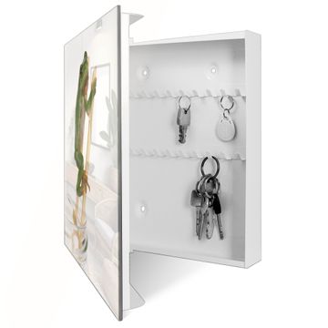 Bringe Ordnung und Eleganz in deinen Eingangsbereich mit dem banjado Schlüsselkasten Motiv Motiv Wetterfrosch. Die moderne Schlüsselbox kombiniert funktionales Design mit hochwertiger Verarbeitung und wird so zu einem echten Hingucker in Flur, Büro oder Ferienwohnung. ✅ Stilvolle Schlüsselaufbewahrung mit Glasfront im Motiv Motiv Wetterfrosch Der Design-Schlüsselkasten Motiv Motiv Wetterfrosch bietet Platz für bis zu 50 Schlüssel, die auf 5 stabilen Reihen mit je 10 Haken übersichtlich verstaut werden. Mit seinen kompakten Maßen von 30 x 30 x 5 cm passt die Schlüsselbox perfekt auch in kleinere Räume. Der weiß lackierte Stahlkorpus mit rechts angeschlagenem Türscharnier harmoniert mit der Glasfront und fügt sich nahtlos in jedes Wohnambiente ein. Ob als Schlüsselorganizer für Zuhause oder als praktische Lösung für Büros, Praxen und Gewerbe, der banjado Schlüsselkasten sorgt für Ordnung und Übersicht. Dank der magnetischen, mit Kreidestiften beschreibbaren Glasfront kannst du Notizen anheften oder Termine direkt auf der Oberfläche festhalten. Die Schlüsselbox Motiv Motiv Wetterfrosch zur Wandmontage wird inklusive Befestigungsmaterial geliefert und ist schnell angebracht. So hast du deine Schlüssel jederzeit griffbereit und zugleich stilvoll verstaut. Mit diesem banjado Schlüsselkasten Motiv Motiv Wetterfrosch kombinierst du praktische Aufbewahrung mit stilvollem Wohndesign. Ob privat oder geschäftlich, die Schlüsselbox sorgt für mehr Ordnung, Übersicht und ein wohnliches Ambiente.Vorteile im Überblick