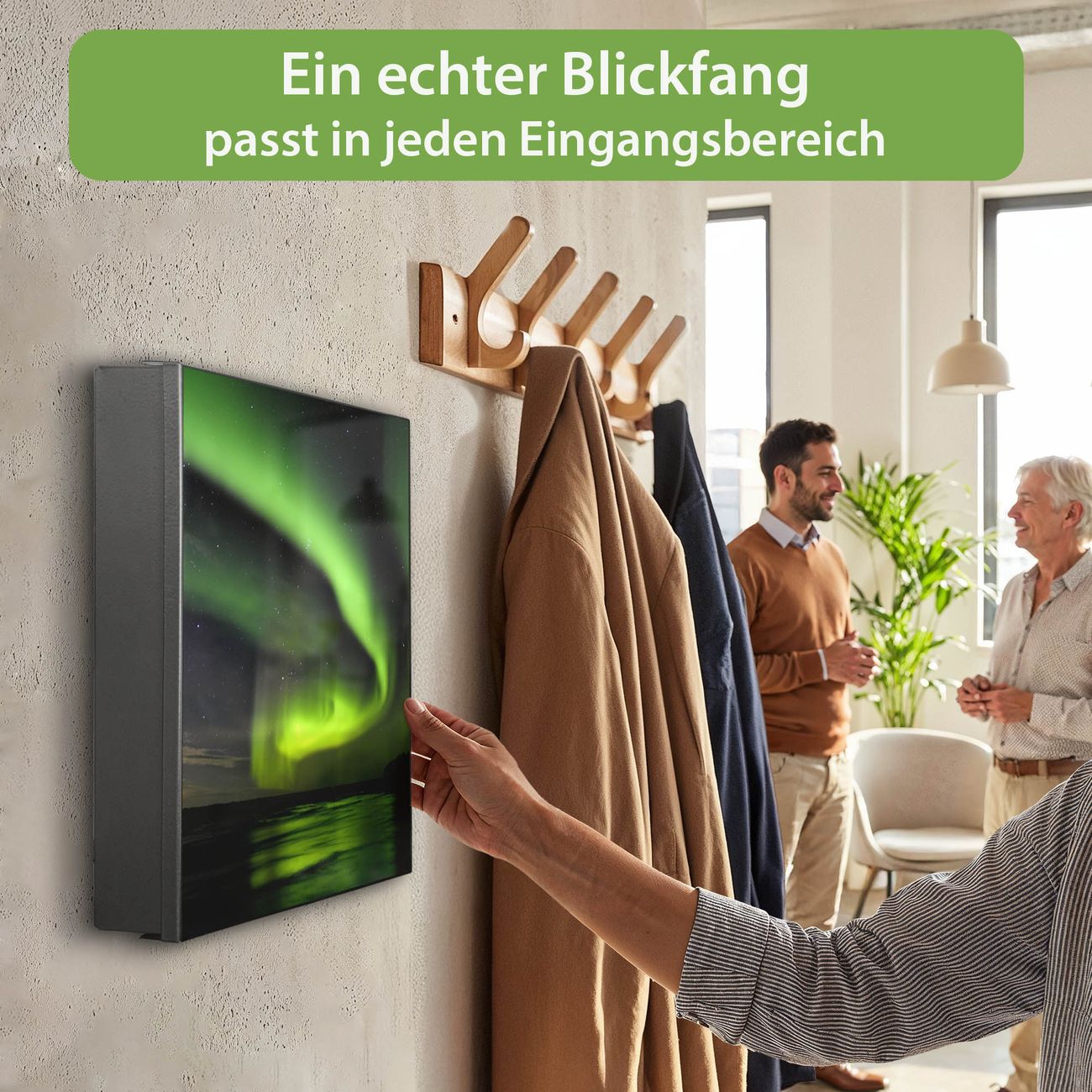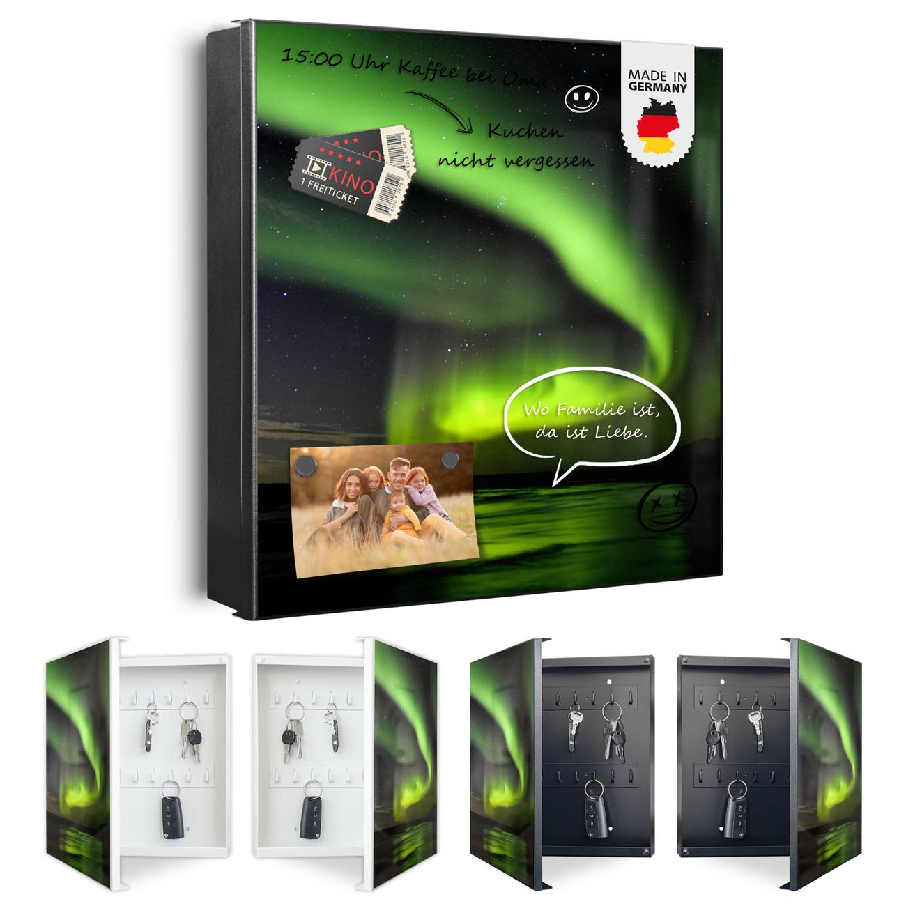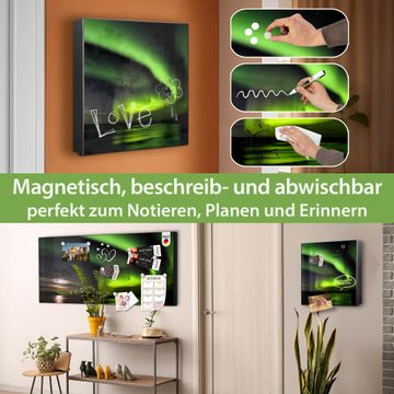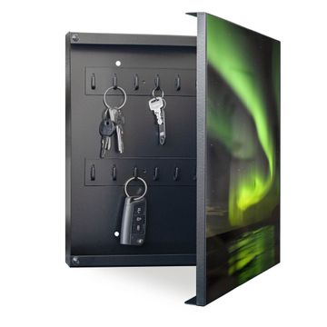Bringe Ordnung und Eleganz in deinen Eingangsbereich mit dem banjado Schlüsselkasten Motiv Motiv Wetterleuchten. Die moderne Schlüsselbox kombiniert funktionales Design mit hochwertiger Verarbeitung und wird so zu einem echten Hingucker in Flur, Büro oder Ferienwohnung. ✅ Stilvolle Schlüsselaufbewahrung mit Motiv Motiv Wetterleuchten Der Design-Schlüsselkasten Motiv Motiv Wetterleuchten bietet Platz für bis zu 32 Schlüssel, die auf 4 stabilen Reihen mit je 8 Haken übersichtlich verstaut werden. Mit seinen kompakten Maßen von 30 x 30 x 5 cm passt die Schlüsselbox perfekt auch in kleinere Räume. Der schwarz lackierte Stahlkorpus mit rechts angeschlagenem Türscharnier harmoniert mit gedruckten Folie auf der Front und fügt sich nahtlos in jedes Wohnambiente ein. Ob als Schlüsselorganizer für Zuhause oder als praktische Lösung für Büros, Praxen und Gewerbe, der banjado Schlüsselkasten sorgt für Ordnung und Übersicht. Dank der magnetischen, mit Kreidestiften beschreibbaren Folie auf der Front kannst du Notizen anheften oder Termine direkt auf der Oberfläche festhalten. Die Schlüsselbox Motiv Motiv Wetterleuchten zur Wandmontage wird inklusive Befestigungsmaterial geliefert und ist schnell angebracht. So hast du deine Schlüssel jederzeit griffbereit und zugleich stilvoll verstaut. Mit diesem banjado Schlüsselkasten Motiv Motiv Wetterleuchten kombinierst du praktische Aufbewahrung mit stilvollem Wohndesign. Ob privat oder geschäftlich, die Schlüsselbox sorgt für mehr Ordnung, Übersicht und ein wohnliches Ambiente.Vorteile im Überblick