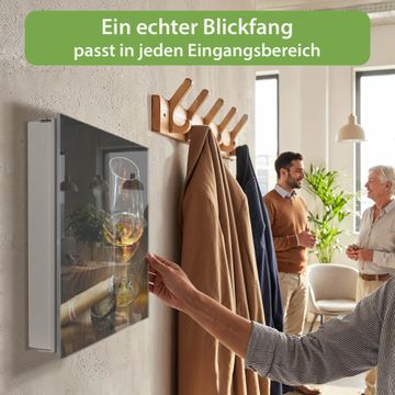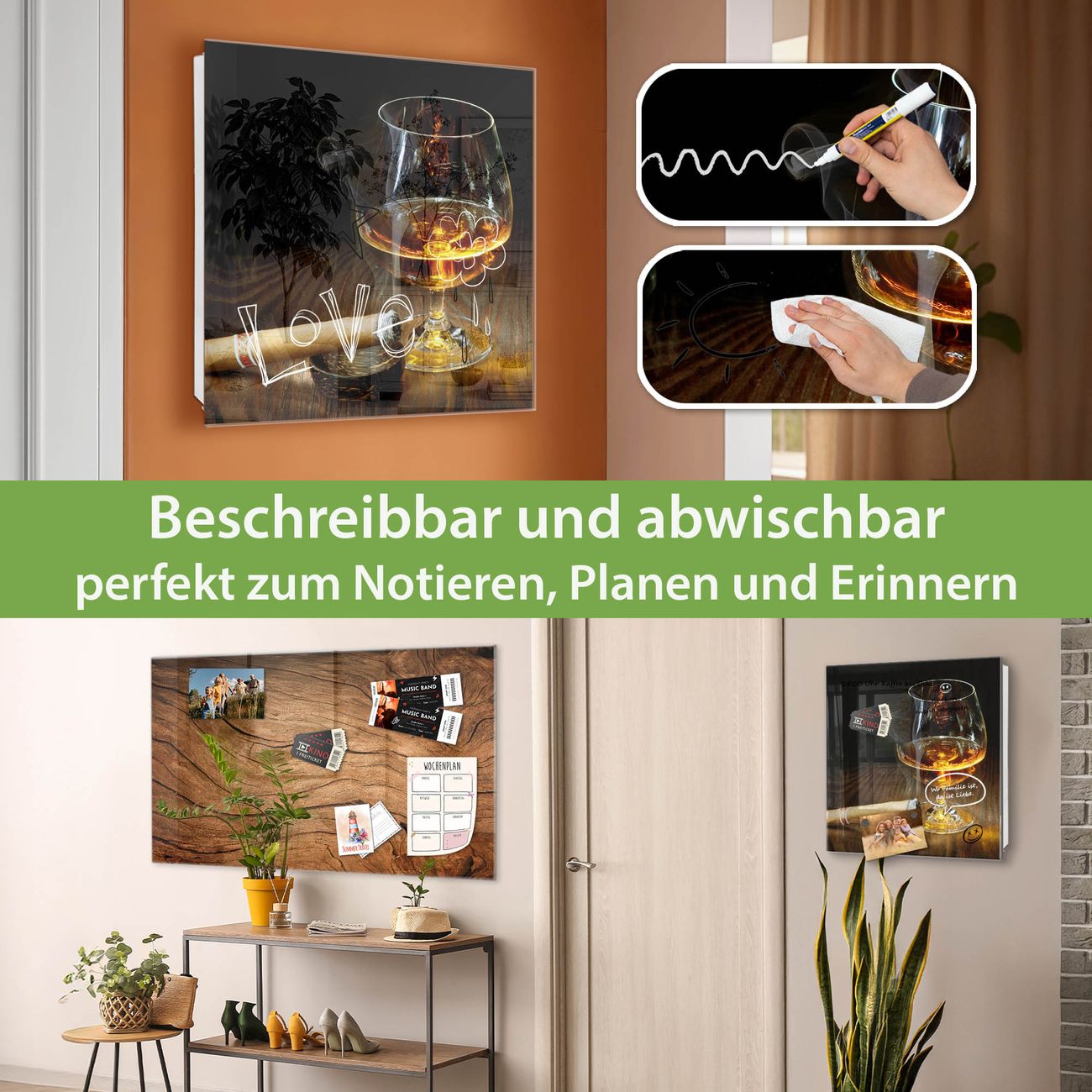 Bringe Ordnung und Eleganz in deinen Eingangsbereich mit dem banjado Schlüsselkasten Motiv Motiv Whiskey & Cigar. Die moderne Schlüsselbox kombiniert funktionales Design mit hochwertiger Verarbeitung und wird so zu einem echten Hingucker in Flur, Büro oder Ferienwohnung. ✅ Stilvolle Schlüsselaufbewahrung mit Glasfront im Motiv Motiv Whiskey & Cigar Der Design-Schlüsselkasten Motiv Motiv Whiskey & Cigar bietet Platz für bis zu 50 Schlüssel, die auf 5 stabilen Reihen mit je 10 Haken übersichtlich verstaut werden. Mit seinen kompakten Maßen von 30 x 30 x 5 cm passt die Schlüsselbox perfekt auch in kleinere Räume. Der weiß lackierte Stahlkorpus mit rechts angeschlagenem Türscharnier harmoniert mit der Glasfront und fügt sich nahtlos in jedes Wohnambiente ein. Ob als Schlüsselorganizer für Zuhause oder als praktische Lösung für Büros, Praxen und Gewerbe, der banjado Schlüsselkasten sorgt für Ordnung und Übersicht. Dank der magnetischen, mit Kreidestiften beschreibbaren Glasfront kannst du Notizen anheften oder Termine direkt auf der Oberfläche festhalten. Die Schlüsselbox Motiv Motiv Whiskey & Cigar zur Wandmontage wird inklusive Befestigungsmaterial geliefert und ist schnell angebracht. So hast du deine Schlüssel jederzeit griffbereit und zugleich stilvoll verstaut. Mit diesem banjado Schlüsselkasten Motiv Motiv Whiskey & Cigar kombinierst du praktische Aufbewahrung mit stilvollem Wohndesign. Ob privat oder geschäftlich, die Schlüsselbox sorgt für mehr Ordnung, Übersicht und ein wohnliches Ambiente.Vorteile im Überblick