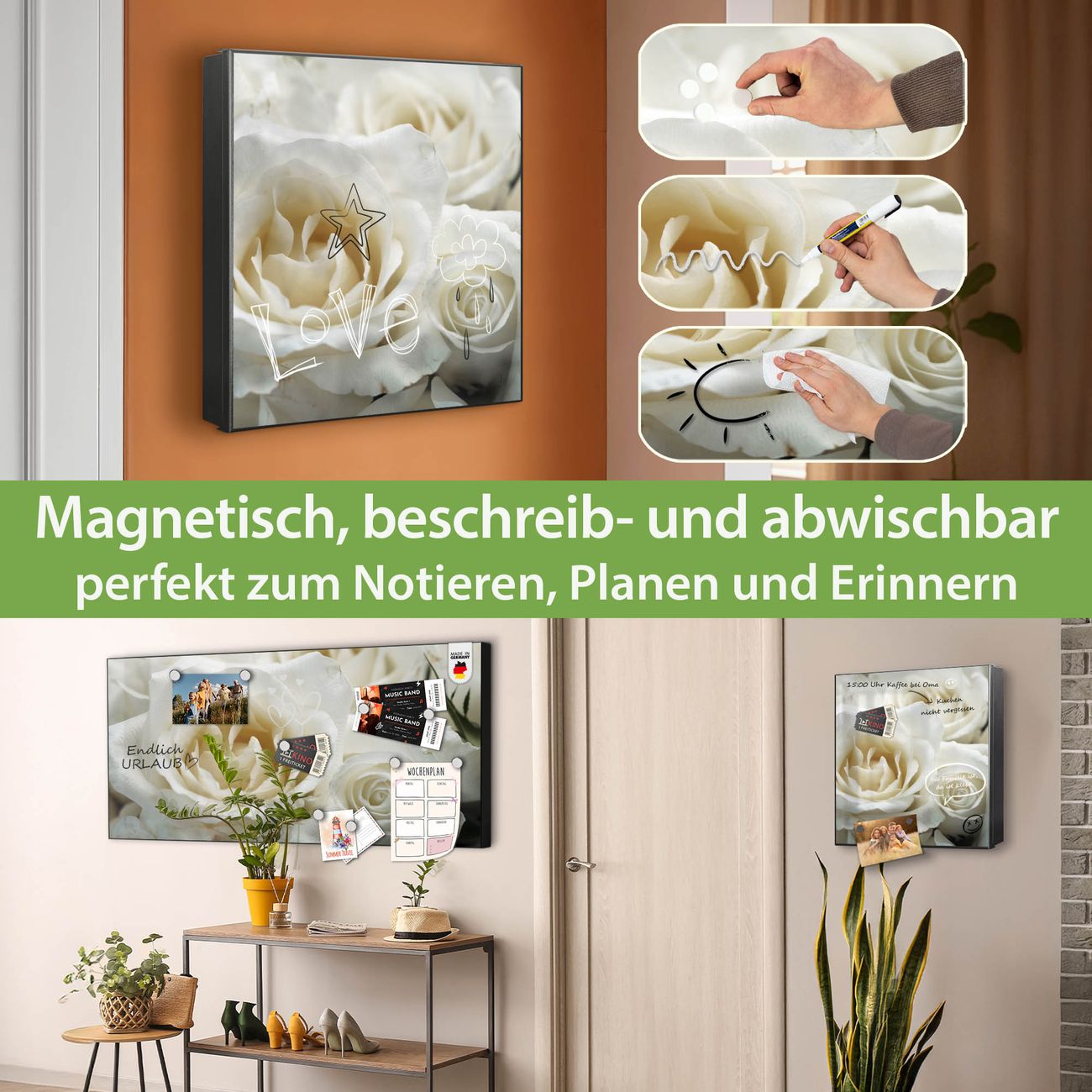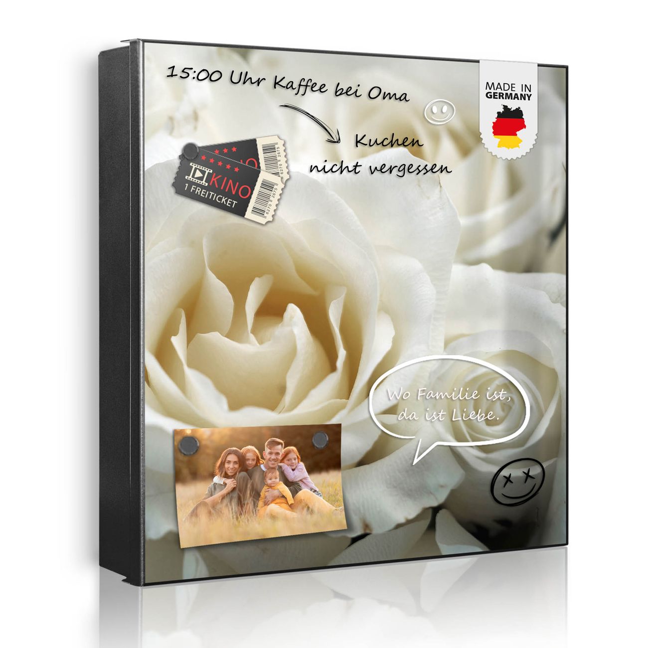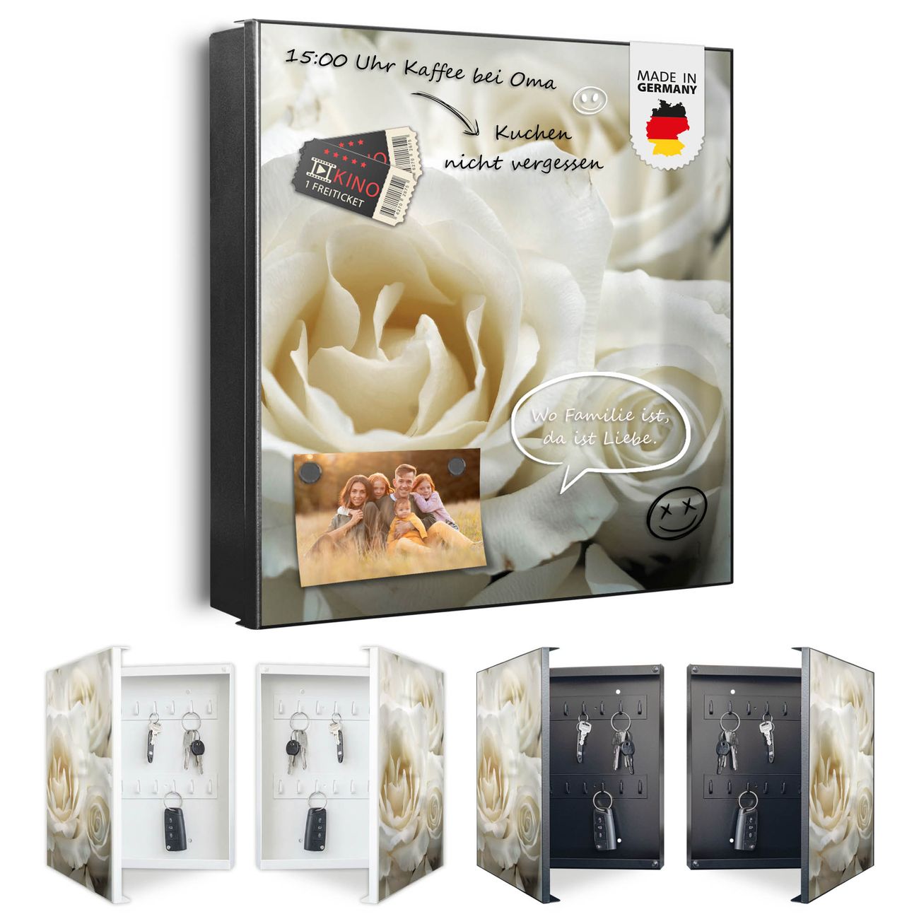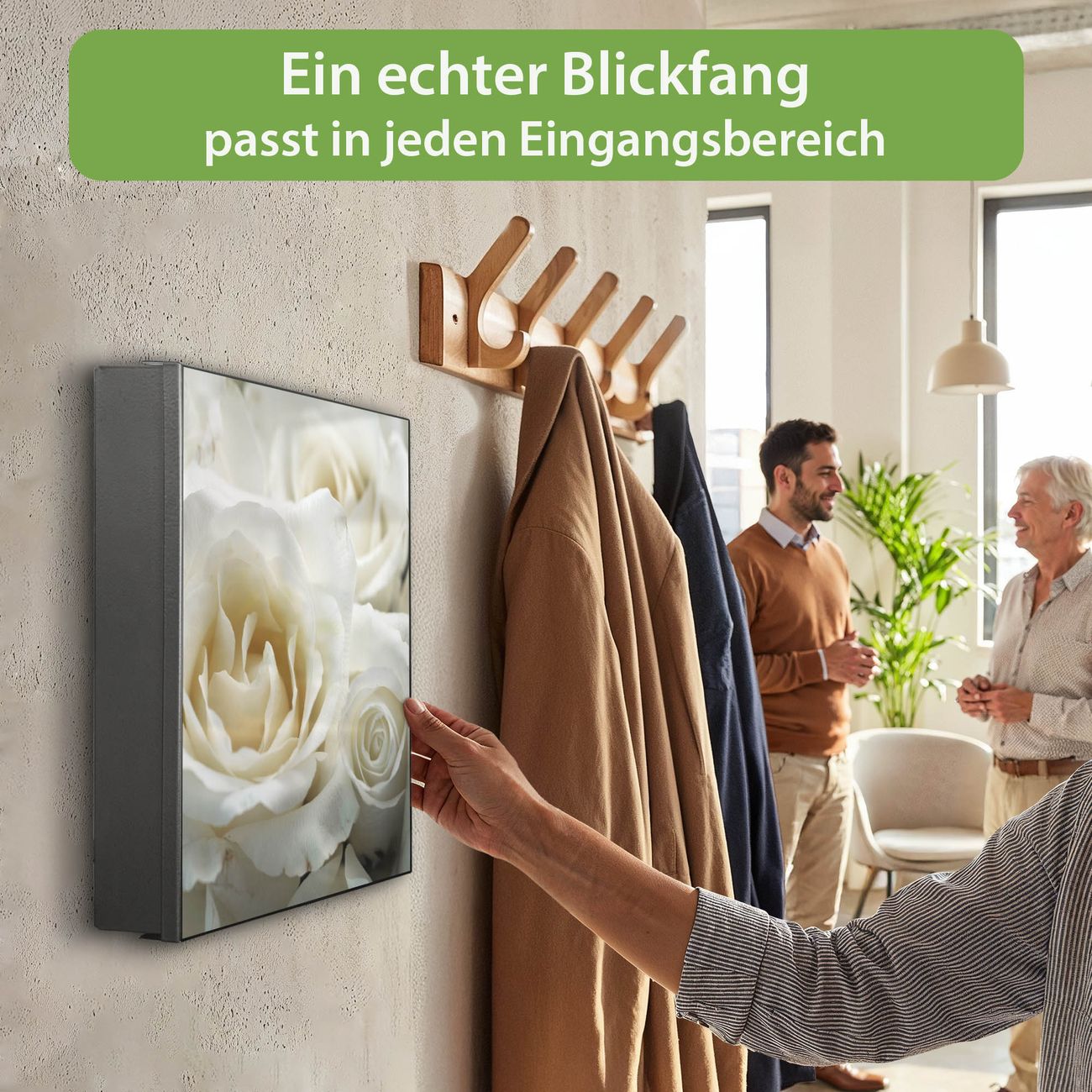 Bringe Ordnung und Eleganz in deinen Eingangsbereich mit dem banjado Schlüsselkasten Motiv Motiv White Roses. Die moderne Schlüsselbox kombiniert funktionales Design mit hochwertiger Verarbeitung und wird so zu einem echten Hingucker in Flur, Büro oder Ferienwohnung. ✅ Stilvolle Schlüsselaufbewahrung mit Motiv Motiv White Roses Der Design-Schlüsselkasten Motiv Motiv White Roses bietet Platz für bis zu 32 Schlüssel, die auf 4 stabilen Reihen mit je 8 Haken übersichtlich verstaut werden. Mit seinen kompakten Maßen von 30 x 30 x 5 cm passt die Schlüsselbox perfekt auch in kleinere Räume. Der schwarz lackierte Stahlkorpus mit rechts angeschlagenem Türscharnier harmoniert mit gedruckten Folie auf der Front und fügt sich nahtlos in jedes Wohnambiente ein. Ob als Schlüsselorganizer für Zuhause oder als praktische Lösung für Büros, Praxen und Gewerbe, der banjado Schlüsselkasten sorgt für Ordnung und Übersicht. Dank der magnetischen, mit Kreidestiften beschreibbaren Folie auf der Front kannst du Notizen anheften oder Termine direkt auf der Oberfläche festhalten. Die Schlüsselbox Motiv Motiv White Roses zur Wandmontage wird inklusive Befestigungsmaterial geliefert und ist schnell angebracht. So hast du deine Schlüssel jederzeit griffbereit und zugleich stilvoll verstaut. Mit diesem banjado Schlüsselkasten Motiv Motiv White Roses kombinierst du praktische Aufbewahrung mit stilvollem Wohndesign. Ob privat oder geschäftlich, die Schlüsselbox sorgt für mehr Ordnung, Übersicht und ein wohnliches Ambiente.Vorteile im Überblick