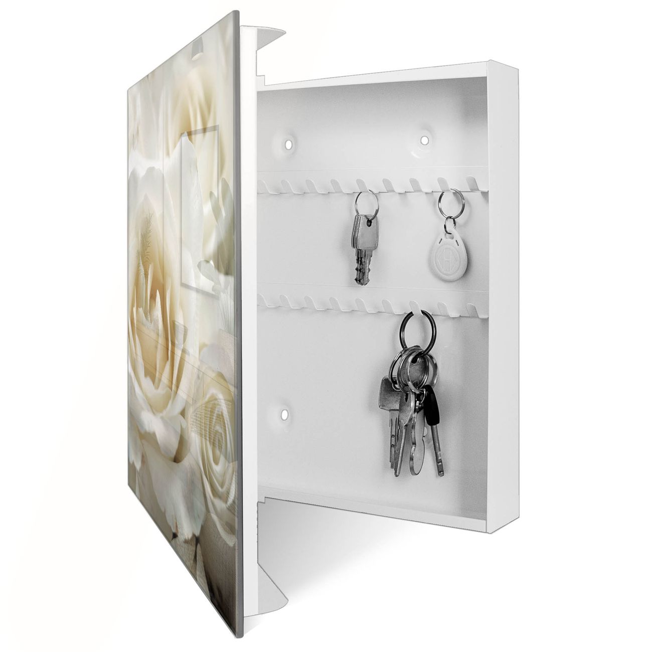Bringe Ordnung und Eleganz in deinen Eingangsbereich mit dem banjado Schlüsselkasten Motiv Motiv White Roses. Die moderne Schlüsselbox kombiniert funktionales Design mit hochwertiger Verarbeitung und wird so zu einem echten Hingucker in Flur, Büro oder Ferienwohnung. ✅ Stilvolle Schlüsselaufbewahrung mit Glasfront im Motiv Motiv White Roses Der Design-Schlüsselkasten Motiv Motiv White Roses bietet Platz für bis zu 50 Schlüssel, die auf 5 stabilen Reihen mit je 10 Haken übersichtlich verstaut werden. Mit seinen kompakten Maßen von 30 x 30 x 5 cm passt die Schlüsselbox perfekt auch in kleinere Räume. Der weiß lackierte Stahlkorpus mit rechts angeschlagenem Türscharnier harmoniert mit der Glasfront und fügt sich nahtlos in jedes Wohnambiente ein. Ob als Schlüsselorganizer für Zuhause oder als praktische Lösung für Büros, Praxen und Gewerbe, der banjado Schlüsselkasten sorgt für Ordnung und Übersicht. Dank der magnetischen, mit Kreidestiften beschreibbaren Glasfront kannst du Notizen anheften oder Termine direkt auf der Oberfläche festhalten. Die Schlüsselbox Motiv Motiv White Roses zur Wandmontage wird inklusive Befestigungsmaterial geliefert und ist schnell angebracht. So hast du deine Schlüssel jederzeit griffbereit und zugleich stilvoll verstaut. Mit diesem banjado Schlüsselkasten Motiv Motiv White Roses kombinierst du praktische Aufbewahrung mit stilvollem Wohndesign. Ob privat oder geschäftlich, die Schlüsselbox sorgt für mehr Ordnung, Übersicht und ein wohnliches Ambiente.Vorteile im Überblick