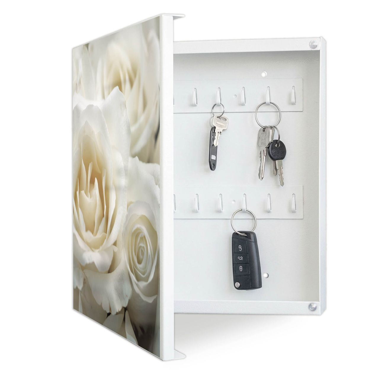 Bringe Ordnung und Eleganz in deinen Eingangsbereich mit dem banjado Schlüsselkasten Motiv Motiv White Roses. Die moderne Schlüsselbox kombiniert funktionales Design mit hochwertiger Verarbeitung und wird so zu einem echten Hingucker in Flur, Büro oder Ferienwohnung. ✅ Stilvolle Schlüsselaufbewahrung mit Motiv Motiv White Roses Der Design-Schlüsselkasten Motiv Motiv White Roses bietet Platz für bis zu 32 Schlüssel, die auf 4 stabilen Reihen mit je 8 Haken übersichtlich verstaut werden. Mit seinen kompakten Maßen von 30 x 30 x 5 cm passt die Schlüsselbox perfekt auch in kleinere Räume. Der weiß lackierte Stahlkorpus mit links angeschlagenem Türscharnier harmoniert mit gedruckten Folie auf der Front und fügt sich nahtlos in jedes Wohnambiente ein. Ob als Schlüsselorganizer für Zuhause oder als praktische Lösung für Büros, Praxen und Gewerbe, der banjado Schlüsselkasten sorgt für Ordnung und Übersicht. Dank der magnetischen, mit Kreidestiften beschreibbaren Folie auf der Front kannst du Notizen anheften oder Termine direkt auf der Oberfläche festhalten. Die Schlüsselbox Motiv Motiv White Roses zur Wandmontage wird inklusive Befestigungsmaterial geliefert und ist schnell angebracht. So hast du deine Schlüssel jederzeit griffbereit und zugleich stilvoll verstaut. Mit diesem banjado Schlüsselkasten Motiv Motiv White Roses kombinierst du praktische Aufbewahrung mit stilvollem Wohndesign. Ob privat oder geschäftlich, die Schlüsselbox sorgt für mehr Ordnung, Übersicht und ein wohnliches Ambiente.Vorteile im Überblick