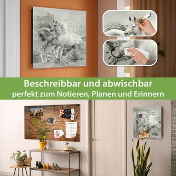 Bringe Ordnung und Eleganz in deinen Eingangsbereich mit dem banjado Schlüsselkasten Motiv Motiv Wilde Pferde SW. Die moderne Schlüsselbox kombiniert funktionales Design mit hochwertiger Verarbeitung und wird so zu einem echten Hingucker in Flur, Büro oder Ferienwohnung. ✅ Stilvolle Schlüsselaufbewahrung mit Glasfront im Motiv Motiv Wilde Pferde SW Der Design-Schlüsselkasten Motiv Motiv Wilde Pferde SW bietet Platz für bis zu 50 Schlüssel, die auf 5 stabilen Reihen mit je 10 Haken übersichtlich verstaut werden. Mit seinen kompakten Maßen von 30 x 30 x 5 cm passt die Schlüsselbox perfekt auch in kleinere Räume. Der schwarz lackierte Stahlkorpus mit rechts angeschlagenem Türscharnier harmoniert mit der Glasfront und fügt sich nahtlos in jedes Wohnambiente ein. Ob als Schlüsselorganizer für Zuhause oder als praktische Lösung für Büros, Praxen und Gewerbe, der banjado Schlüsselkasten sorgt für Ordnung und Übersicht. Dank der magnetischen, mit Kreidestiften beschreibbaren Glasfront kannst du Notizen anheften oder Termine direkt auf der Oberfläche festhalten. Die Schlüsselbox Motiv Motiv Wilde Pferde SW zur Wandmontage wird inklusive Befestigungsmaterial geliefert und ist schnell angebracht. So hast du deine Schlüssel jederzeit griffbereit und zugleich stilvoll verstaut. Mit diesem banjado Schlüsselkasten Motiv Motiv Wilde Pferde SW kombinierst du praktische Aufbewahrung mit stilvollem Wohndesign. Ob privat oder geschäftlich, die Schlüsselbox sorgt für mehr Ordnung, Übersicht und ein wohnliches Ambiente.Vorteile im Überblick