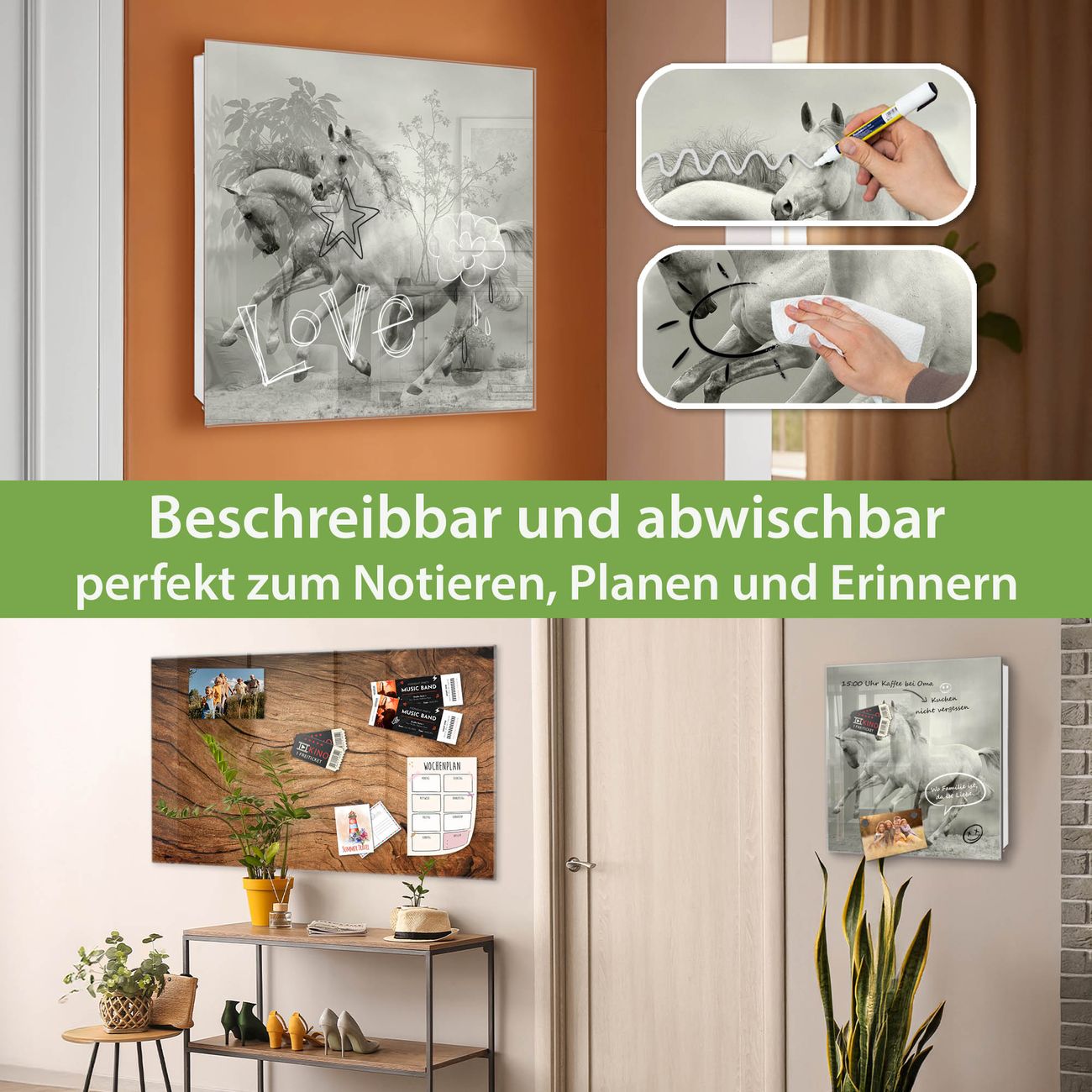 Bringe Ordnung und Eleganz in deinen Eingangsbereich mit dem banjado Schlüsselkasten Motiv Motiv Wilde Pferde SW. Die moderne Schlüsselbox kombiniert funktionales Design mit hochwertiger Verarbeitung und wird so zu einem echten Hingucker in Flur, Büro oder Ferienwohnung. ✅ Stilvolle Schlüsselaufbewahrung mit Glasfront im Motiv Motiv Wilde Pferde SW Der Design-Schlüsselkasten Motiv Motiv Wilde Pferde SW bietet Platz für bis zu 50 Schlüssel, die auf 5 stabilen Reihen mit je 10 Haken übersichtlich verstaut werden. Mit seinen kompakten Maßen von 30 x 30 x 5 cm passt die Schlüsselbox perfekt auch in kleinere Räume. Der weiß lackierte Stahlkorpus mit rechts angeschlagenem Türscharnier harmoniert mit der Glasfront und fügt sich nahtlos in jedes Wohnambiente ein. Ob als Schlüsselorganizer für Zuhause oder als praktische Lösung für Büros, Praxen und Gewerbe, der banjado Schlüsselkasten sorgt für Ordnung und Übersicht. Dank der magnetischen, mit Kreidestiften beschreibbaren Glasfront kannst du Notizen anheften oder Termine direkt auf der Oberfläche festhalten. Die Schlüsselbox Motiv Motiv Wilde Pferde SW zur Wandmontage wird inklusive Befestigungsmaterial geliefert und ist schnell angebracht. So hast du deine Schlüssel jederzeit griffbereit und zugleich stilvoll verstaut. Mit diesem banjado Schlüsselkasten Motiv Motiv Wilde Pferde SW kombinierst du praktische Aufbewahrung mit stilvollem Wohndesign. Ob privat oder geschäftlich, die Schlüsselbox sorgt für mehr Ordnung, Übersicht und ein wohnliches Ambiente.Vorteile im Überblick