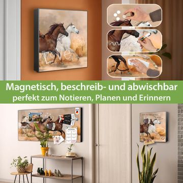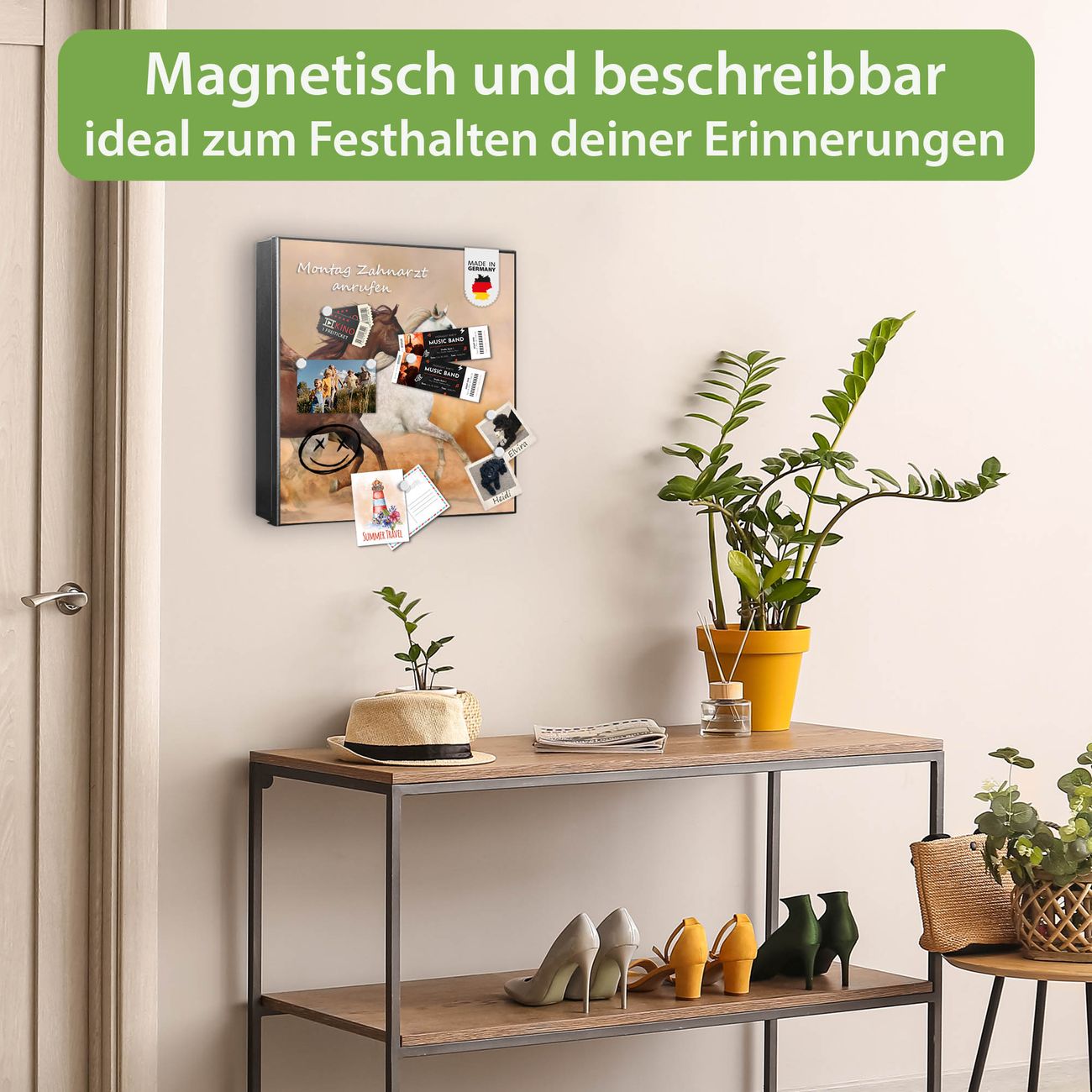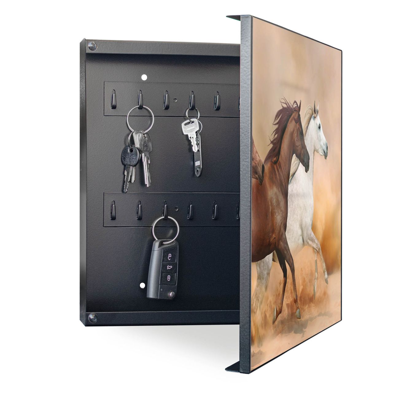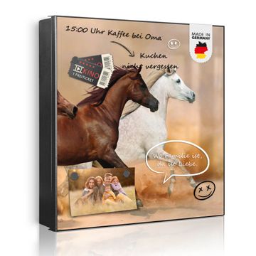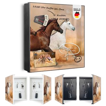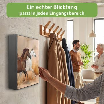 Bringe Ordnung und Eleganz in deinen Eingangsbereich mit dem banjado Schlüsselkasten Motiv Motiv Wilde Pferde. Die moderne Schlüsselbox kombiniert funktionales Design mit hochwertiger Verarbeitung und wird so zu einem echten Hingucker in Flur, Büro oder Ferienwohnung. ✅ Stilvolle Schlüsselaufbewahrung mit Motiv Motiv Wilde Pferde Der Design-Schlüsselkasten Motiv Motiv Wilde Pferde bietet Platz für bis zu 32 Schlüssel, die auf 4 stabilen Reihen mit je 8 Haken übersichtlich verstaut werden. Mit seinen kompakten Maßen von 30 x 30 x 5 cm passt die Schlüsselbox perfekt auch in kleinere Räume. Der schwarz lackierte Stahlkorpus mit rechts angeschlagenem Türscharnier harmoniert mit gedruckten Folie auf der Front und fügt sich nahtlos in jedes Wohnambiente ein. Ob als Schlüsselorganizer für Zuhause oder als praktische Lösung für Büros, Praxen und Gewerbe, der banjado Schlüsselkasten sorgt für Ordnung und Übersicht. Dank der magnetischen, mit Kreidestiften beschreibbaren Folie auf der Front kannst du Notizen anheften oder Termine direkt auf der Oberfläche festhalten. Die Schlüsselbox Motiv Motiv Wilde Pferde zur Wandmontage wird inklusive Befestigungsmaterial geliefert und ist schnell angebracht. So hast du deine Schlüssel jederzeit griffbereit und zugleich stilvoll verstaut. Mit diesem banjado Schlüsselkasten Motiv Motiv Wilde Pferde kombinierst du praktische Aufbewahrung mit stilvollem Wohndesign. Ob privat oder geschäftlich, die Schlüsselbox sorgt für mehr Ordnung, Übersicht und ein wohnliches Ambiente.Vorteile im Überblick