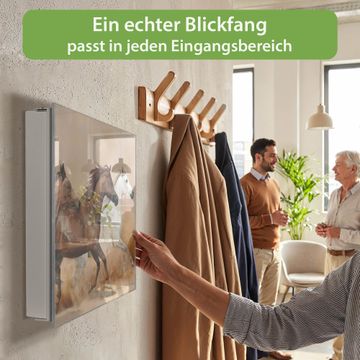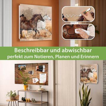 Bringe Ordnung und Eleganz in deinen Eingangsbereich mit dem banjado Schlüsselkasten Motiv Motiv Wilde Pferde. Die moderne Schlüsselbox kombiniert funktionales Design mit hochwertiger Verarbeitung und wird so zu einem echten Hingucker in Flur, Büro oder Ferienwohnung. ✅ Stilvolle Schlüsselaufbewahrung mit Glasfront im Motiv Motiv Wilde Pferde Der Design-Schlüsselkasten Motiv Motiv Wilde Pferde bietet Platz für bis zu 50 Schlüssel, die auf 5 stabilen Reihen mit je 10 Haken übersichtlich verstaut werden. Mit seinen kompakten Maßen von 30 x 30 x 5 cm passt die Schlüsselbox perfekt auch in kleinere Räume. Der weiß lackierte Stahlkorpus mit rechts angeschlagenem Türscharnier harmoniert mit der Glasfront und fügt sich nahtlos in jedes Wohnambiente ein. Ob als Schlüsselorganizer für Zuhause oder als praktische Lösung für Büros, Praxen und Gewerbe, der banjado Schlüsselkasten sorgt für Ordnung und Übersicht. Dank der magnetischen, mit Kreidestiften beschreibbaren Glasfront kannst du Notizen anheften oder Termine direkt auf der Oberfläche festhalten. Die Schlüsselbox Motiv Motiv Wilde Pferde zur Wandmontage wird inklusive Befestigungsmaterial geliefert und ist schnell angebracht. So hast du deine Schlüssel jederzeit griffbereit und zugleich stilvoll verstaut. Mit diesem banjado Schlüsselkasten Motiv Motiv Wilde Pferde kombinierst du praktische Aufbewahrung mit stilvollem Wohndesign. Ob privat oder geschäftlich, die Schlüsselbox sorgt für mehr Ordnung, Übersicht und ein wohnliches Ambiente.Vorteile im Überblick