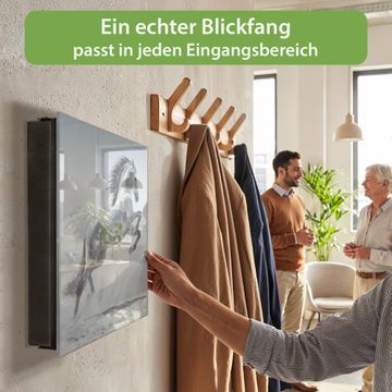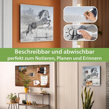 Bringe Ordnung und Eleganz in deinen Eingangsbereich mit dem banjado Schlüsselkasten Motiv Motiv Wildes Pferd. Die moderne Schlüsselbox kombiniert funktionales Design mit hochwertiger Verarbeitung und wird so zu einem echten Hingucker in Flur, Büro oder Ferienwohnung. ✅ Stilvolle Schlüsselaufbewahrung mit Glasfront im Motiv Motiv Wildes Pferd Der Design-Schlüsselkasten Motiv Motiv Wildes Pferd bietet Platz für bis zu 50 Schlüssel, die auf 5 stabilen Reihen mit je 10 Haken übersichtlich verstaut werden. Mit seinen kompakten Maßen von 30 x 30 x 5 cm passt die Schlüsselbox perfekt auch in kleinere Räume. Der schwarz lackierte Stahlkorpus mit rechts angeschlagenem Türscharnier harmoniert mit der Glasfront und fügt sich nahtlos in jedes Wohnambiente ein. Ob als Schlüsselorganizer für Zuhause oder als praktische Lösung für Büros, Praxen und Gewerbe, der banjado Schlüsselkasten sorgt für Ordnung und Übersicht. Dank der magnetischen, mit Kreidestiften beschreibbaren Glasfront kannst du Notizen anheften oder Termine direkt auf der Oberfläche festhalten. Die Schlüsselbox Motiv Motiv Wildes Pferd zur Wandmontage wird inklusive Befestigungsmaterial geliefert und ist schnell angebracht. So hast du deine Schlüssel jederzeit griffbereit und zugleich stilvoll verstaut. Mit diesem banjado Schlüsselkasten Motiv Motiv Wildes Pferd kombinierst du praktische Aufbewahrung mit stilvollem Wohndesign. Ob privat oder geschäftlich, die Schlüsselbox sorgt für mehr Ordnung, Übersicht und ein wohnliches Ambiente.Vorteile im Überblick