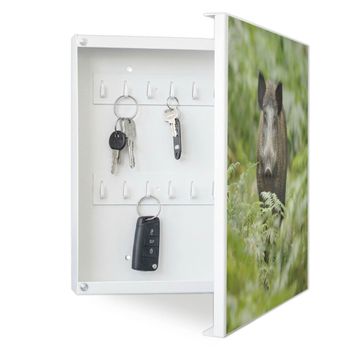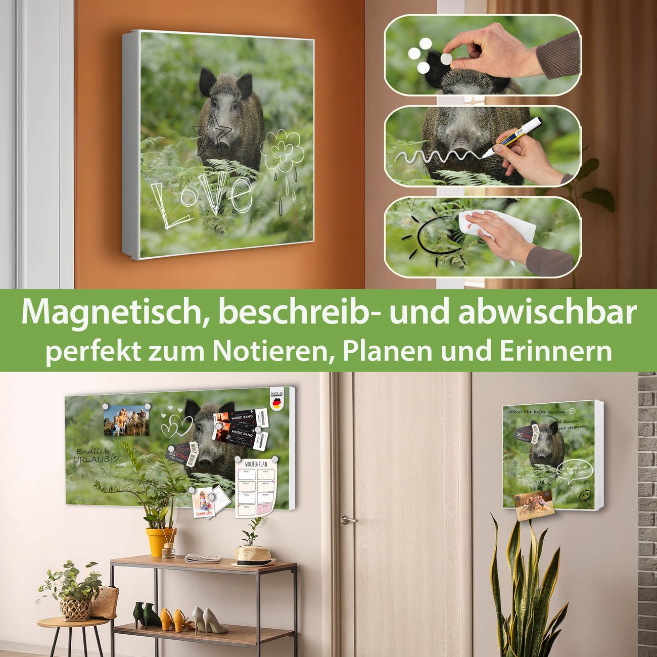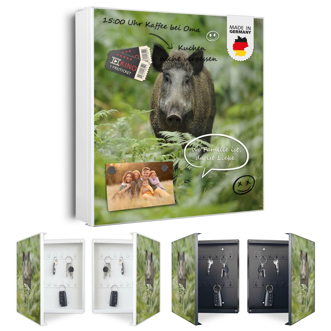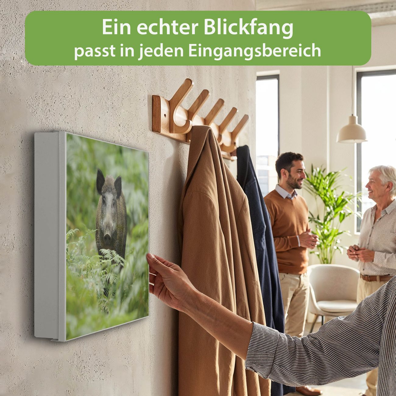 Bringe Ordnung und Eleganz in deinen Eingangsbereich mit dem banjado Schlüsselkasten Motiv Motiv Wildschwein. Die moderne Schlüsselbox kombiniert funktionales Design mit hochwertiger Verarbeitung und wird so zu einem echten Hingucker in Flur, Büro oder Ferienwohnung. ✅ Stilvolle Schlüsselaufbewahrung mit Motiv Motiv Wildschwein Der Design-Schlüsselkasten Motiv Motiv Wildschwein bietet Platz für bis zu 32 Schlüssel, die auf 4 stabilen Reihen mit je 8 Haken übersichtlich verstaut werden. Mit seinen kompakten Maßen von 30 x 30 x 5 cm passt die Schlüsselbox perfekt auch in kleinere Räume. Der weiß lackierte Stahlkorpus mit rechts angeschlagenem Türscharnier harmoniert mit gedruckten Folie auf der Front und fügt sich nahtlos in jedes Wohnambiente ein. Ob als Schlüsselorganizer für Zuhause oder als praktische Lösung für Büros, Praxen und Gewerbe, der banjado Schlüsselkasten sorgt für Ordnung und Übersicht. Dank der magnetischen, mit Kreidestiften beschreibbaren Folie auf der Front kannst du Notizen anheften oder Termine direkt auf der Oberfläche festhalten. Die Schlüsselbox Motiv Motiv Wildschwein zur Wandmontage wird inklusive Befestigungsmaterial geliefert und ist schnell angebracht. So hast du deine Schlüssel jederzeit griffbereit und zugleich stilvoll verstaut. Mit diesem banjado Schlüsselkasten Motiv Motiv Wildschwein kombinierst du praktische Aufbewahrung mit stilvollem Wohndesign. Ob privat oder geschäftlich, die Schlüsselbox sorgt für mehr Ordnung, Übersicht und ein wohnliches Ambiente.Vorteile im Überblick